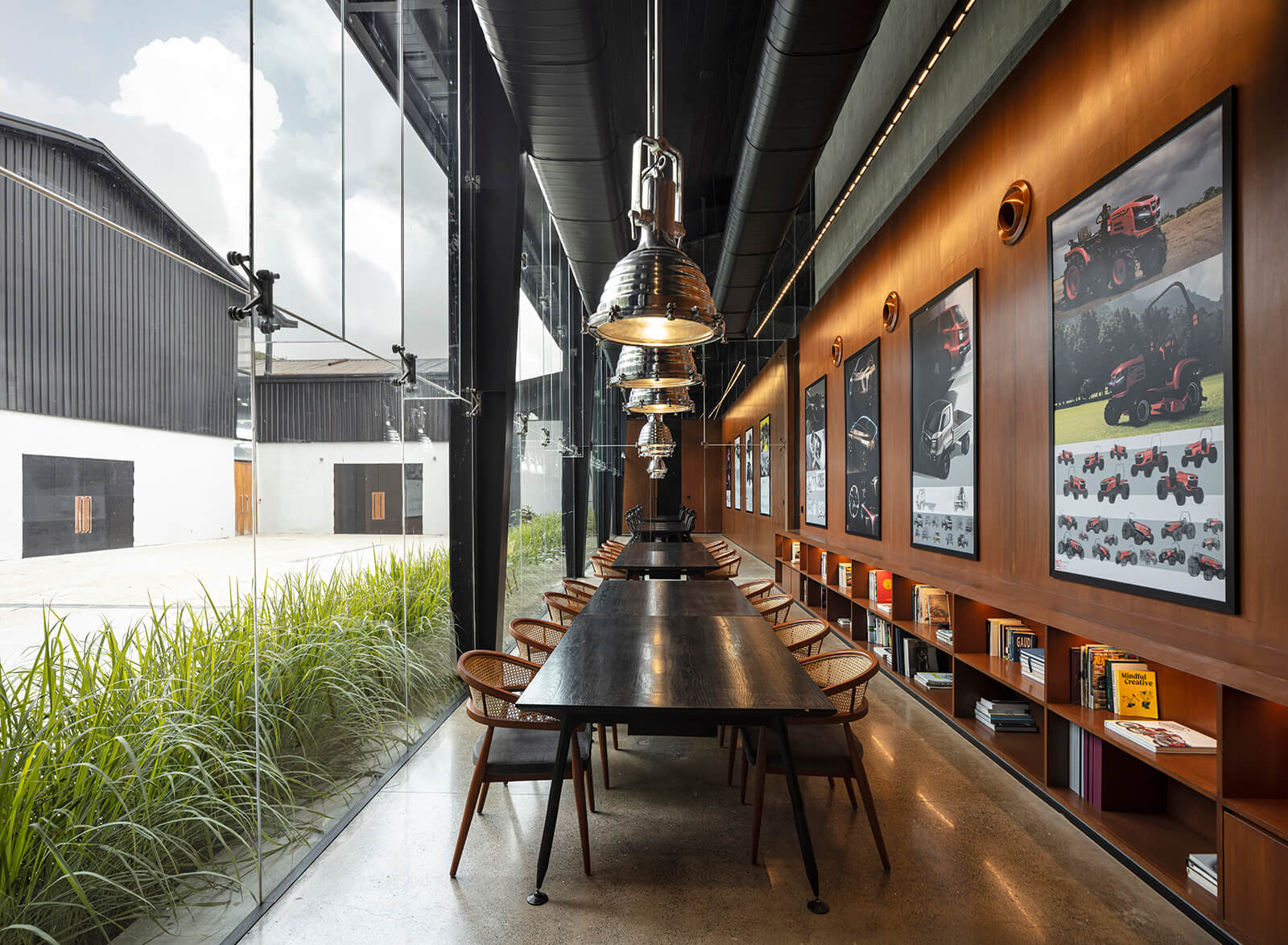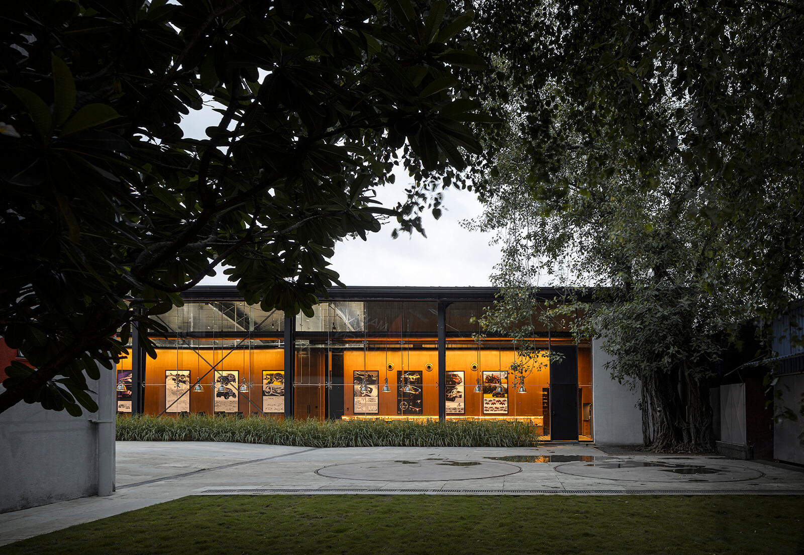 Despite its technological core, the studio retains a sense of intimacy. Wooden panelling, cane chairs, ship-style lights and lemongrass planters temper the industrial demeanour. The cement-plastered walls bear the marks of handwork while the concrete floors reveal the traces of their making. “High-tech innovation remains grounded in human craft. All partition walls are held at 4.3 metres rather than rising to the full 7.5-metre height, ensuring the black-painted roof reads as one continuous canopy unifying both structures. This gesture proves critical: it makes the two phases—despite the 12-year gap and different technological approaches—feel like one coherent whole,” details the press release.