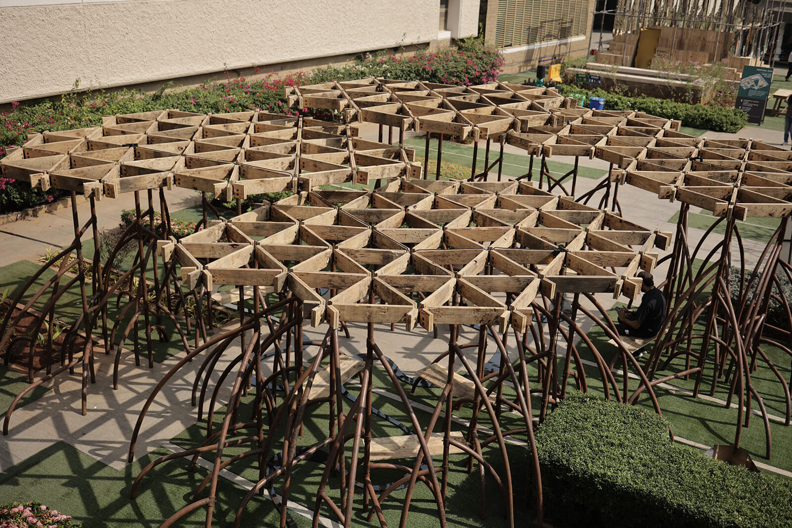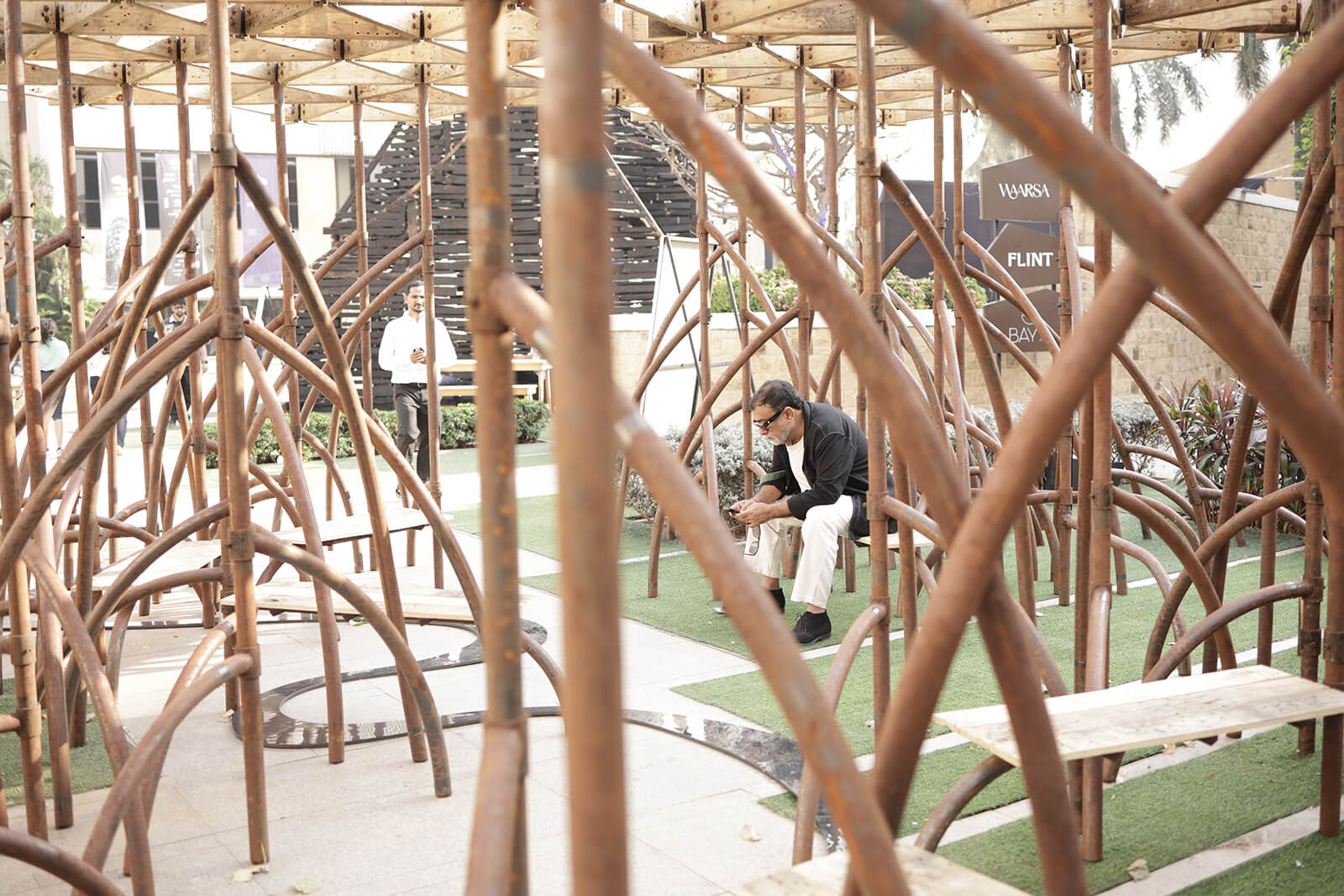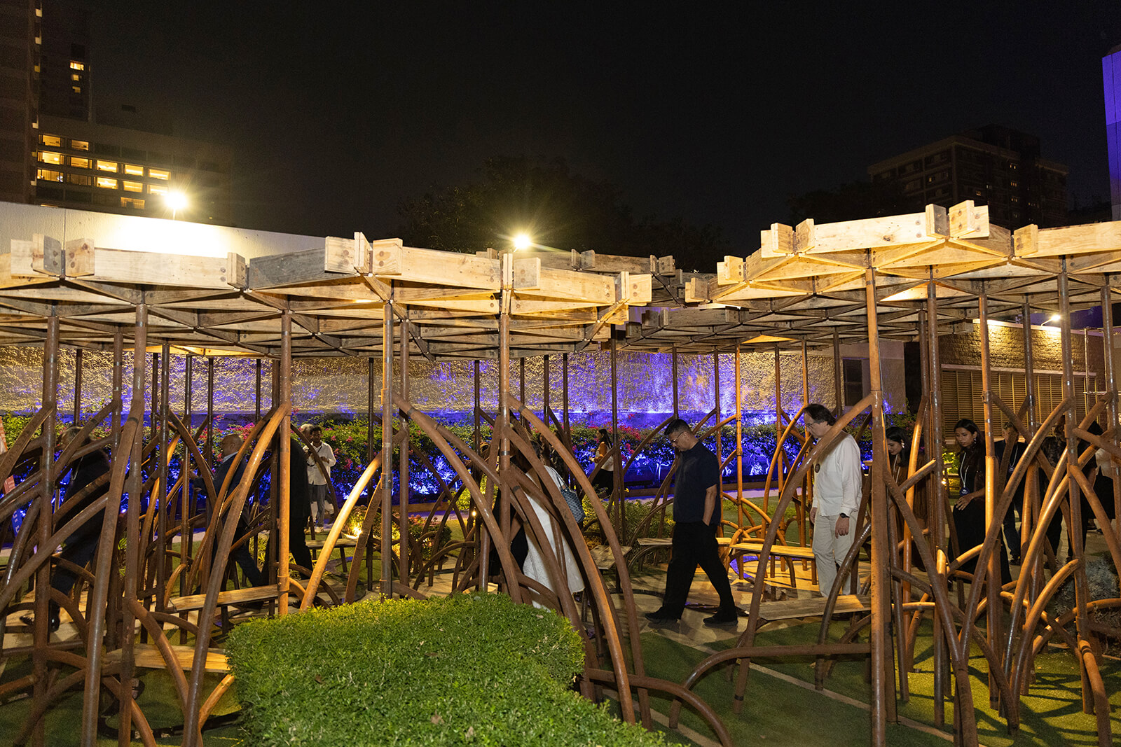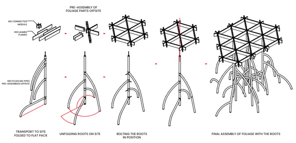 The project is generously supported by Mr Arun Vadehra & Family—patrons behind the Vadehra Art Gallery, New Delhi and Arari Interiors, and elicits the literal in its title. The pavilion design is then an attempt by the Indian architects to reflect on the ecosystems that are intrinsic to a city defined by flux, whilst offering a place to pause, a space to question and a setting through which to create awareness towards an increasingly fragile ecosystem. The pavilion's architecture, nimble in conception, takes on the rhizomatic form of the mangrove and its enmeshed structures. A network of roots and branches creates a configuration that is porous—possessing its own organic structural logic—that encourages coming together. The design team, led by the studio’s principal architects, Khushnu Panthaki Hoof and Sönke Hoof, describes its structure as ‘a gentle labyrinth’ with the trees’ limbs transfigured into benches and canopies.