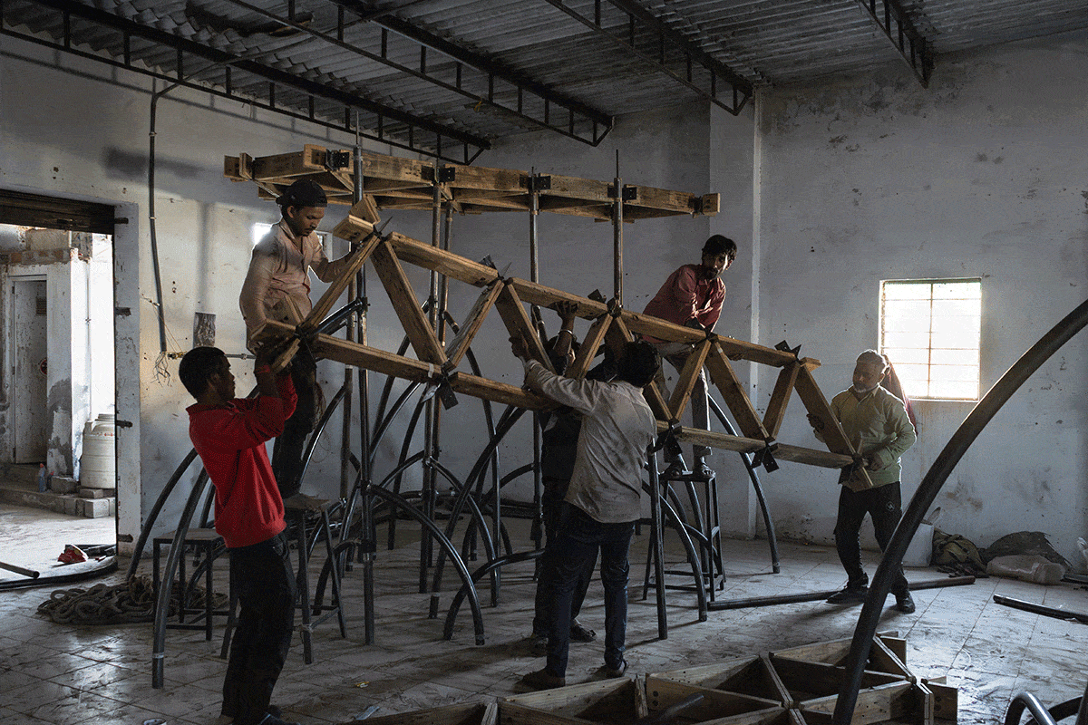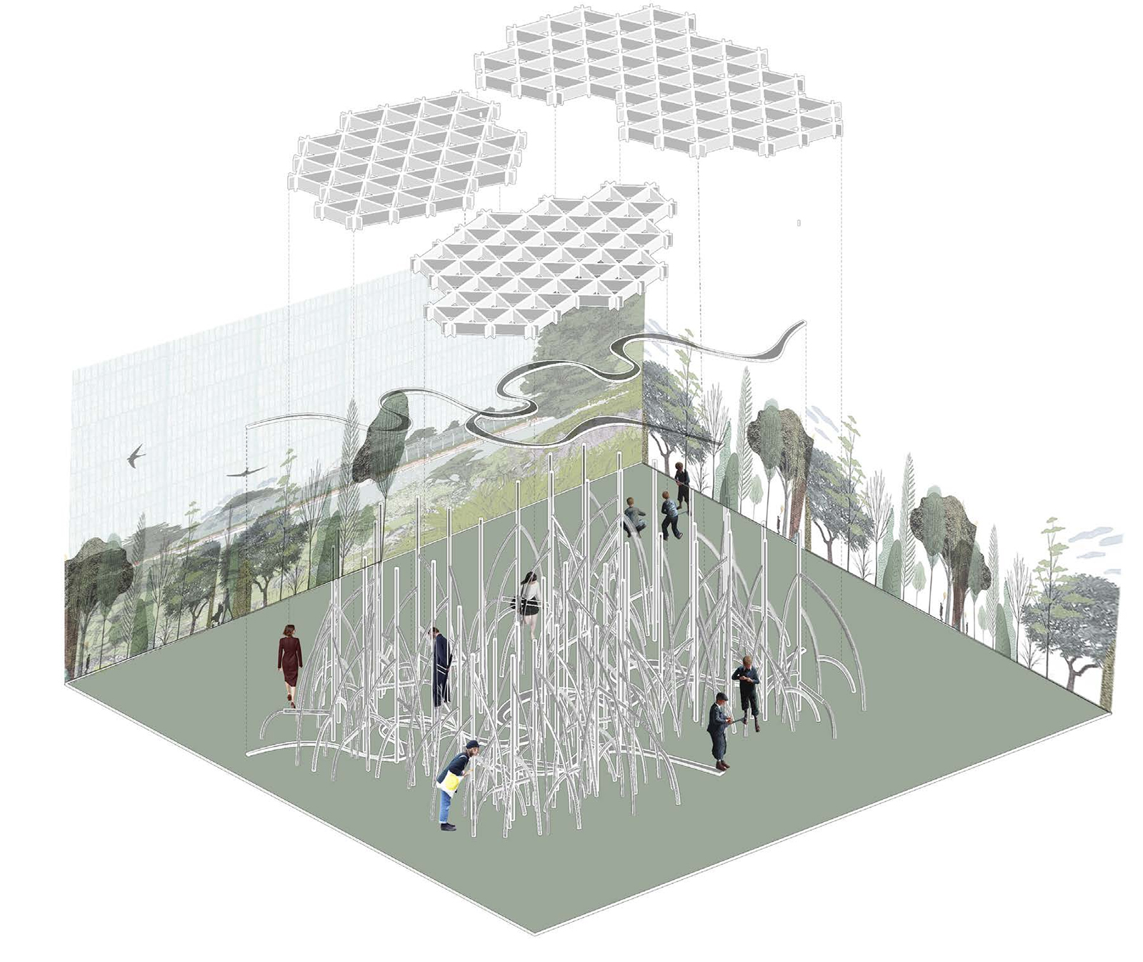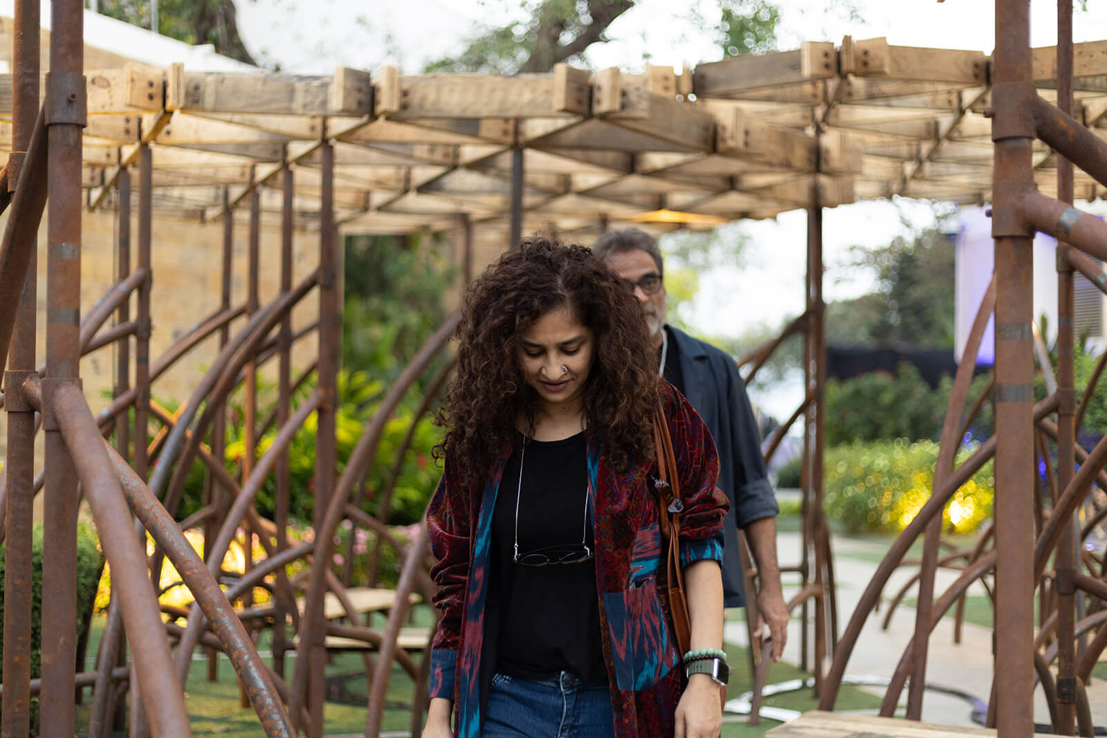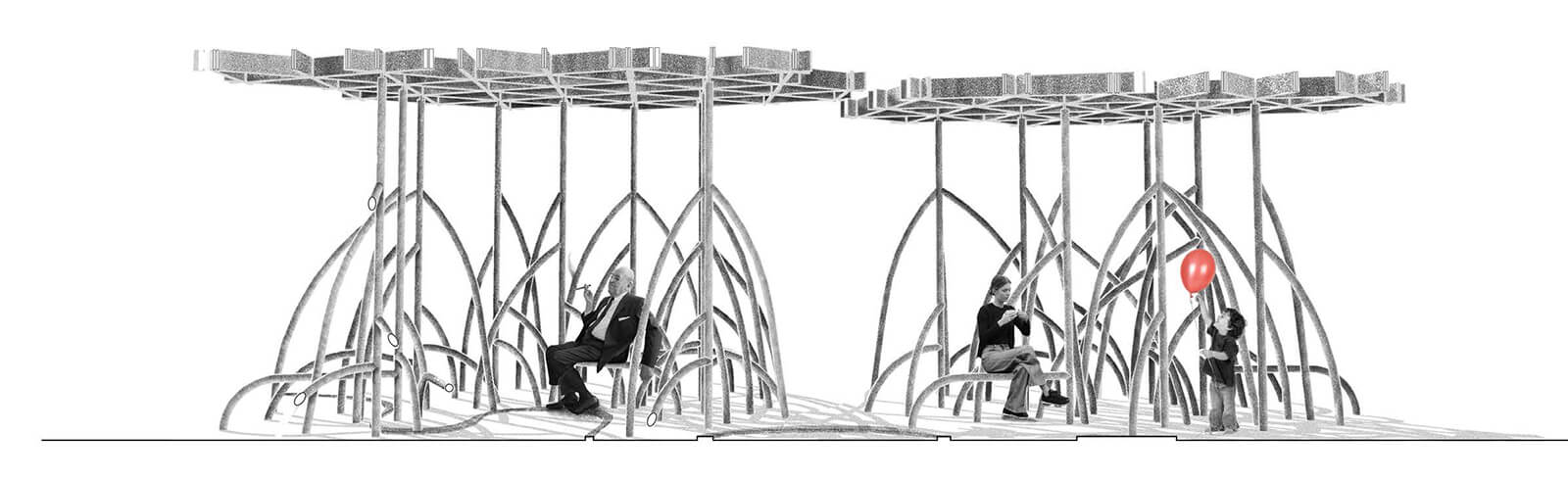 The project is generously supported by Mr Arun Vadehra & Family—patrons behind the Vadehra Art Gallery, New Delhi and Arari Interiors, and elicits the literal in its title. The pavilion design is then an attempt by the Indian architects to reflect on the ecosystems that are intrinsic to a city defined by flux, whilst offering a place to pause, a space to question and a setting through which to create awareness towards an increasingly fragile ecosystem. The pavilion's architecture, nimble in conception, takes on the rhizomatic form of the mangrove and its enmeshed structures. A network of roots and branches creates a configuration that is porous—possessing its own organic structural logic—that encourages coming together. The design team, led by the studio’s principal architects, Khushnu Panthaki Hoof and Sönke Hoof, describes its structure as ‘a gentle labyrinth’ with the trees’ limbs transfigured into benches and canopies.