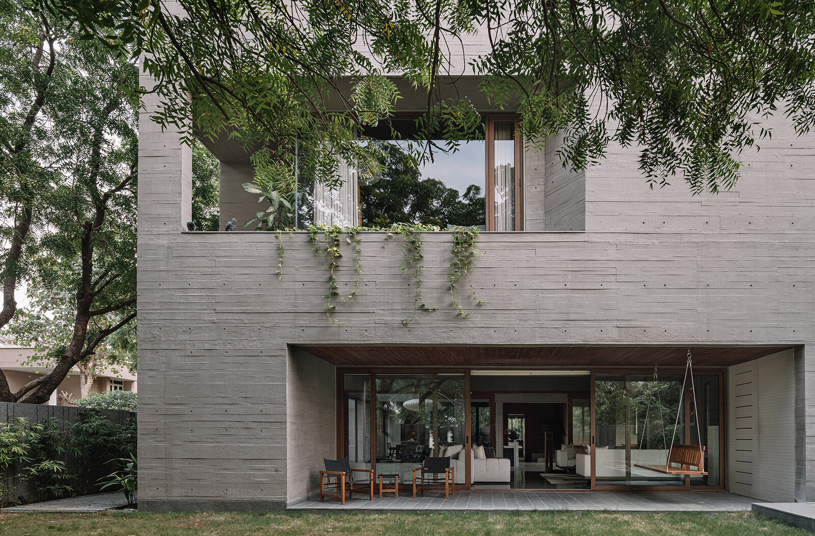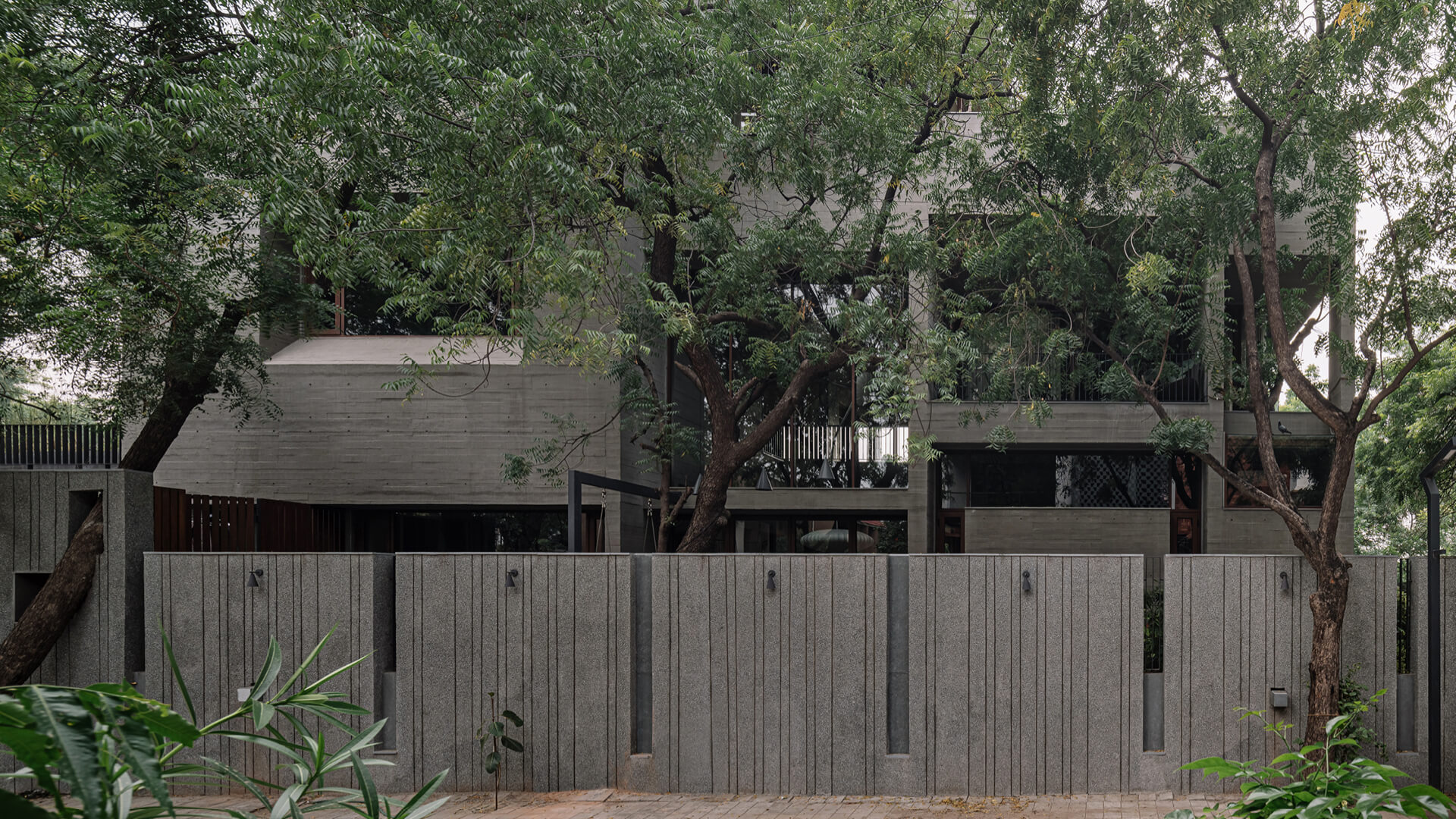 Located in a quiet residential neighbourhood of Ahmedabad, India, the home presents a brutalist form, textured and softened by its landscape. Cast in wooden-strip concrete that captures the tactile grain of bark, the building appears both sculpted and cocooned in greenery. Square punctures and deep chamfered openings animate the facade, filtering daylight into the interiors while intertwining enclosure and foliage. The client—an Indian family seeking a contemporary yet grounded home—sought spaces that breathe in light and breeze and a home that preserves the natural integrity of the place it sits in.