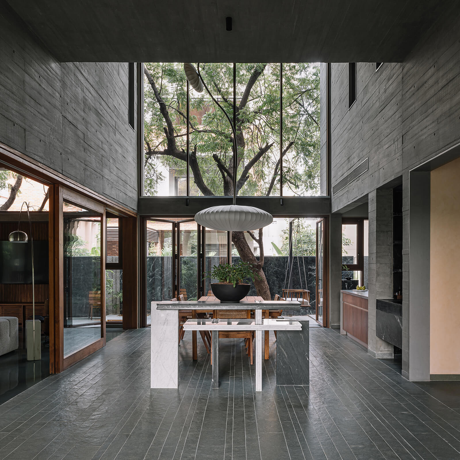The trees make their presense known at the edge of the property. Rather than cutting through trunks, the boundary walls of the home bend to let them stand. At the entrance, a low branch arcs toward the lobby, making entry an encounter with nature. Inside, a long concrete corridor punctured with square openings filters natural light and frames fragments of encircling foliage. Raw in finish yet animated by light and shadow, this passage establishes the home’s rhythm where nature is not a background but the co-author of its architecture.