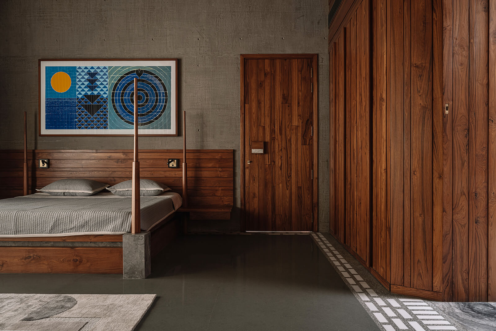 The bedrooms continue the balance between individuality and material restraint. The master bedroom combines terrazzo and concrete with a custom four-poster bed of stone pedestals and wooden posts while the other bedrooms interpret this language through graphite and sage tones, each reflecting the personality of its occupants.