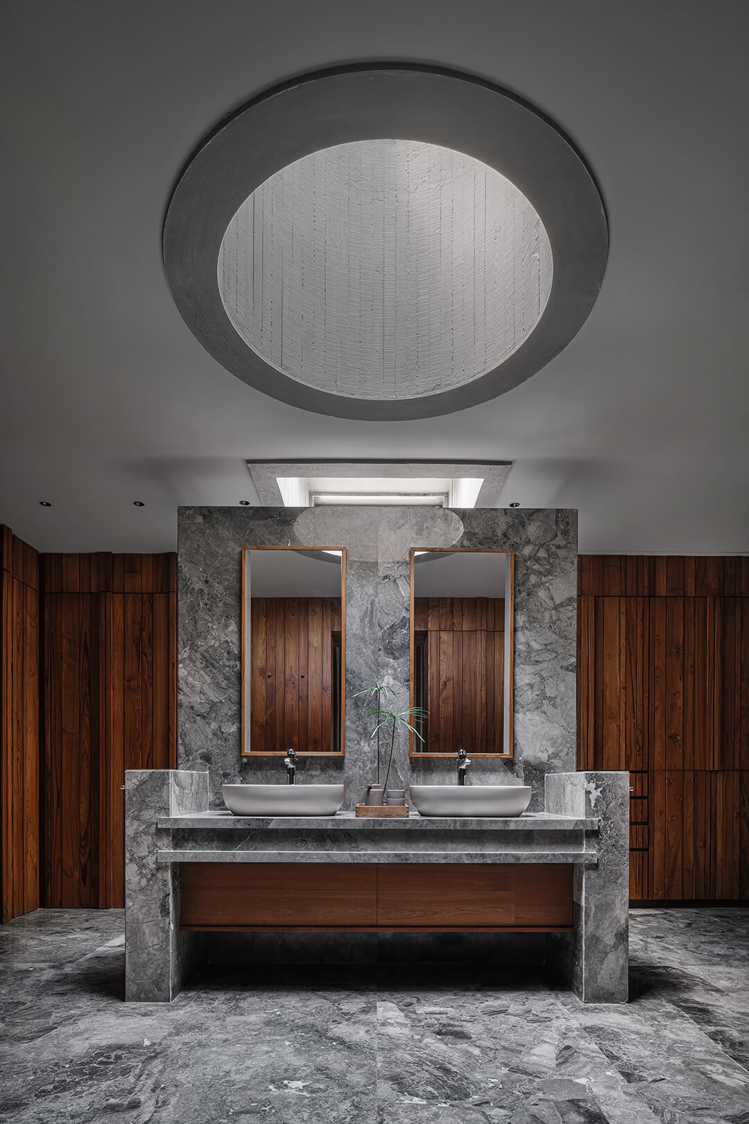 Sustainability is seamlessly embedded in the residential architecture, not as an afterthought. The house takes advantage of orientation for daylight and cross-ventilation, while deeply recessed openings, cavity walls and laminated glazing minimise heat gain. The same care extends to the interiors where bathrooms and utility spaces use natural light and crafted concrete detailing to maintain the home’s tactile coherence. A solar roof over the gazebo supplies much of the household’s energy needs and lime plaster replaces synthetic paints. Materials were used resourcefully in construction, where leftover timber became furniture and marble offcuts were transformed into a console, ensuring minimal waste.