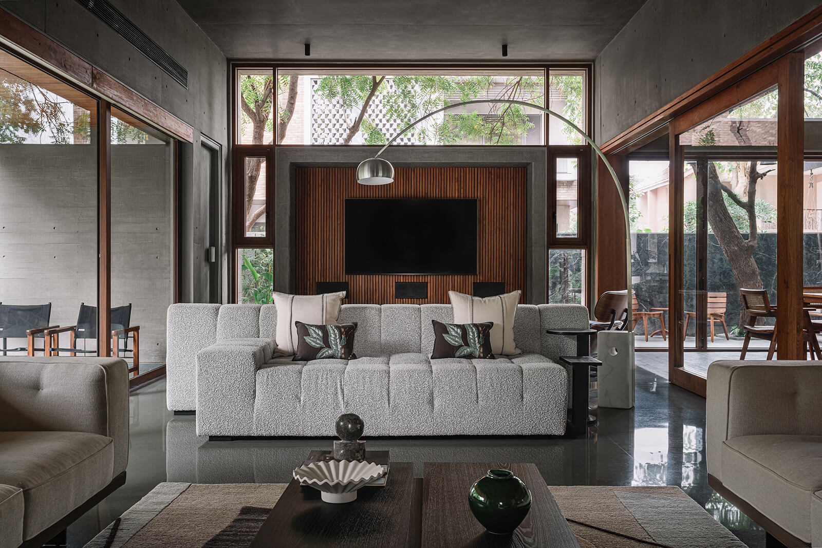 Inside, the material palette remains restrained with the use of lime plaster walls, ply-cast concrete and grey Kota stone. Flooring changes finish according to function, where leathered surfaces in the central bay continue the outdoor plank pattern, while polished stone maintains continuity elsewhere. Against this quiet base, furniture and details emerge with clarity. The dining area is centred on a custom wooden table with rosewood detailing, its geometry echoing the linearity of stone and concrete. Chairs in teak and wicker and a suspension lamp designed with Andlabs, an Ahmedabad-based product and lighting design studio, add warmth to the cool tonality of concrete and stone. The living room is arranged in two clusters: one informal, anchored by a sectional sofa and an Eames lounge chair under a Flos lamp; the other more formal, with teak panelling and a Jaipur Rugs piece grounding the setting. Each area maintains its character yet remains oriented to views of trees through ribbon windows.