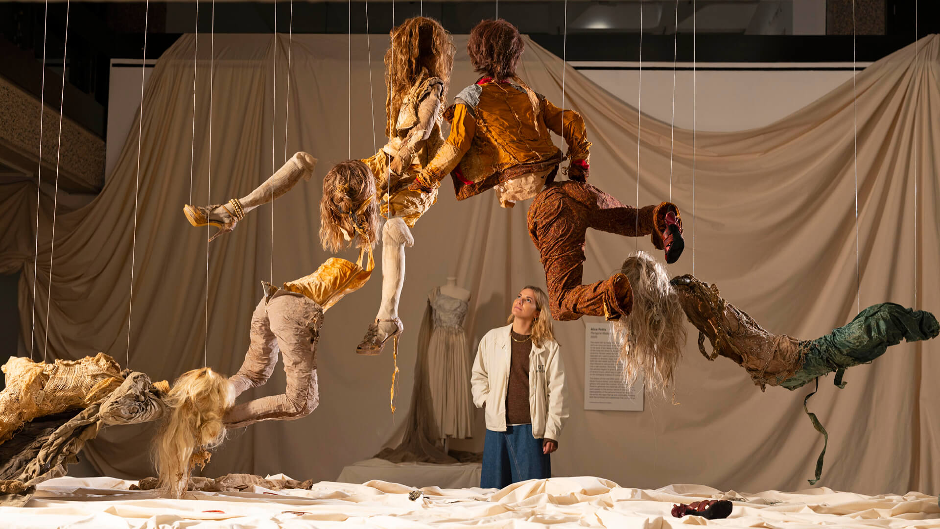 The exhibition design similarly mirrors this idea of dishevelment and neglect leading to ruin (and possible resurrection). The galleries for the show become an 'off-white' cube, if you will, conceived by Rotterdam-based Studio Dennis Vanderbroeck. Fabric nonchalantly drapes the railings of the first floor, falling messily onto the floor below. The pedestals on which the mannequins are arranged feature peeling paint, dried mud and crumbling plaster. The walls of the rooms are grimy, covered in unknown brown substances and chipped tiles, while soiled shoes hang off pipes. On the floor below are the displays by emerging creatives, including installations by designers such as Paolo Carzana, Alice Potts, Michaela Stark, Solitude Studios, Elena Velez and Yaz XL. These practices comment not only on notions of perfection and luxury embedded within the industry, but indict these assumed beliefs within systems that perpetuate wasteful, excessive lifestyles that are slowly degrading the planet.