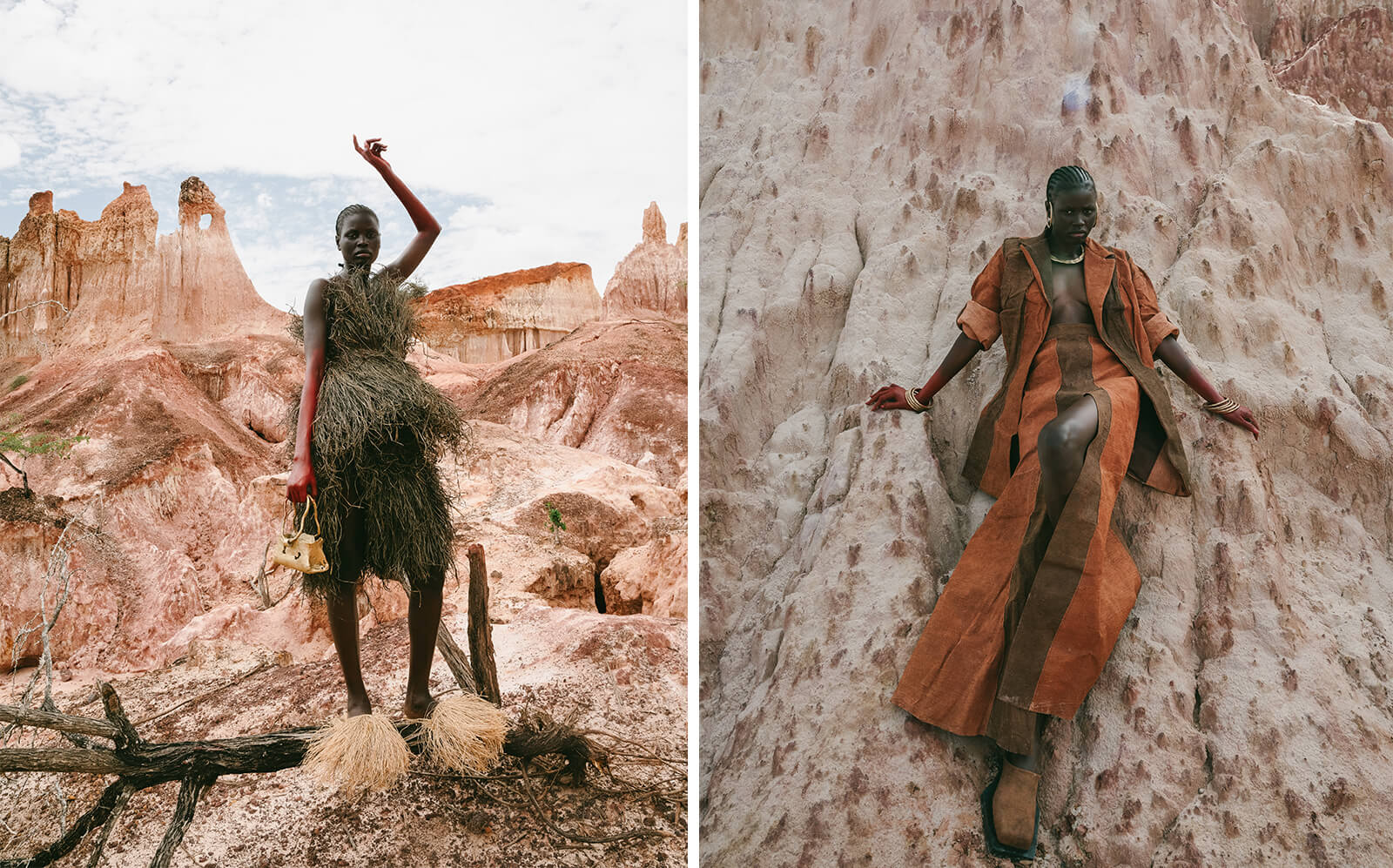 For instance, Bubu Ogisi’s recent creations for IAMISIGO, a Nigerian fashion label, emphasise the use of natural materials, often considered 'not trendy' in Africa. In reviving traditional techniques of craftsmanship with unconventional materials like plastic, Ogisi's Nigeria-based label hopes to revitalise connections to traditional heritage and kinships with the land that were destroyed by colonialism. It’s a design philosophy that is especially critical in a country that is treated as a dumping ground for the waste from the Global North. Similarly, Paolo Carzana’s three-season narrative Trilogy of Hope explores ideas of slowness and mindful consumption with handcrafted, naturally dyed garments made of repurposed materials. A return to nature—material rather than metaphoric—is also depicted by Solitude Studio's works in Dirty Looks. Referencing the understanding of Denmark’s bogs as a site of fertility and good luck offerings in the Iron Age, the designers process the fabric used for the garments by submerging it in mud and allowing it to be consumed by microorganisms.