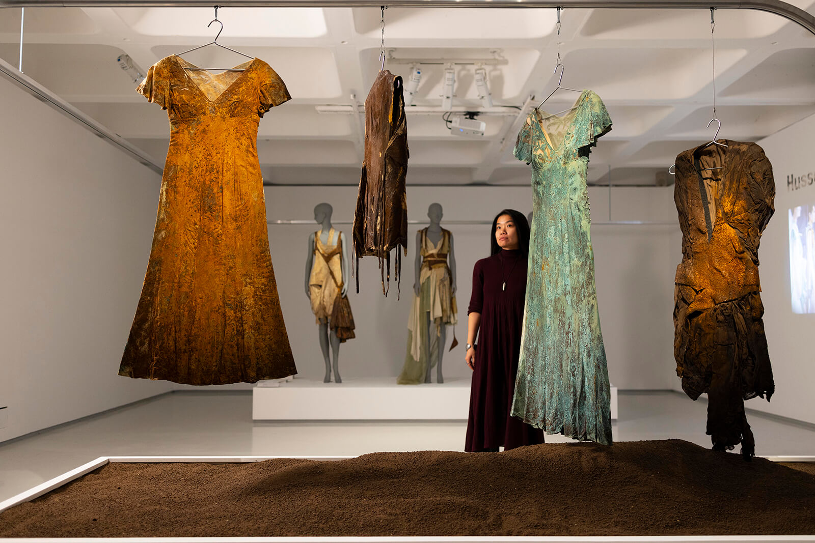 One of the first displays in the exhibition is Husein Chalayan's 1993 graduate show, The Tangent Flows. Burying the garments he’d designed along with iron fillings in a friend’s London backyard gave the dresses a distinctive rusted appearance, highlighting the idea that our garments are alive, that they are part of the cycle of ruination and renewal. Seven pieces from the show hang in tatters in a textile installation, too fragile to be put on mannequins. Rather than dirt as surface application, Chalayan’s treatment of fabric hints at a desire to experiment with new production techniques that lean towards discussions of sustainability in design practise. From this provocation, the show traces different interpretations (artifice as well as authentic) of muck, from Westwood's then subversive Nostalgia of Mud campaign to Chinese designer Ma Ke’s exploration of 'Mother Earth’, where the designer used several recycled pieces of polyester cloth for the garments.