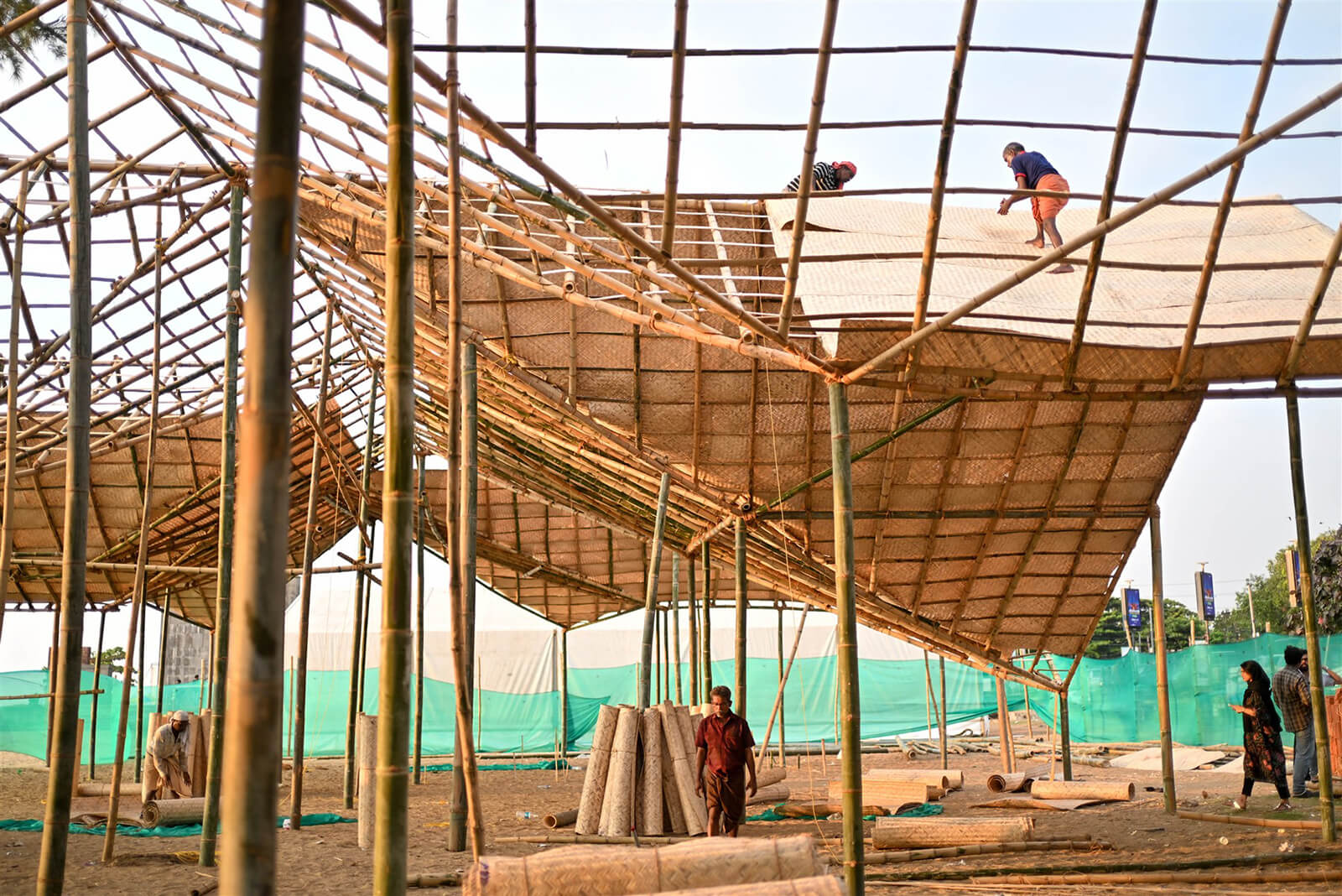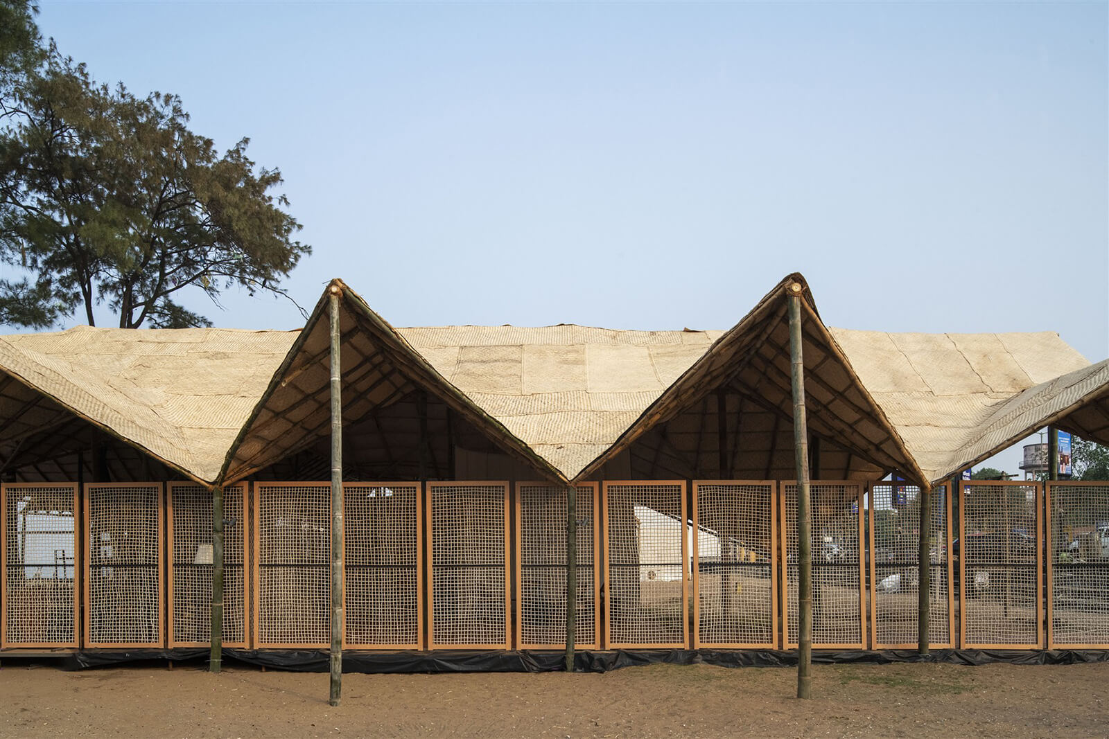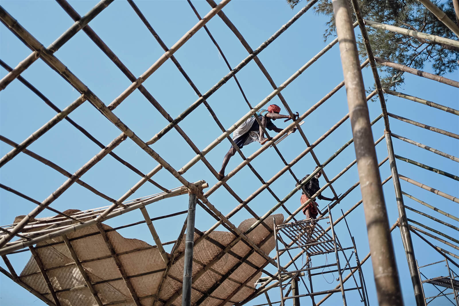 The structural system, in addition to keeping the assembly lightweight and quick to assemble, rendered the pavilion as a porous membrane embracing the pleasant coastal breeze and serene ocean views. As a physical manifestation of its cross-cultural history, the pavilion design referenced its Indo-German legacy through its material palette, derived from the weaving and tile industries of the Commonwealth Trust established by the Basel Missionaries, while its construction techniques served as a showcase of the local crafts and labour traditions of Kerala.