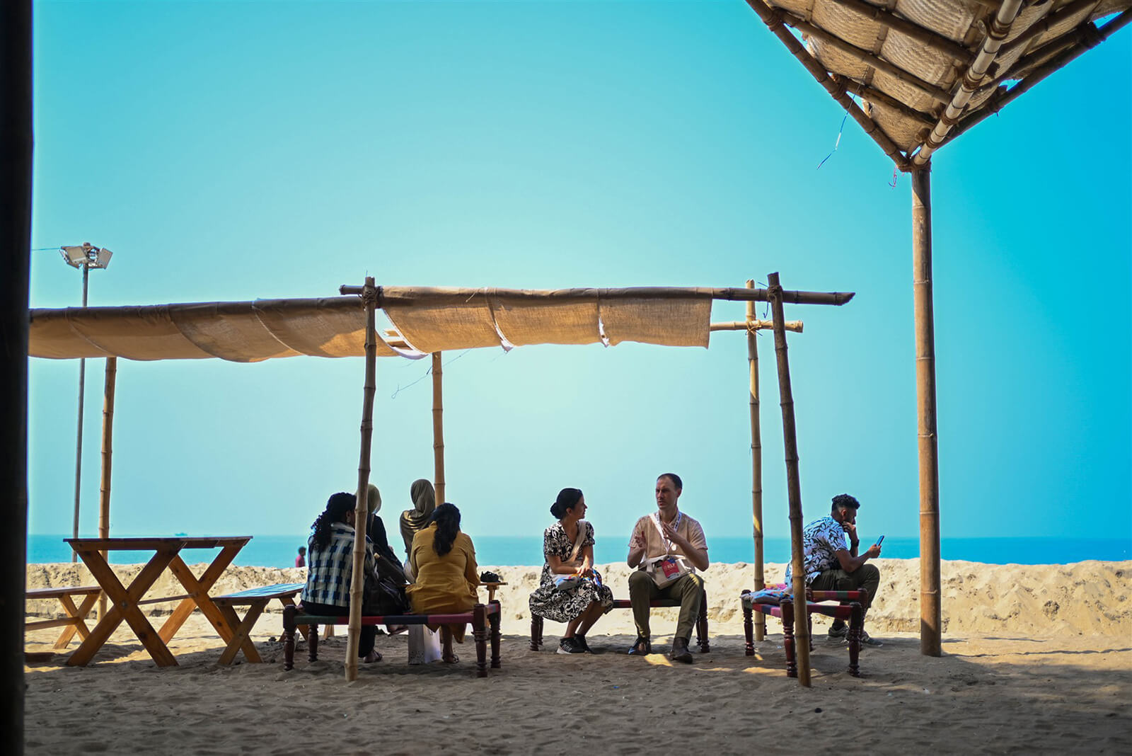 Translating memory into form, the architects imagined the pavilion as a temporary beach house produced by blending the two cultures. The spatial program was derived from traditional German residential and socio-cultural typologies, sheltered in local structural systems and construction techniques from Kerala. The spaces within included a living-cum-reading area; a listening room for Vinyl-collections from the record and music discovery store On the Jungle Floor; a Berlin kitchen—a spatial typology from old German apartments for informal gathering and eating—curated by food stylist Sanskriti Bist; a screen printing station for hosting Atelier Prati’s printmaking studio; administrative areas and spaces for casual interactions such as a courtyard, salon, lounge and a 'Biergarten' (beer garden) by the sea.