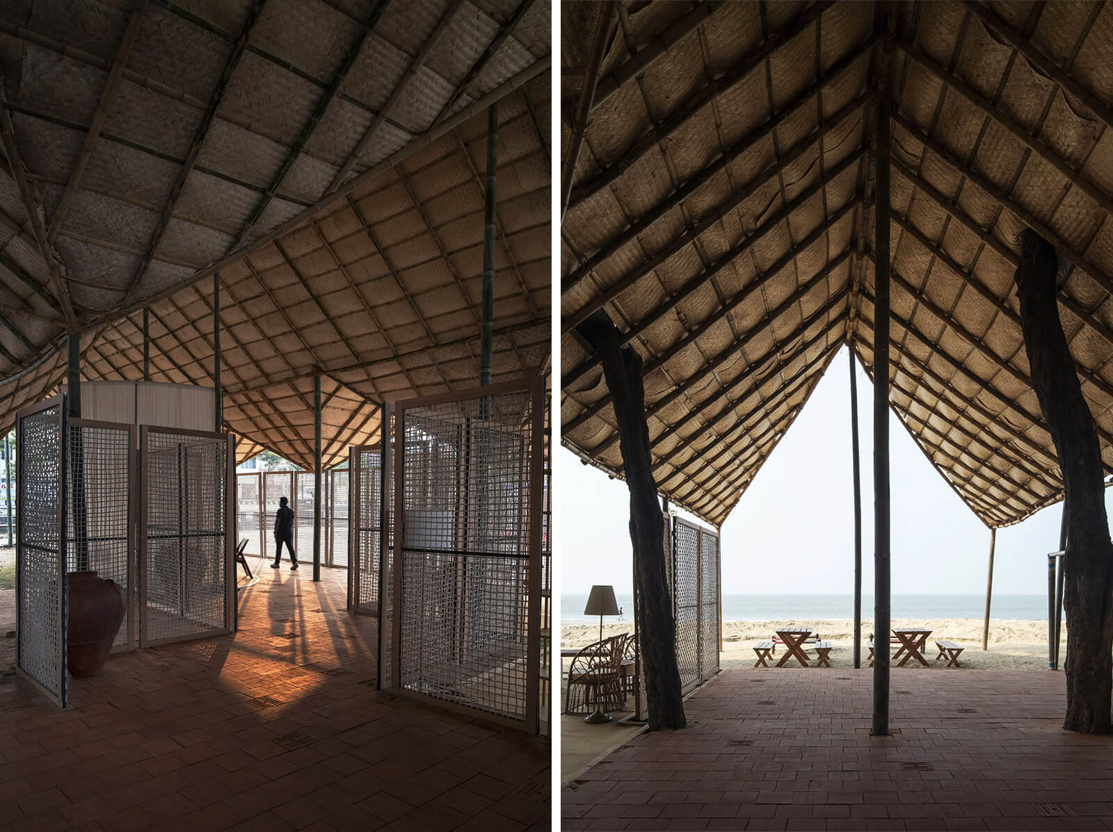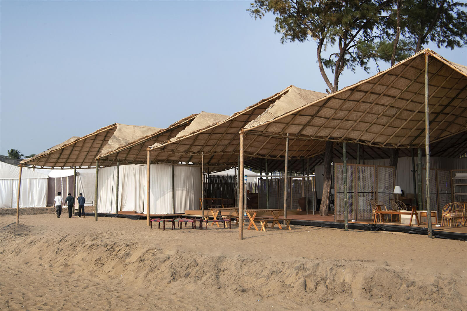 Structurally, the pavilion’s design embraced its ephemerality and the sensitivity of its location. Supported on a bamboo frame embedded in the sand bed, the roof form appeared to replicate the waves of the Arabian Sea, its perennial chaos simplified into triangular wave patterns of woven paaya (dried grass mats) sheets. The diverse programming in the interiors was modulated through lattice screens made of cotton ropes using the ‘plain weave’ technique and drapes made from the local Calico cloth. The terracotta flooring inside the pavilion gradually graded into the sand bed as one moved towards the sea, before ultimately terminating against a small dike created on the beach to prevent the incoming seawater from flooding the pavilion area.