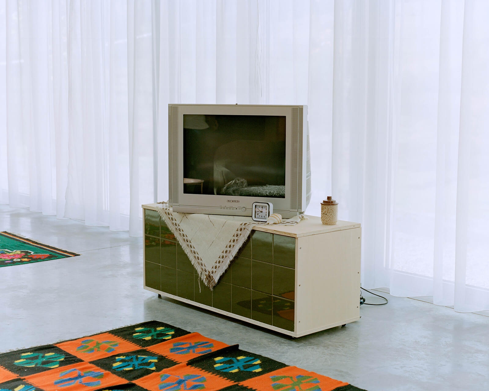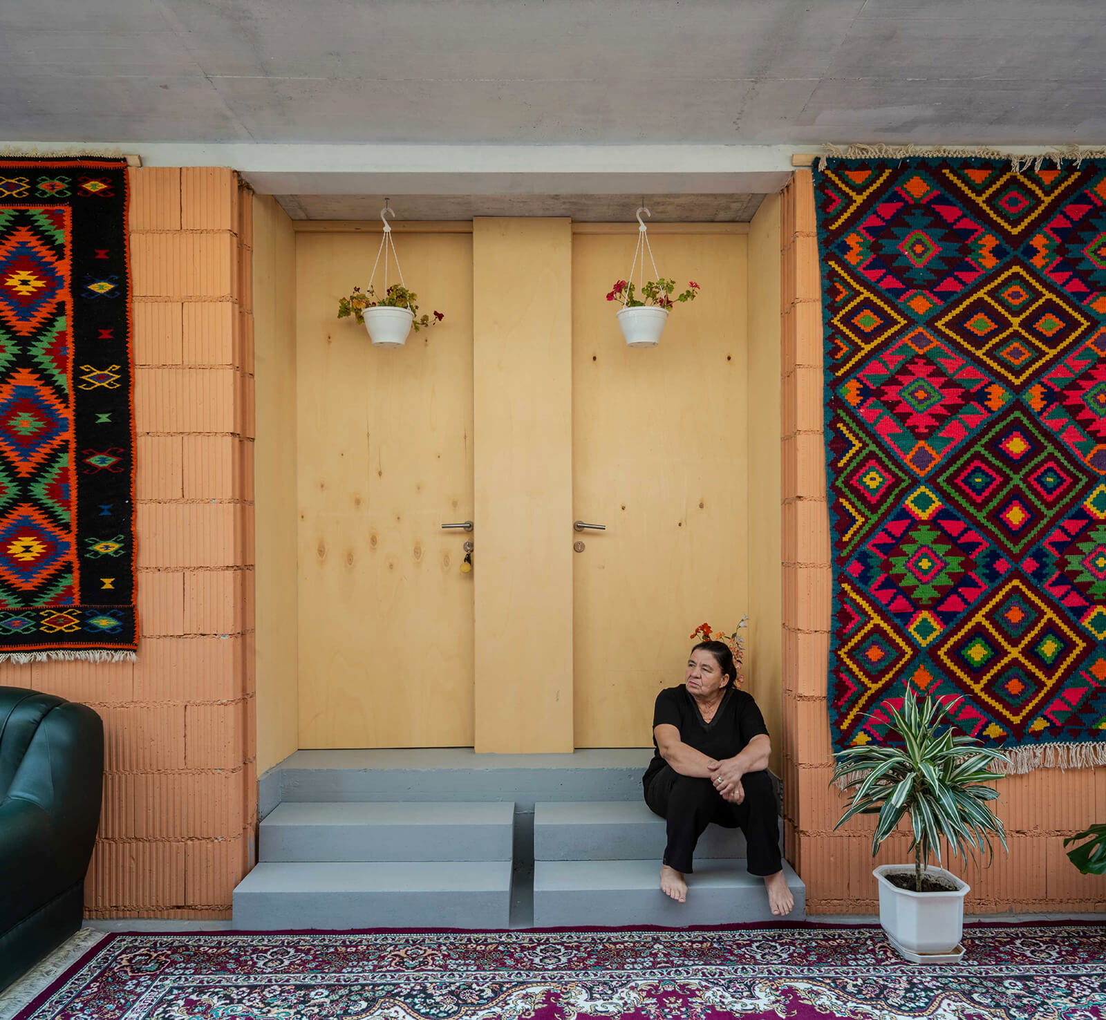 But as the images reveal, everyday life pervades the interiors. Carpets hang off the walls; there is coffee set out, just in case of visitors; an old LCD TV sits on top of a sleek tiled console, upending the expected image of the ‘perfect’ minimalist interior design. Apart from the private rooms and common living area that ensure both privacy and shared experiences, the designers equipped the different rooms with ample cabinetry and self-contained kitchenettes for a degree of independence. Restricted from creating a basement due to the lack of funds, a 26-metre-long multifunctional room on top of the common area serves various needs — from food storage to hosting additional residents. Constructed as a space truss and concealed by Shahbazi’s vibrant facade, it was inspired by the traditional typology of pastoral storage. “Working with repetition of domestic elements and combining them with design efforts, the project aimed to create a new type of household,” the team elaborates in the project text.