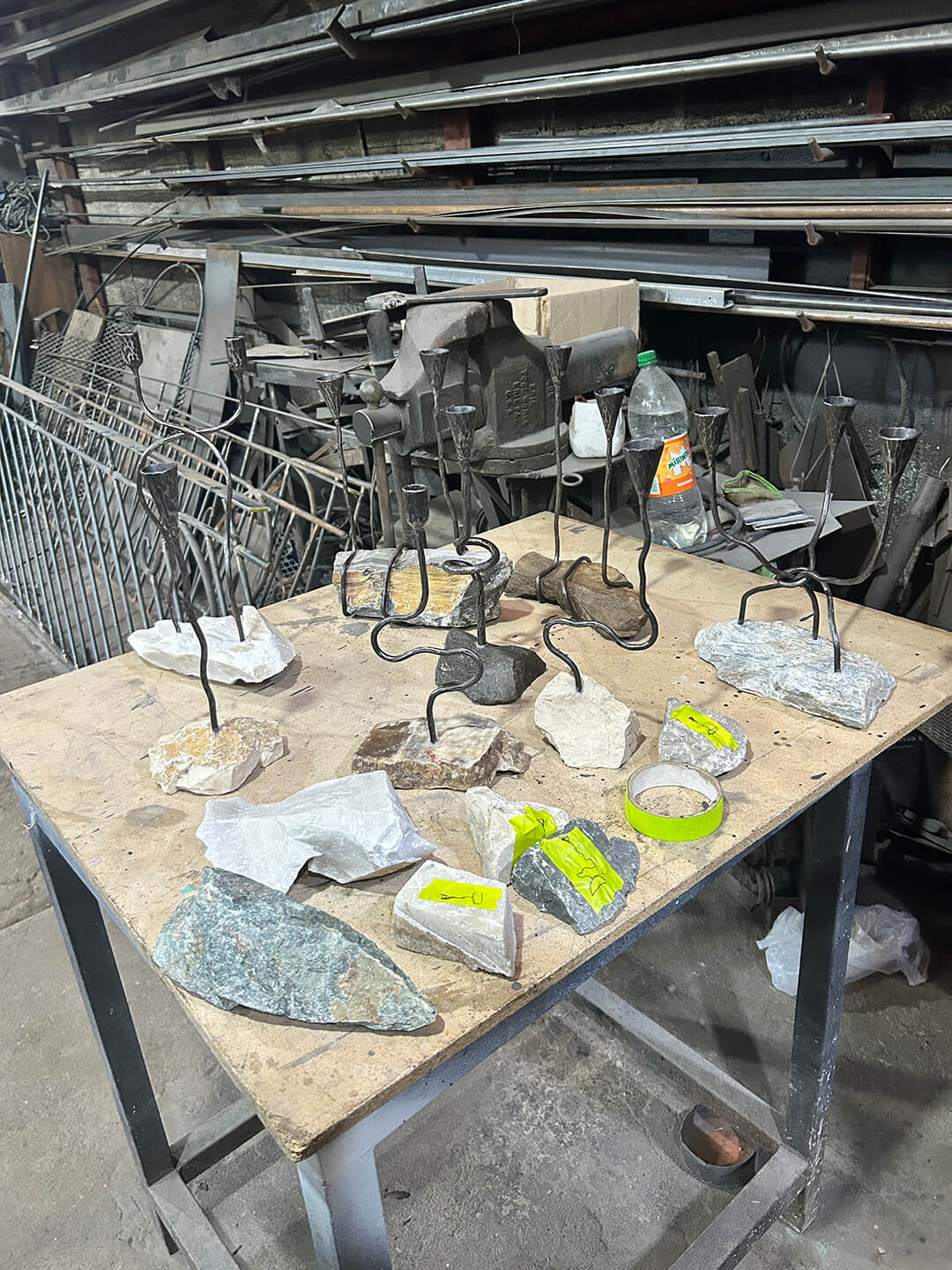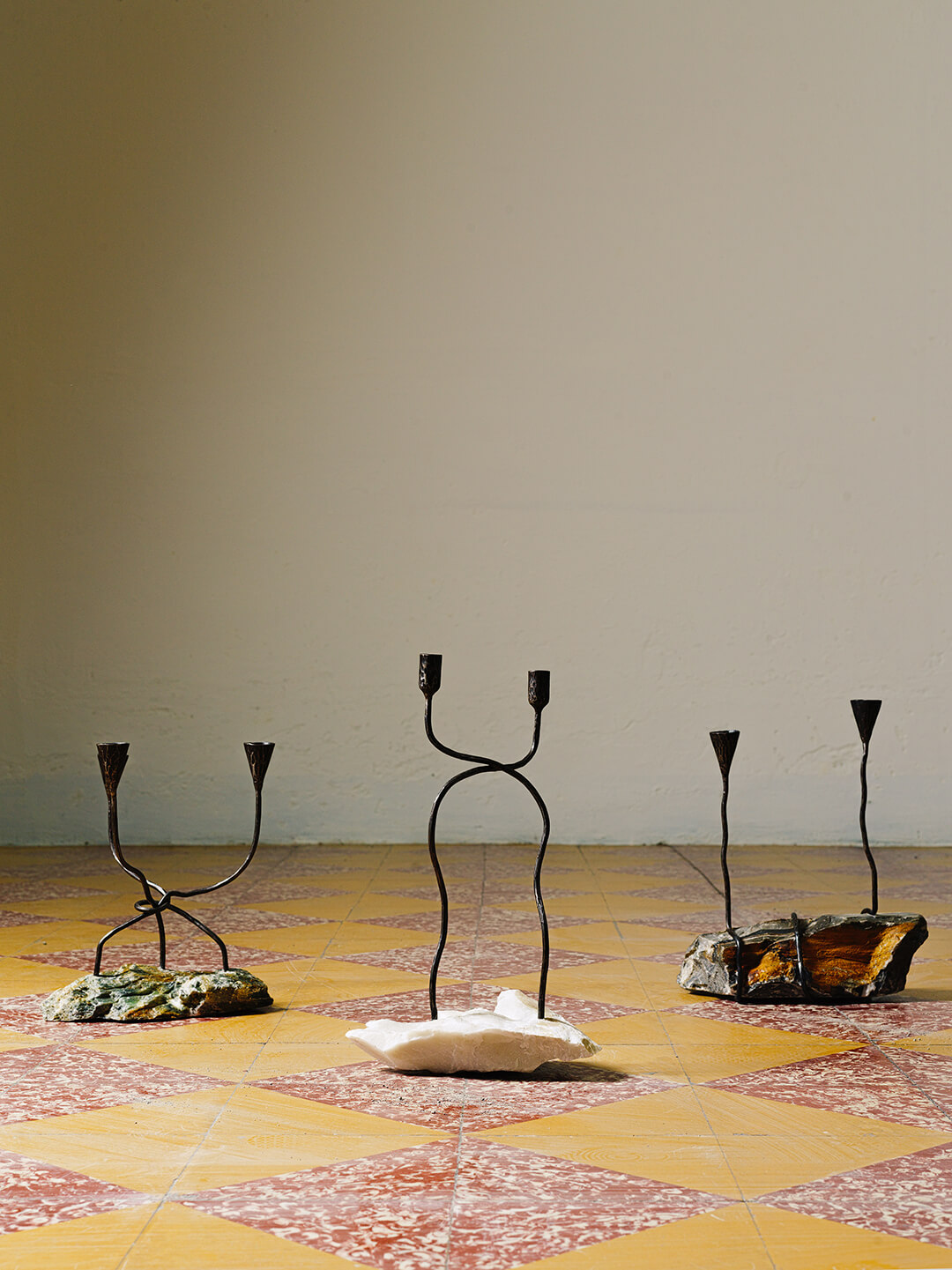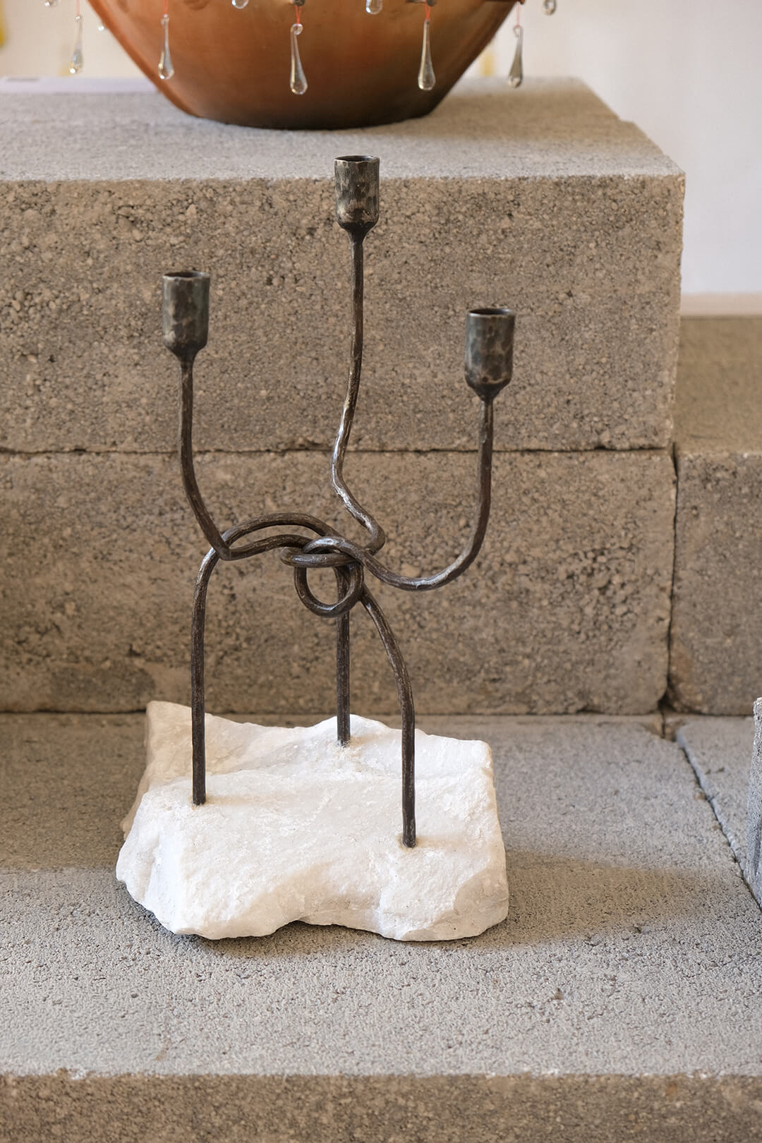 The No hay luz sin sombra candleholders shift the narrative inward, toward the solitude of life abroad. Forged by Alonzo Toscano, an ironworker based in Antigua, each piece unites iron with stone or marble to embody the contradictions of distance. One of these forms a knot in metal, the gesture of a throat closing on unspoken words. Another balances white marble against black iron, contrasting purity and weight. The series speaks of those who endure invisibly—the undocumented and the unheard, whose silence still glows like a hidden flame.