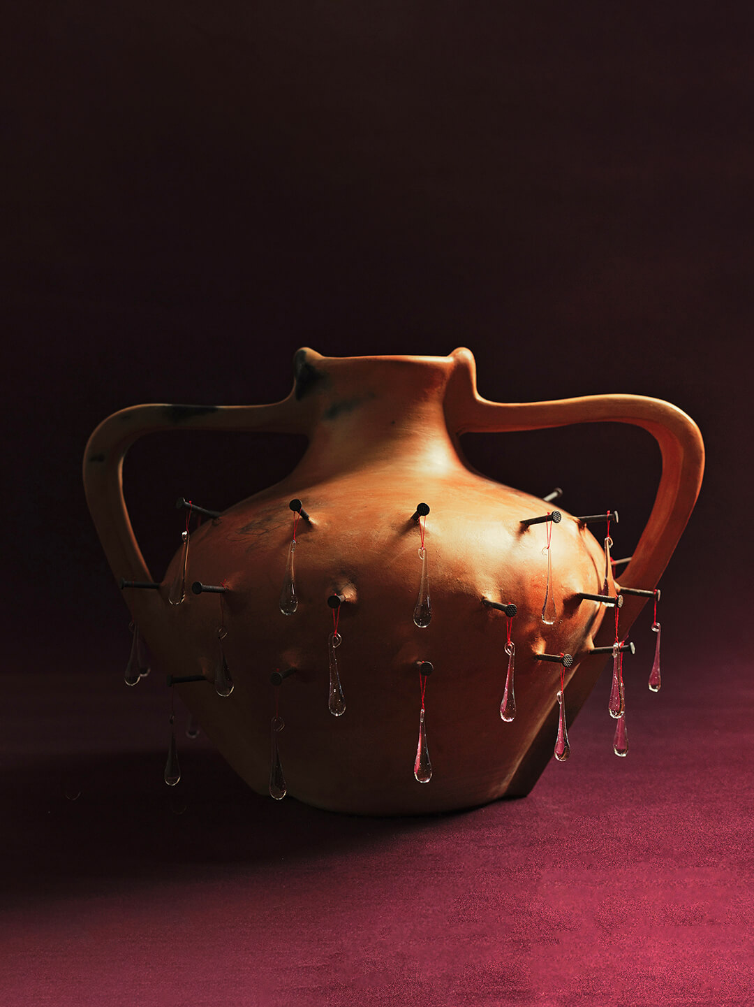 At the collection’s emotional centre lies Tierras Prometidas, a series of works that translates the realities of migration into tangible form. It begins with Sudor Silente, a trio of clay vessels fired in open flame and pierced with iron nails from which hang droplets of blown glass. Each drop, described by Nada Duele as a ‘suspended breath of sweat’, honours the quiet labour that sustains craftsmanship. The red clay retains the marks of fire and touch, reminding us that every handmade object is also a record of endurance. For the designers, these materials hold shape as much as emotion.