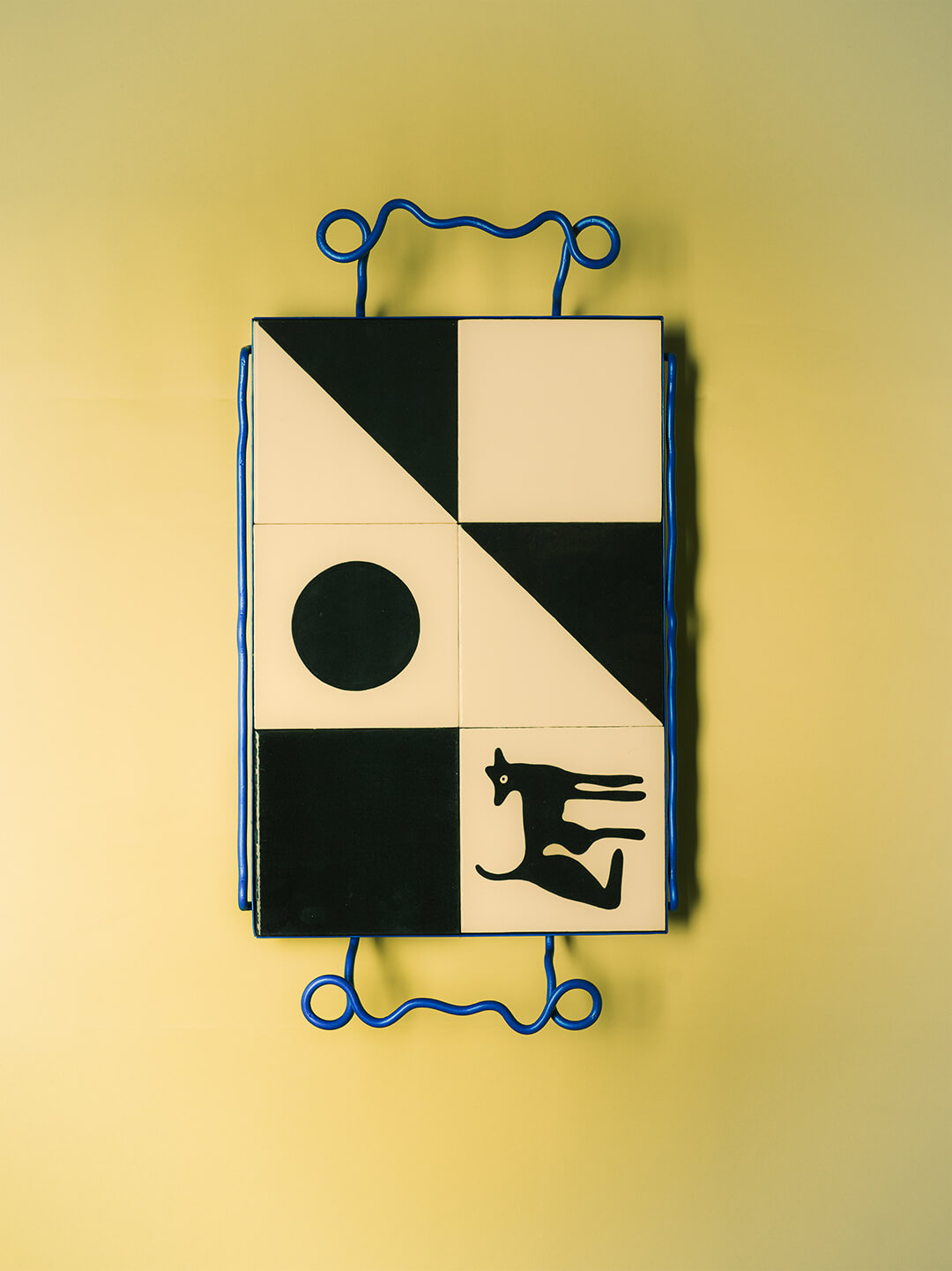 The journey continues in Cruzar no es flotar and Desierto de Sonora. Forged in iron and ceramic tiles, these pieces depict the perilous crossings between Guatemala, Mexico and the United States. A painted coyote, which is both animal and guide, floats within a blue iron shaped like the Río Grande, the river that marks the border between Mexico and the US. Nearby, a table design framed in terracotta-coloured iron shows fragments of the Sonoran Desert, a landscape of risk and resolve. Together, they trace the human cost of movement, the thin line between hope and danger that often seeks to articulate migration.
