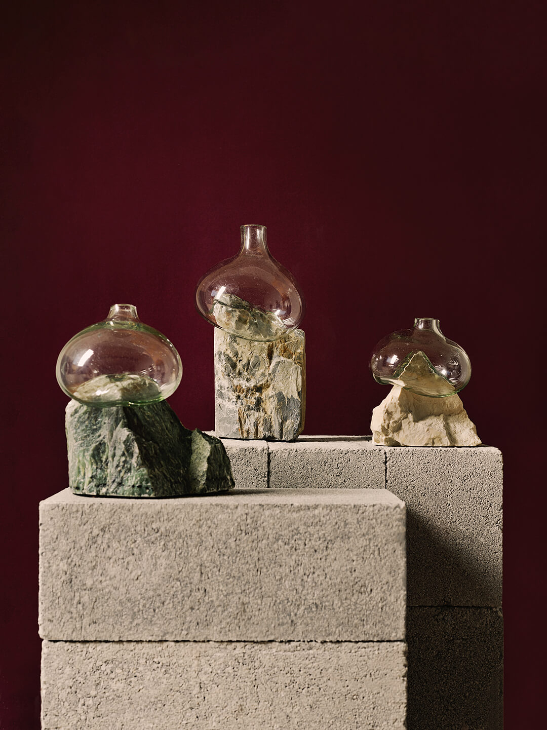 Works such as Roccos and Pōhakus embody that dialogue in its purest form. In Roccos, another candleholder, the hardness of stone meets the pliability of iron and this tension becomes a quiet contest of strength and balance. Pōhakus, made with recycled glass fused onto raw stone, captures the instant when molten glass moulds itself into rock; a zero-waste glassware vases that celebrate nature’s ability to adapt and merge. These quieter studies remind us that even in opposition, materials find harmony.