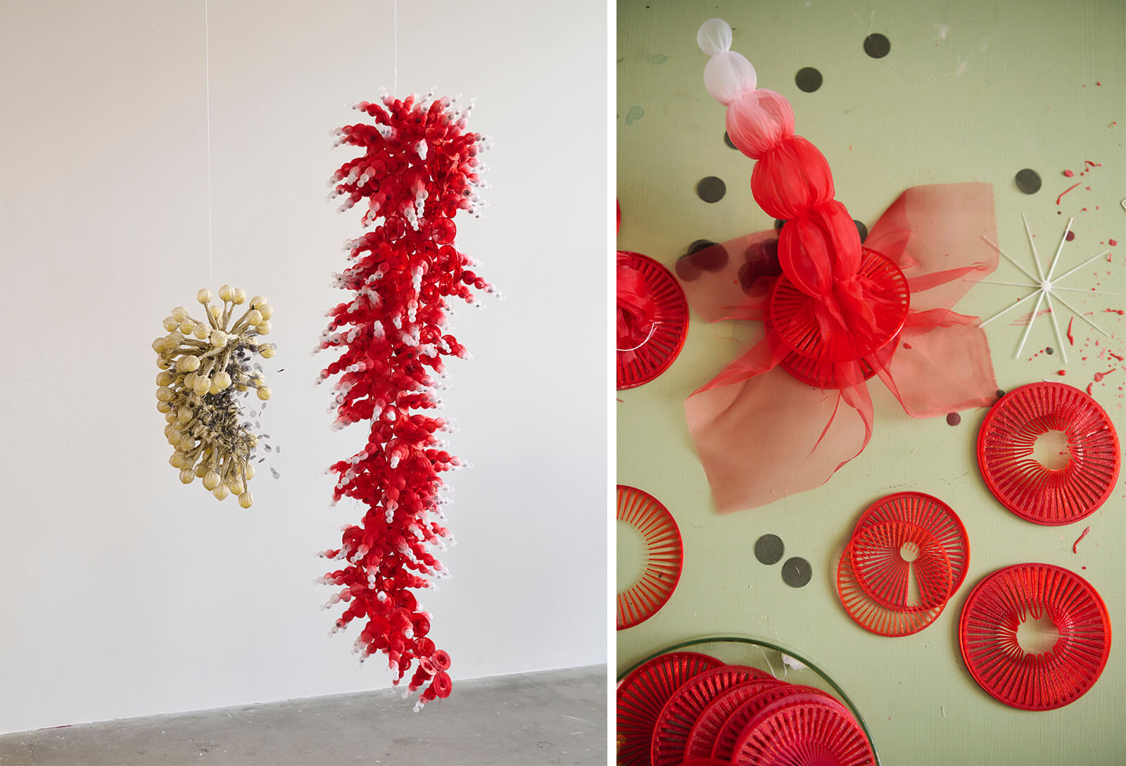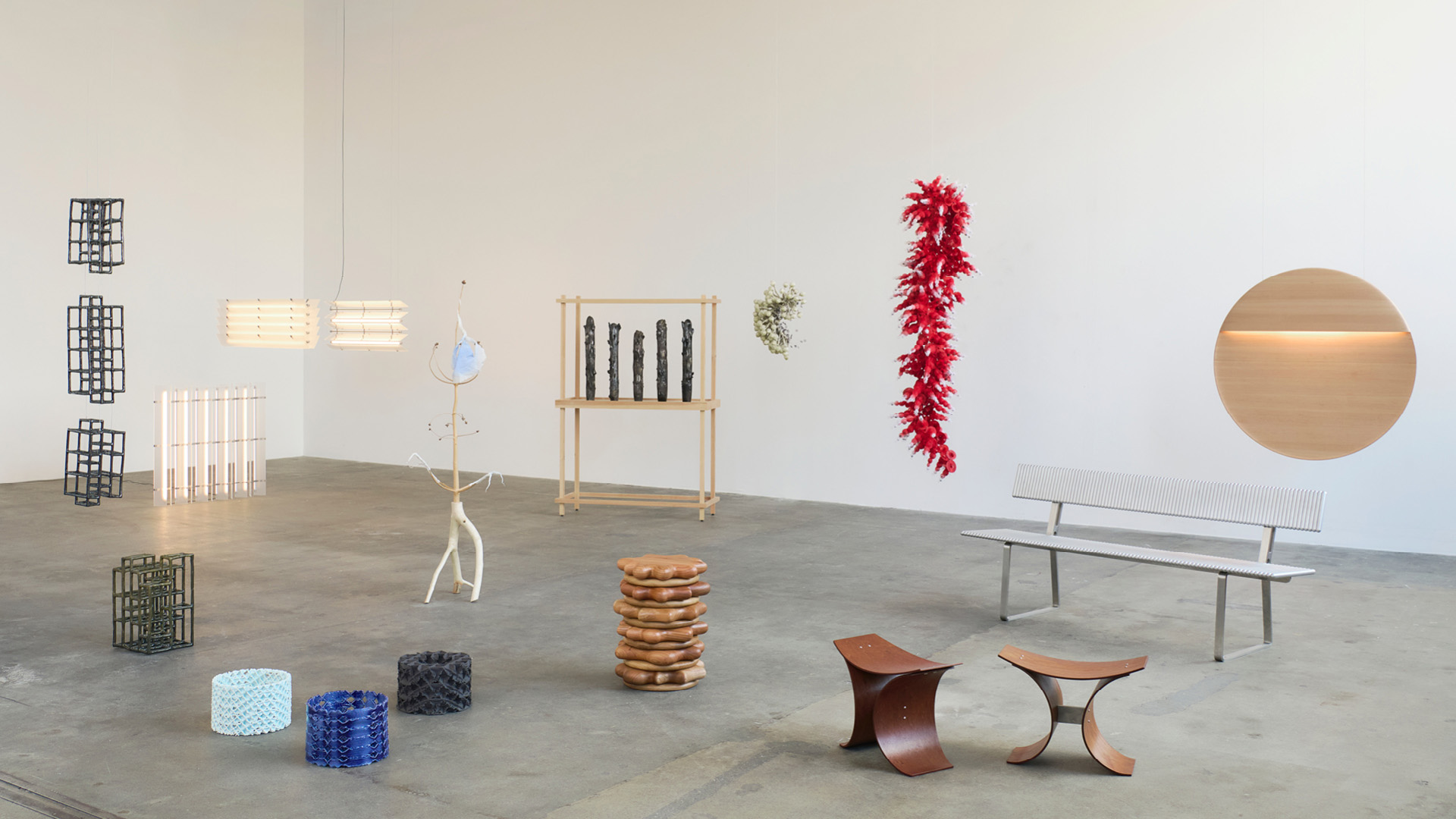 A fiery red cloud cascades down from the ceiling, demanding attention in an otherwise sparsely 'decorated' room. Accompanied by a second gossamer sculpture that resembles dried flower buds or a cluster of mycelium, the ensemble adds a touch of the wild to the gallery space of The Lab in Copenhagen. It is then the other disparate furniture, lighting fixtures and sculptures in the gallery that offer a clue on how an explosion of flowers has taken over this post-industrial landscape. These artefacts, varying in form, material and visual language, are part of this year’s Mindcraft Project, on view from October 2 – 5, 2025.
