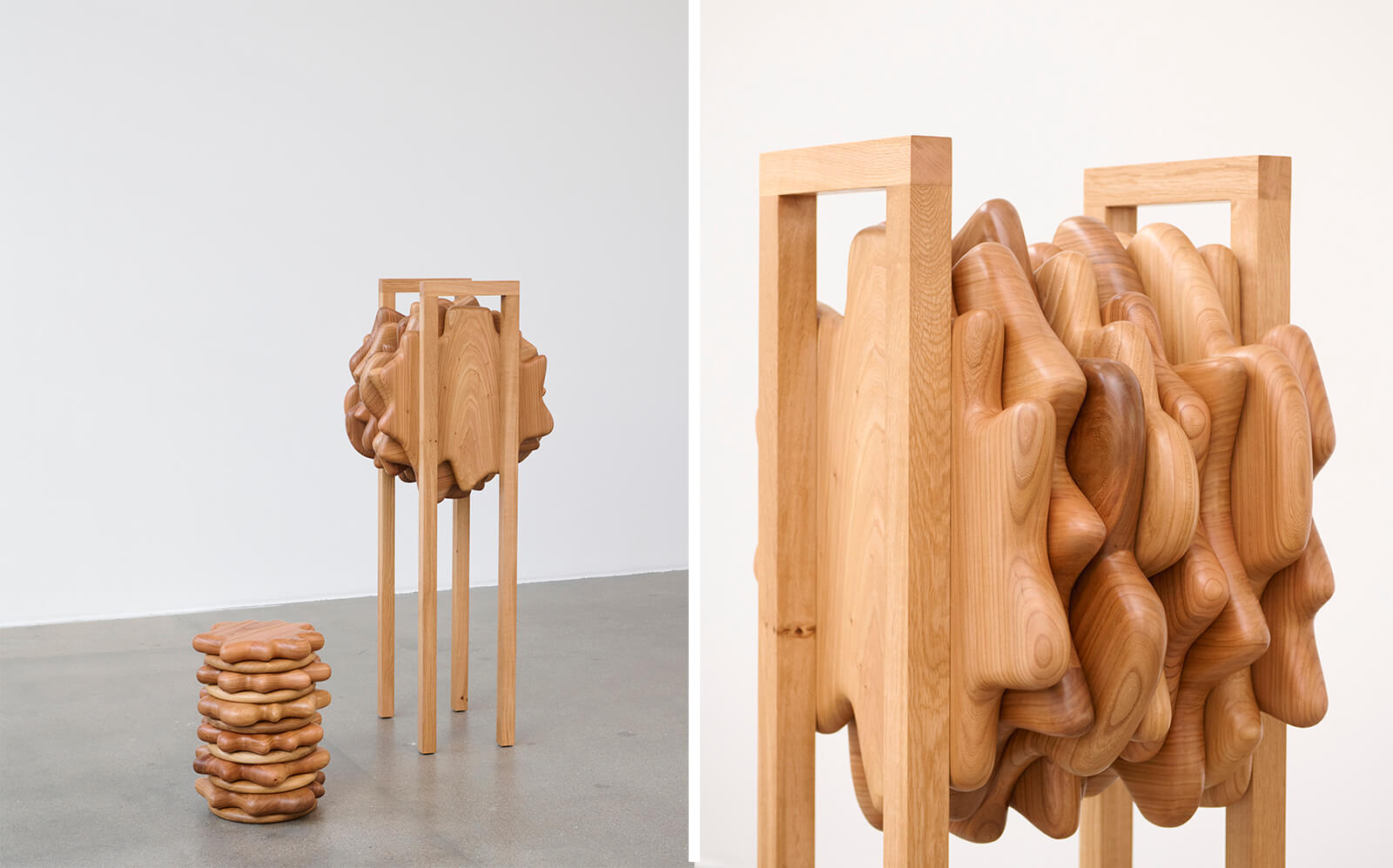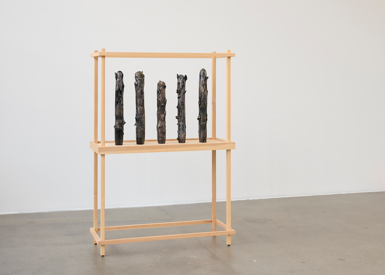 Curated by designer Pil Bredahl, the enticing assemblage is arranged within the space not with a hierarchy or affixed order in mind, but seemingly with the intent of allowing juxtapositions to occur rather instinctively—ceramic sculptures in regimented patterns complement a sculptural piece that looks like it could be part of a fae ritual; the cold metal of a bench in the middle of the gallery is offset by three stools moulded in wood.
