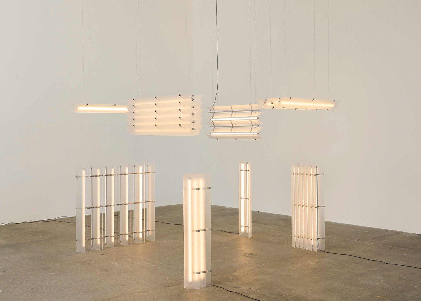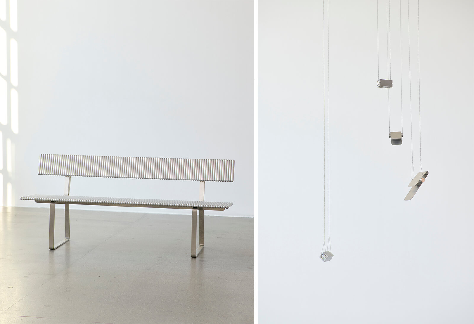 Another seeming incongruity in the nature-inspired showcase is the seating design by Danish designer Kasper Kjeldgaard. The Bench is composed of milled solid aluminium rods in recurring striations, while Small Ones is comprised of aluminium casings doubling up as lighting, suspended from thin steel wires adjacent to the bench. The modular designs are influenced by and revel in the liberty of form afforded by repetition. Furniture designer Kasper Kyster similarly relies on modularity for his lighting design collection, Strata. The different variations on view, including floor lamps and pendants, are made from acrylic sheets and steel brackets, allowing users to add or remove modules at will.