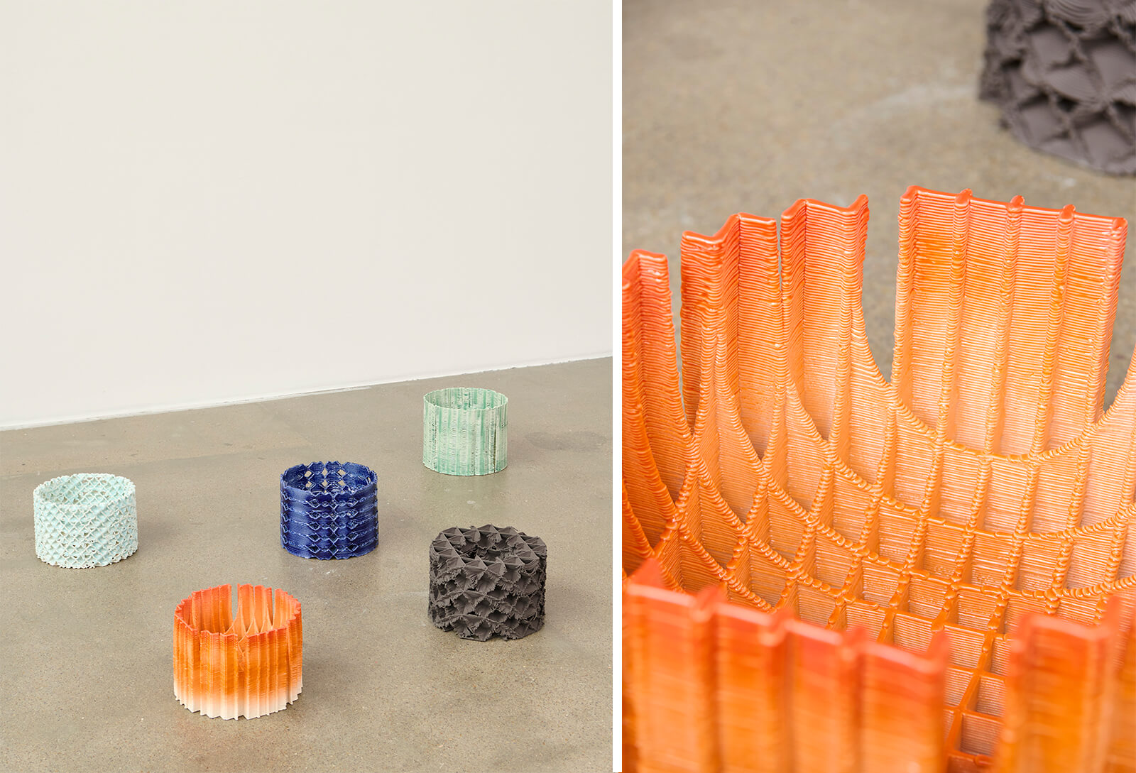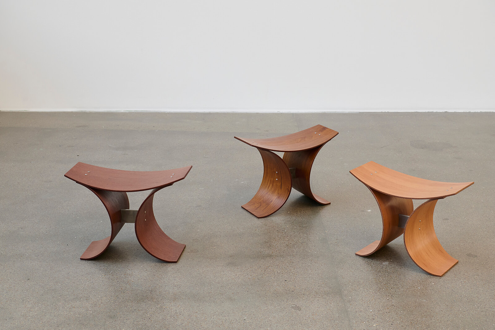 Moving from conceptual abstractions of natural principles lending form, one is prompted to look at architect Anne Dorthe Vester’s designs, RO stools, crafted from seven layers of pressure-moulded veneer joined by a single stainless steel bracket. Both in terms of form and material, while not particularly novel with the stools, work as a counterpoint to the steel bench by Kjeldgaard within the exhibition space, creating avenues for impromptu discourse. As Dorthe Vester notes, the works demonstrate how “industrial processes can coexist with a more crafted, expressive character”, emphasising the versatility of natural materials for sustainable design. The most 'natural-seeming' objects on display, as mentioned earlier, are the flower-like textile installations of Lærke Lillelund, who uses traditional Japanese ‘shibori’ techniques on synthetic polyester organza and silk for the designs. The textile artist similarly notes a fascination with modular systems (rather than alluding to the grand design of nature) for the works.