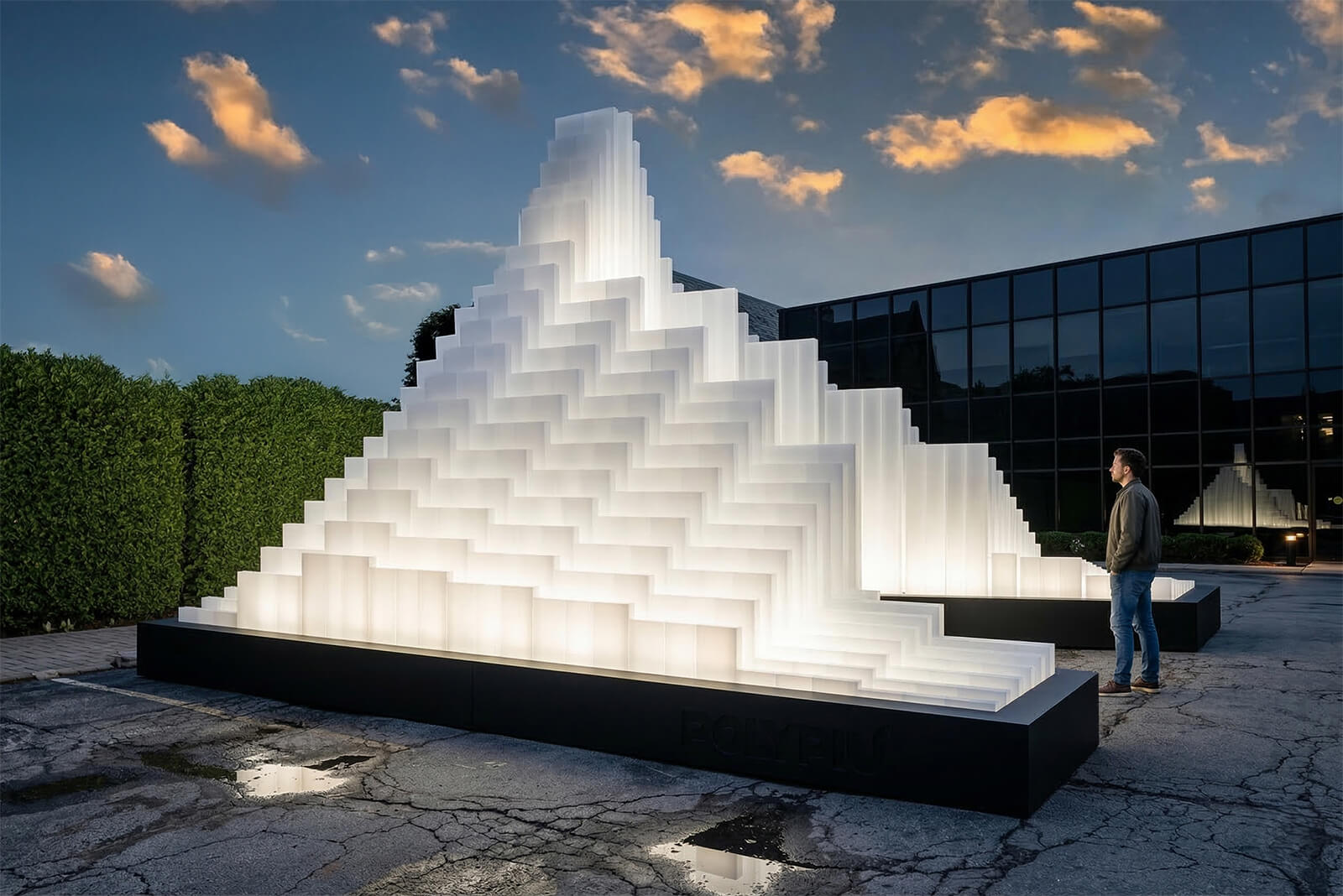 Designed by Studio Marco Piva and presented at SuperStudio Più as part of the SuperNova programme, Polypiù Cathedral takes a single industrial material and asks what else it might be capable of. The installation is built entirely from PolyPiù's PanelPiù 500/40 five-wall opal modular system (a product designed for roofing) and reconfigures it into an open, glowing pyramid that draws strongly on the visual language of sacred architecture.