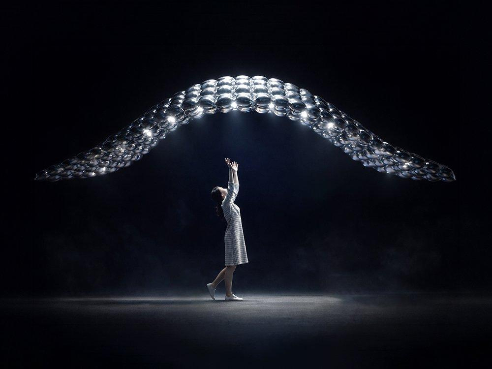 The project treats lightness as both a structural fact and a conceptual condition, an unstable equilibrium between buoyancy and control. Nested within the installation is Light Bites, a tableware set designed for immersive dining that responds to touch and movement, turning a meal into something closer to a performance.