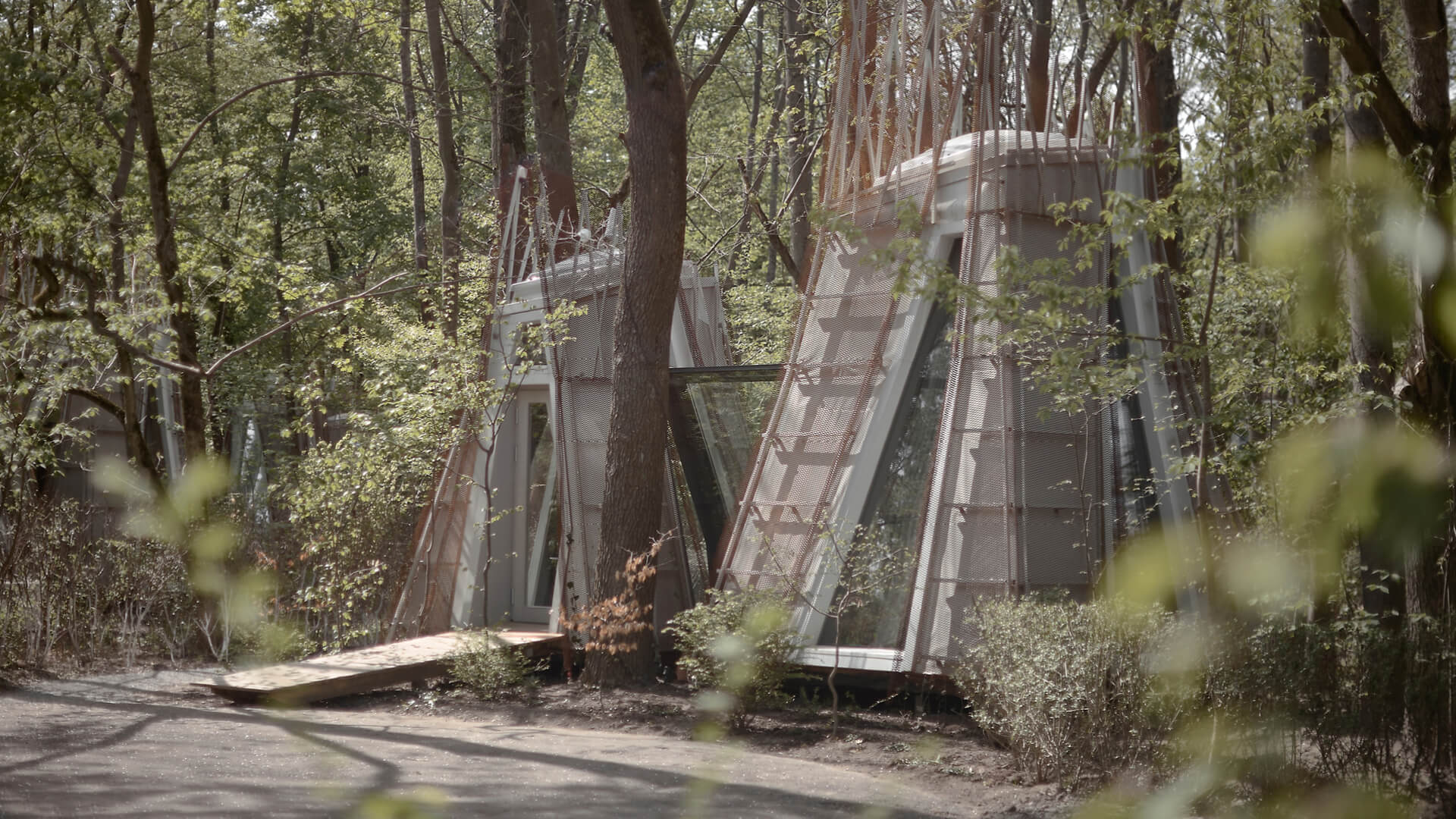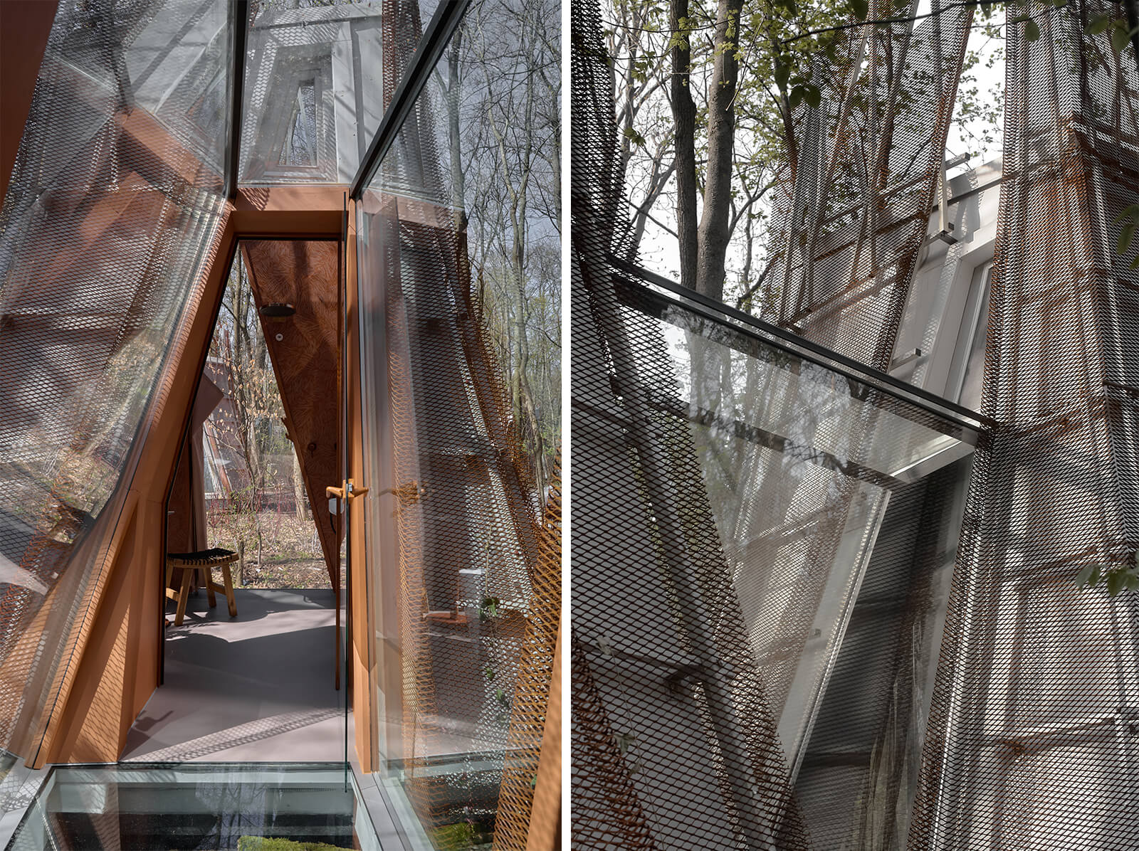 To preserve the natural landscape, no trees were felled on site. Instead, the buildings were constructed off-site as lightweight modules, which were then transported and assembled in stages. The initial brief was for it to be located among trees, artificial plantings and old gardens rather than in open glades. The modular system was designed with limited space in mind. We considered the spacing of the trees and looked for areas where they were either sparser or denser. This allowed us to identify areas where larger or smaller combinations of modules could be accommodated,” relay the architects. The materiality combines corten steel mesh, recalling the protective armour of military vehicles against enemy drones, with glass that speaks to the fragility of the circumstances. They continue, “The outer shell of the сorten mesh and the glass walkways were installed last. The mesh was chosen precisely because it helps the project to maintain its artistic image, and remain stable over the years and adapt over time thanks to the vegetation that will entwine the shell with local evergreen vines.”