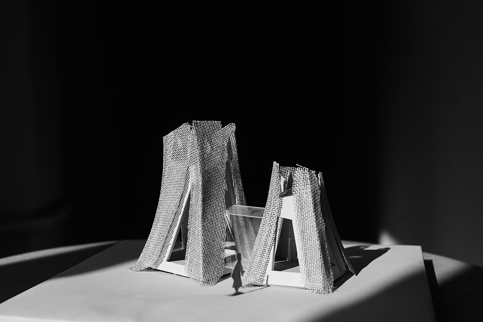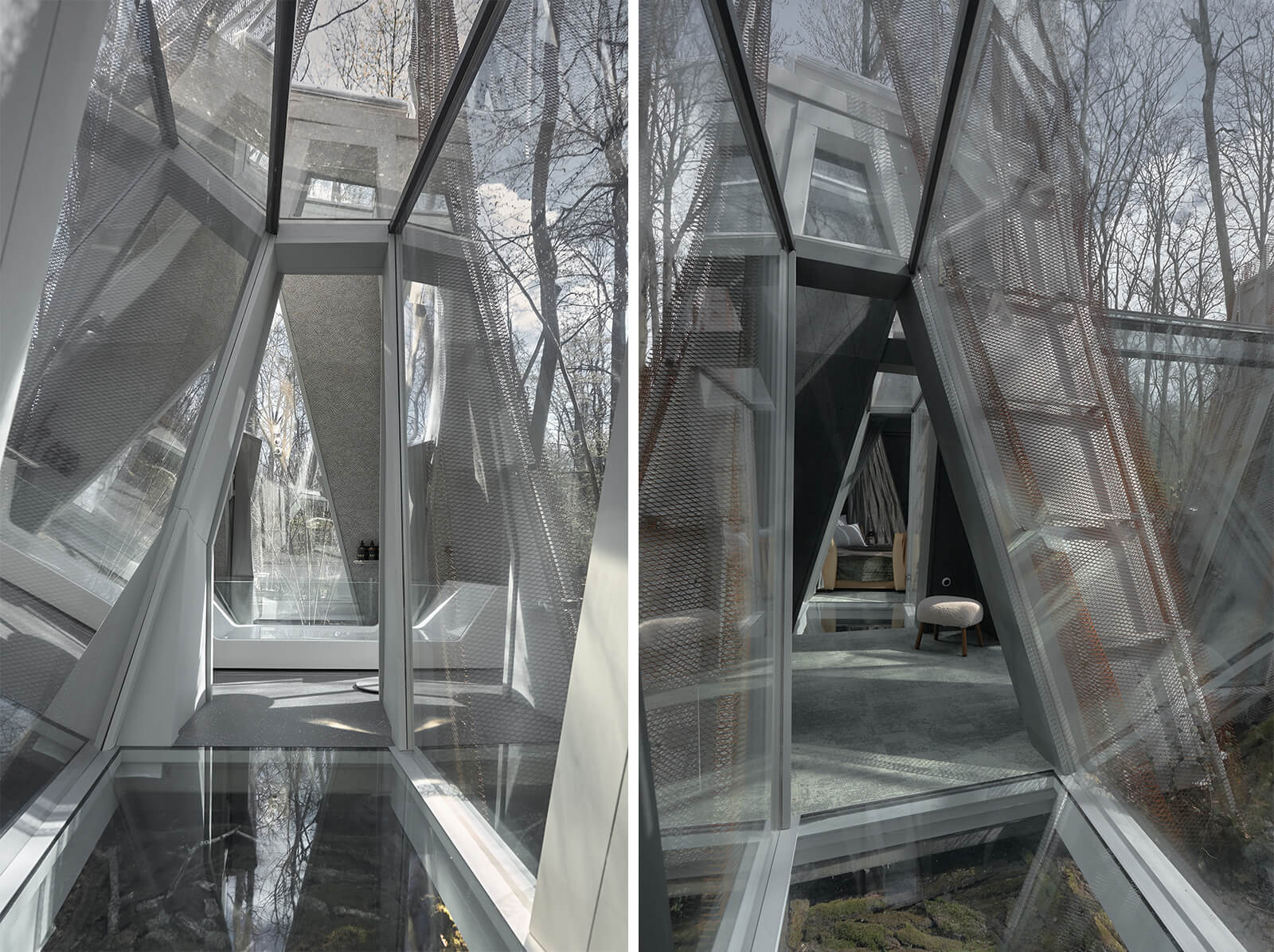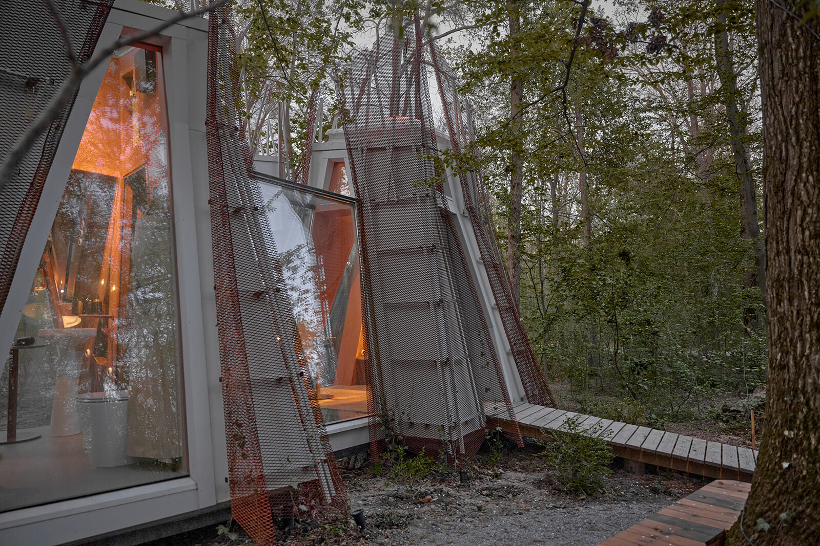 Grey mesh as a shell impart an ‘inner glow’ to the tents, essentially recreating the appearance of an illuminated frozen fabric along the corners and folds of the built mass. “Corten was also chosen for its practicality and the ability to form complex shapes, oblique bends and cuts, which would be impossible with other mesh materials,” the architects reveal. Beyond being agents of natural light, the glass corridors are places to pause and reflect, doubling as transitional spaces that connect the natural landscape across all the modules.