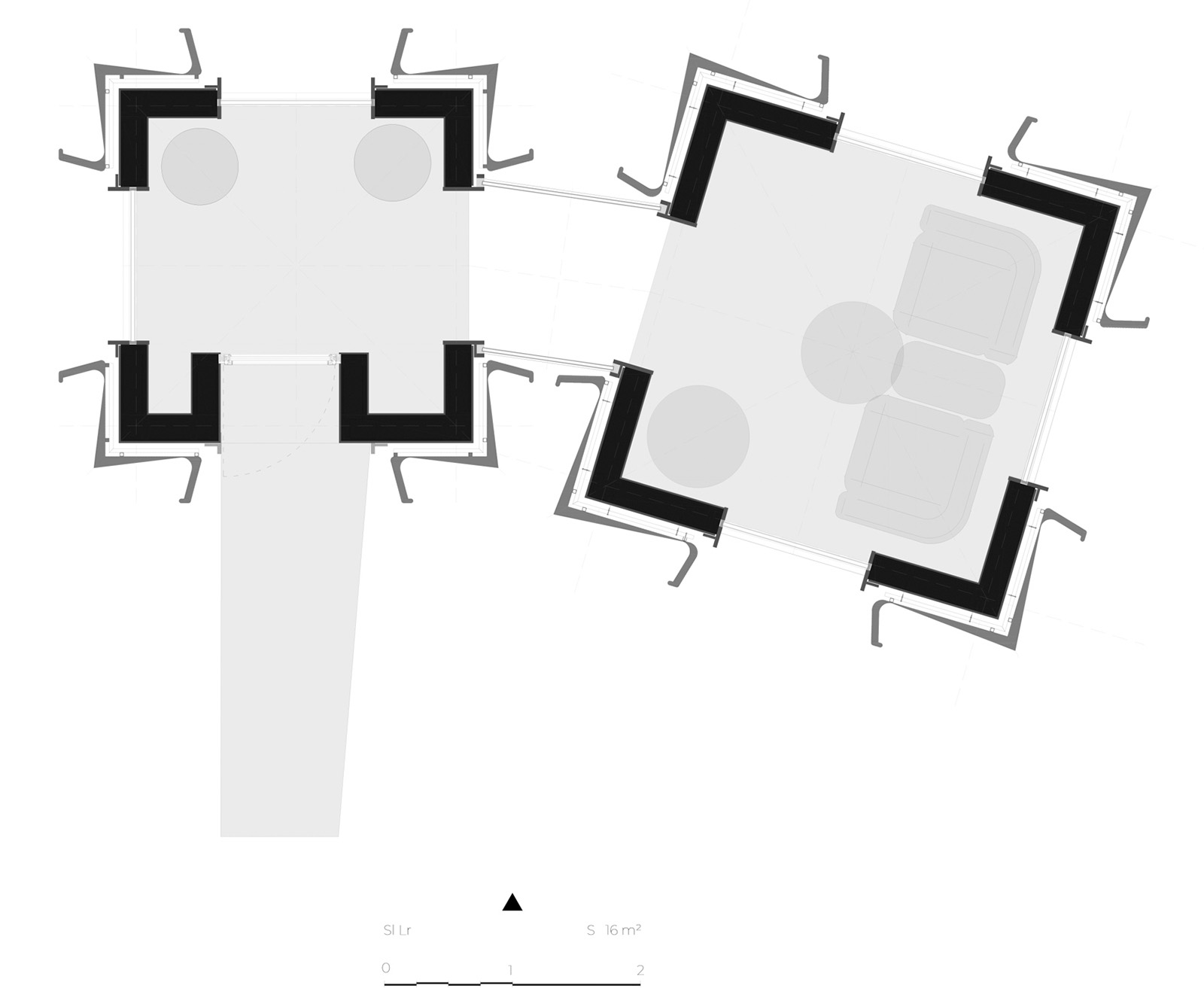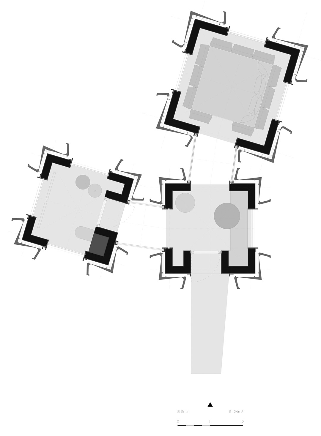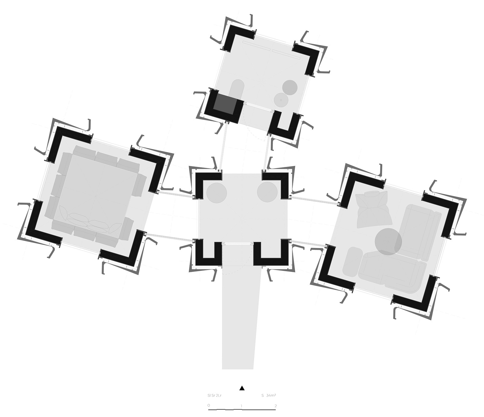 The studio articulated the conceptual design around two principles: mono-function and variation. The mono-function approach introduced spaces with a dedicated use that offers minimal interventions relying on module variations. The smaller modules are used for dressing rooms, bathrooms or auxiliary rooms, while the larger ones accommodate sauna, living and sleeping areas. The resulting modular design allows flexibility and adaptability within cabins while optimising limited footprints across the site.
