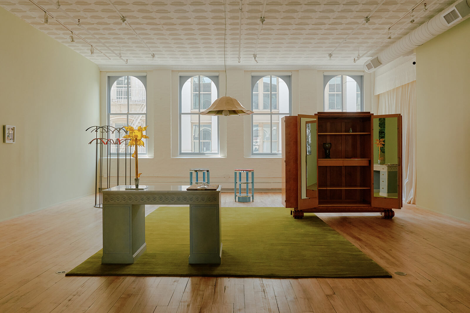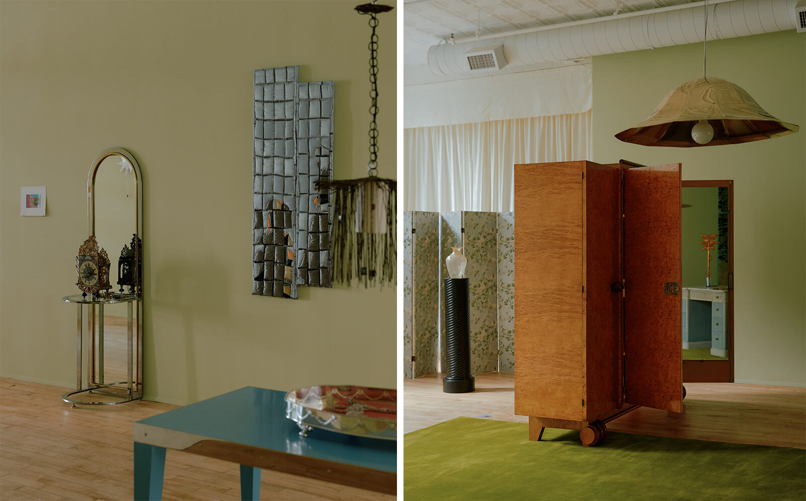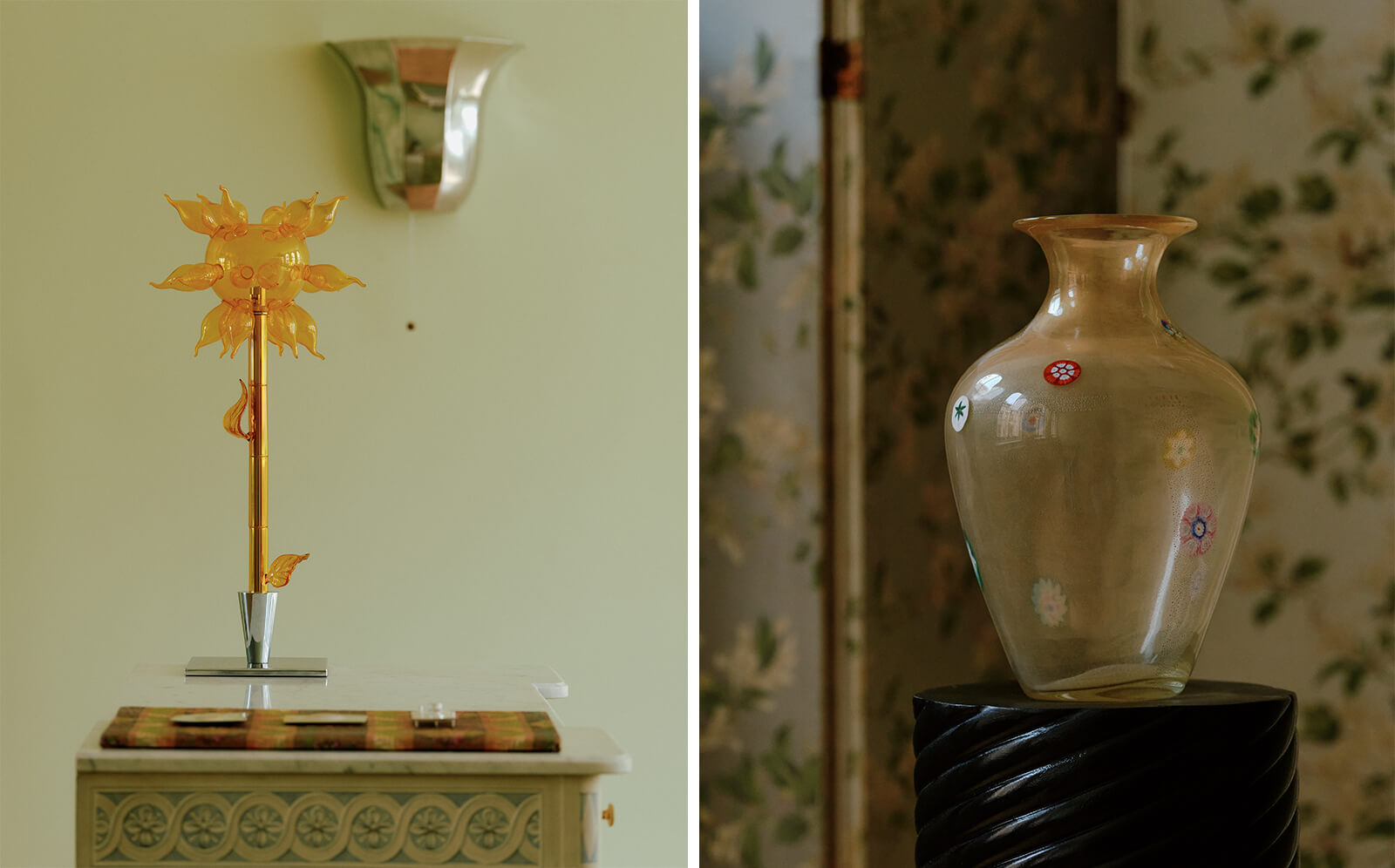 While these pieces define the spatial logic, other objects work more atmospherically. Italian light manufacturer Zonca Voghera’s late 20th century Sunflower Table Lamp is exceptionally breathtaking, its lemon-hued petals casting a warm, tangerine glow that gently softens the space. So is the 1920s Millefiori (thousand-flower) Vase, its surface blooming with intricate floral motifs rendered through age-old Italian glasswork techniques. These objects with motifs that, historically, have also been coded as feminine, evoke associations with beauty and domesticity. They infuse the room with the suspended elegance of a stage, setting the scene for the performance. “The dressing room represents a lexicon of endless meaning and possibility, an open stage where routines and patterns naturally articulate a distinct personal identity,” says Sullivan in an official release.