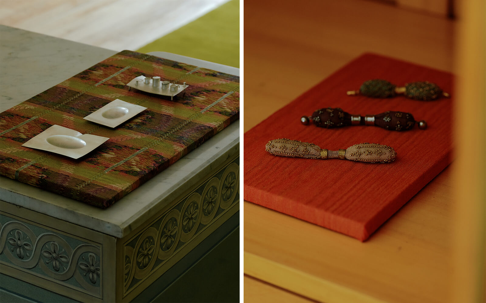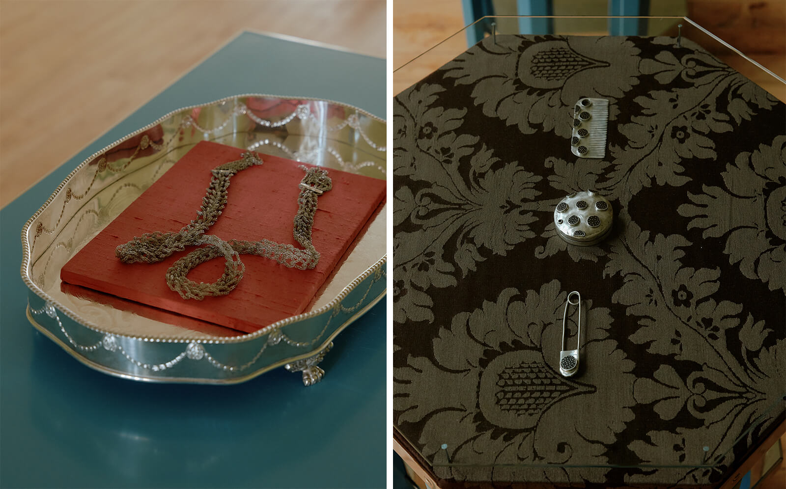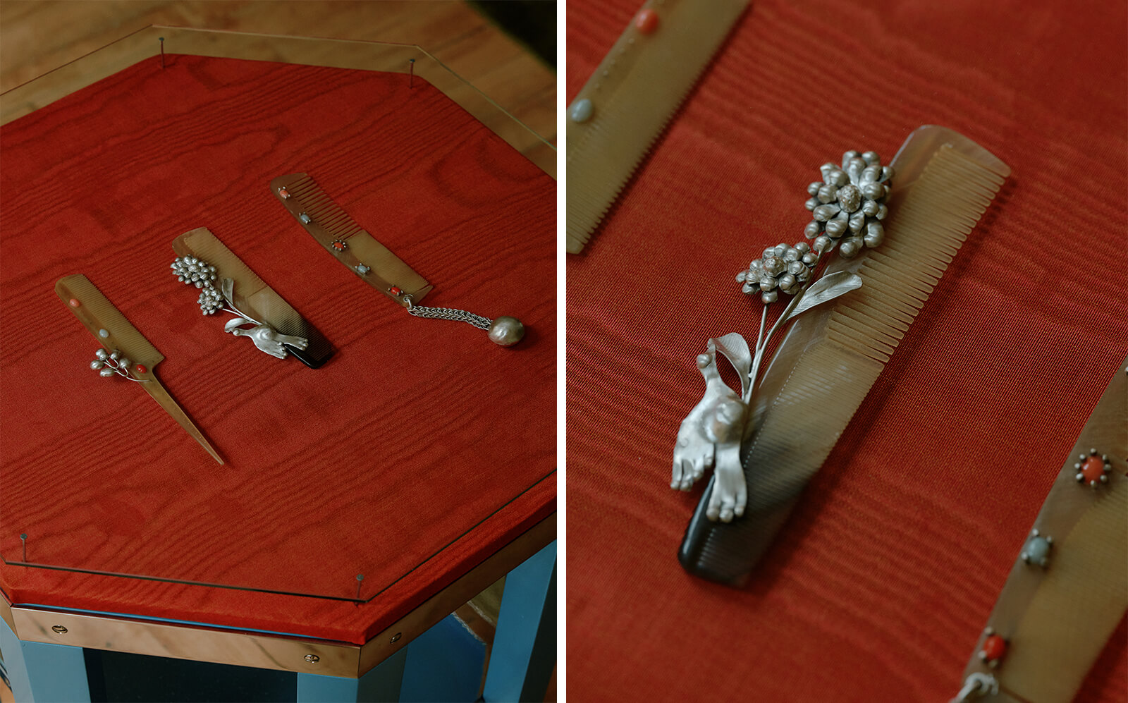 Against this carefully constructed backdrop, the contemporary designs intervene with materials ranging from metal, textile, glass and found objects. The designers hope to show how dressing is not a purely aesthetic exercise, but a process of metamorphosis. For instance, Paris-based jewellery designer Zoé Mohm’s Comb Study series feature delicate ornamental interventions on antique combs sourced from Parisian flea markets. She transforms the utilitarian tool—typically used for dressing—into something dressed itself, adorning it with jade, coral and handmade silver floral motifs that soften its animal horn teeth. These combs, along with a woven silver scarf necklace and an elegant vanity set, turn the gallery space into a boudoir suspended in time.