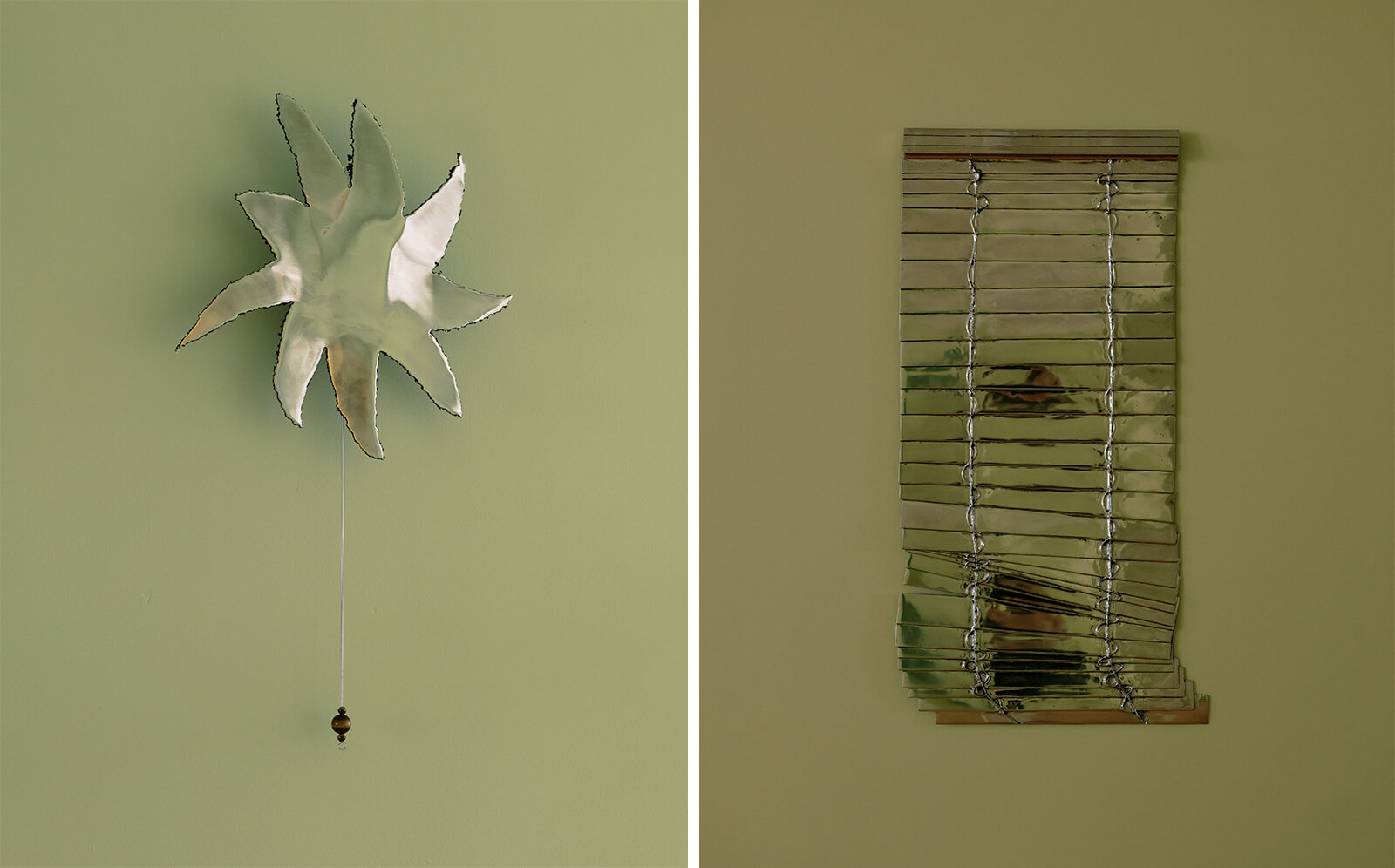 Cologne-based designer Hannah Kuhlmann brings sound and light into this space of becoming. Her 6 Winged Bird, a sun-shaped steel music box, plays a soothing melody when the tiger eye pearl is gently tugged, reminding us that music, too, is part of the choreography of dressing. Her Sun pendant and Shell sconce also add to the whimsy of the dressing room décor. Contemporary artist Anne Libby’s works, on the other hand, explore reflective surfaces using metal and fabric. Her wall art pieces juxtapose the polish of corporate interiors with the soft intimacy of the dressing room. While in These Days, polished metal offers a literal reflection, Bearded Iris, by contrast, mimics that reflectivity through satin and batting, creating a softened, tactile illusion. Together, the works question the authenticity of surface and shine, framing reflection as a constructed aesthetic, layered and illusory, much like dressing.