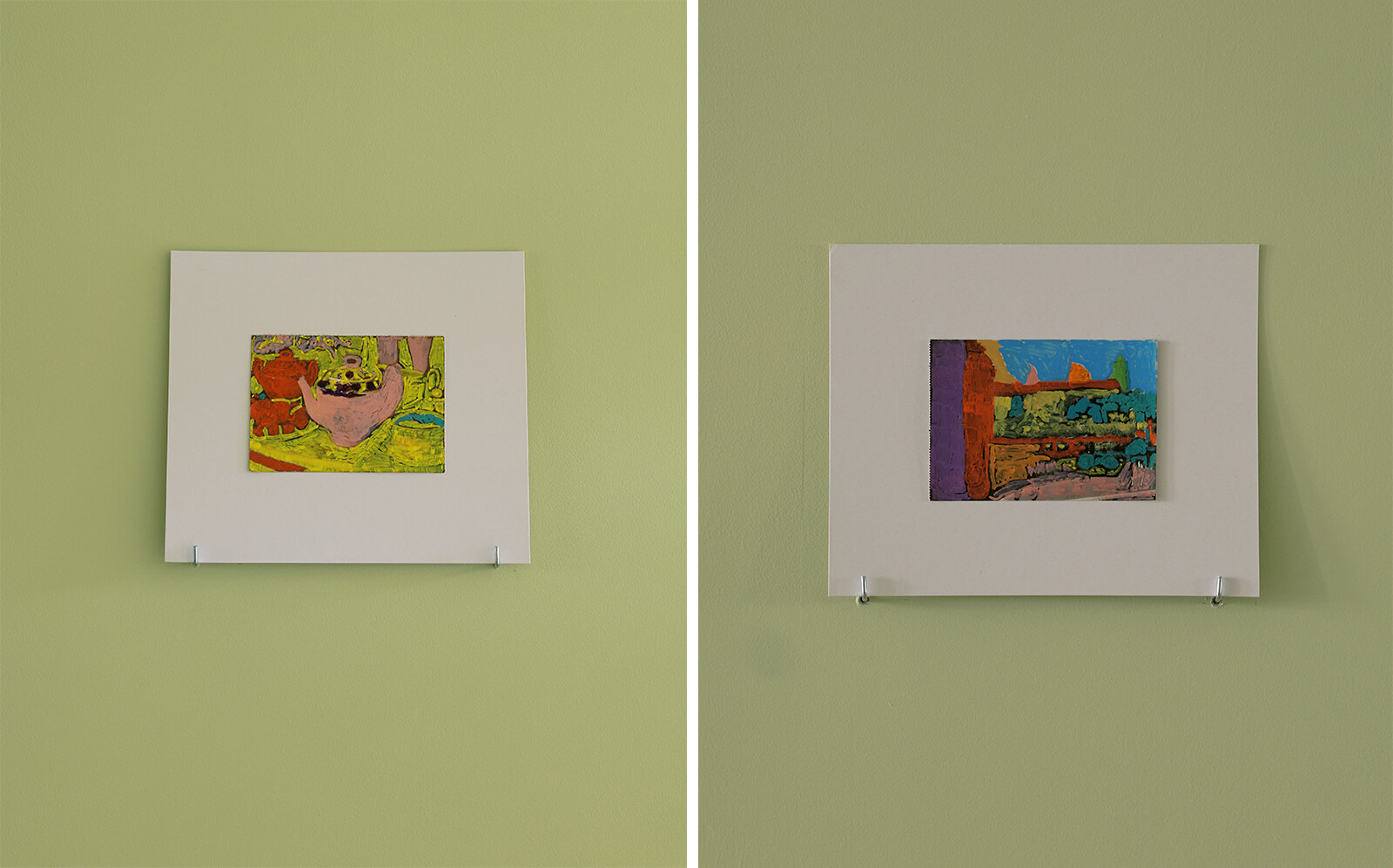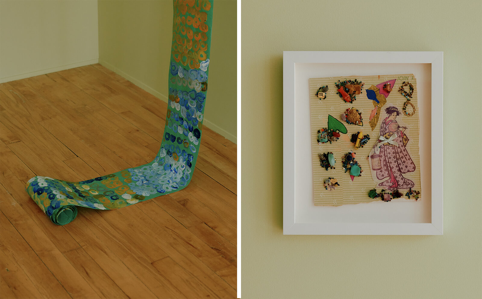 The Semiotics of Dressing also features contributions from Alice Wong, Stephanie Nguyen and Barry Regan—three artists from Oakland’s Creative Growth, a non-profit that supports artists with disabilities. Their contributions might appear to sit outside the conventional frame of dressing, but they expand it, treating appearance and surface as acts of composition and transformation. Nguyen crafts whimsical collaged characters from trinkets—sequins, beads, stones—that turn ornament into narrative. Regan’s piece takes the form of a long, hand-painted paper scroll, suspended like a garment about to be worn. Wong’s postcards transform vintage photographs by layering them in saturated acrylics, re-dressing them as windows, as a gesture perhaps toward the unknown or the unfinished.