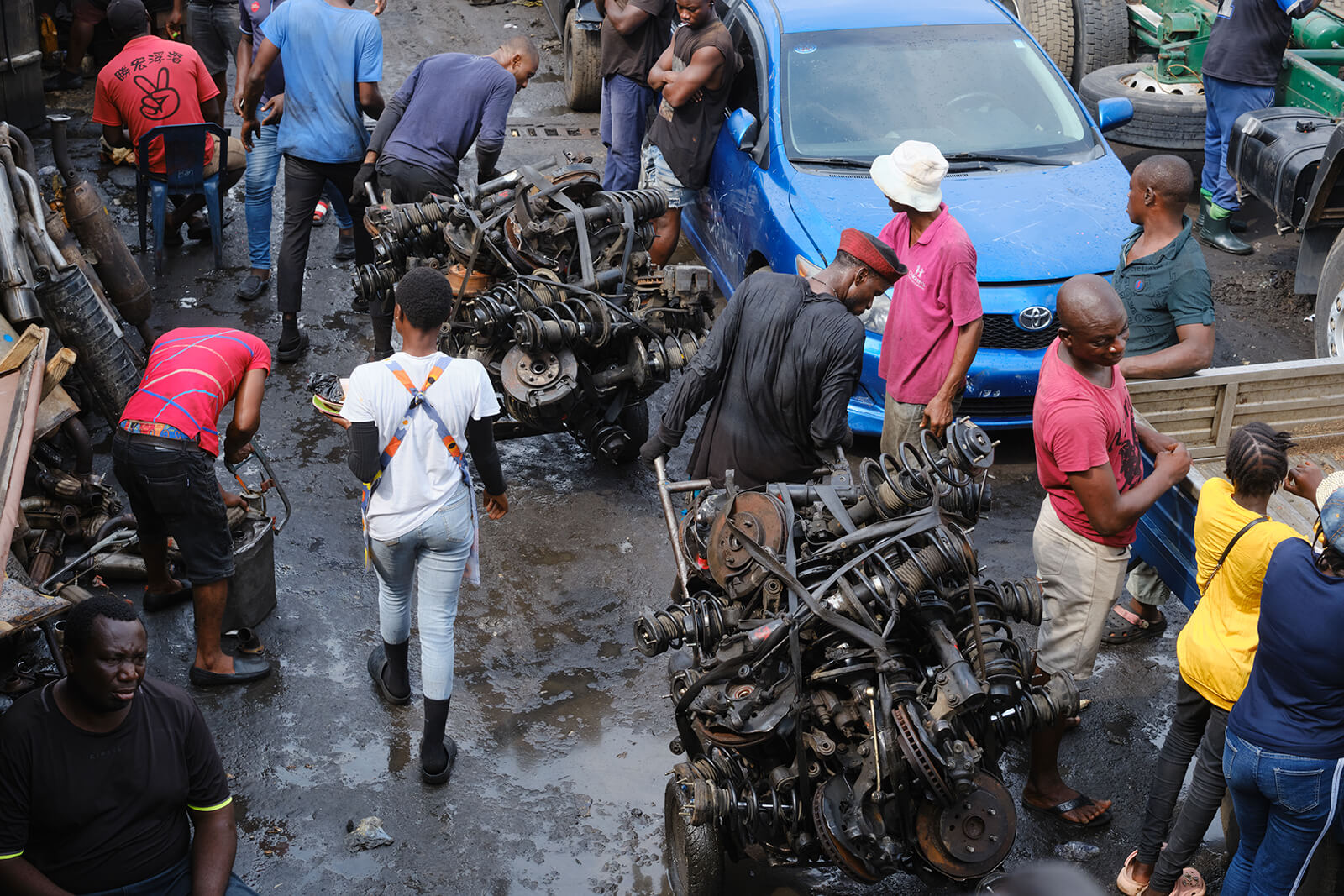 While for Sharjah, touching on the traditional Arabic kasbahs, Oshinowo drew out threads of ephemeral architectures, and how that might become a more resourceful means of living, here she draws on the traditional connotations of informal Nigerian markets. As she notes to STIR, marketplaces hold special reverence within Yoruba culture. These have been indispensable spaces for indigenous peoples and are hence central to conceiving towns. Tracing their relevance to contemporary society, Oshinowo showcases the principles of circular design and resource efficiency underpinned in the operations of these markets. As she notes, mechanics and technicians in these enclaves can repair, recycle and regenerate ‘waste’ or ‘end-of-life’ items with extraordinary skill, countering hyperconsumerism and the idea of object obsolescence that has led to inordinate waste and planetary depletion. Such a response to adversity exists outside of normal modes of governance or planning, established by the resilience of local communities and the necessity for such ingenuity in the face of disparity. Highlighting the informal conditions through which these markets developed—catering to the influx of migrants from rural areas to Lagos—there is the suggestion that it is this that makes them intrinsic to the socioeconomic realities of people in Lagos.