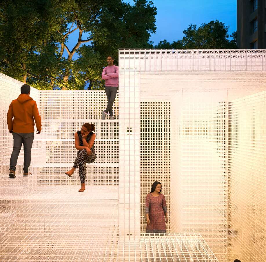 The pavilion design begins with a disciplined grid, precise and ordered, echoing architecture’s impulse to impose clarity on space and movement. This initial order is then deliberately unsettled: the grid fractures, rotates and displaces through a 45-degree shift, introducing diagonal movement into an otherwise orthogonal system. This disruption reflects a lived urban reality in which movement rarely follows straight lines, and life bends, collides and recalibrates itself constantly. Voids are cut into the structure as active thresholds rather than absences, allowing air, light and people to pass through. These openings are where the pavilion breathes, and encounters take place.