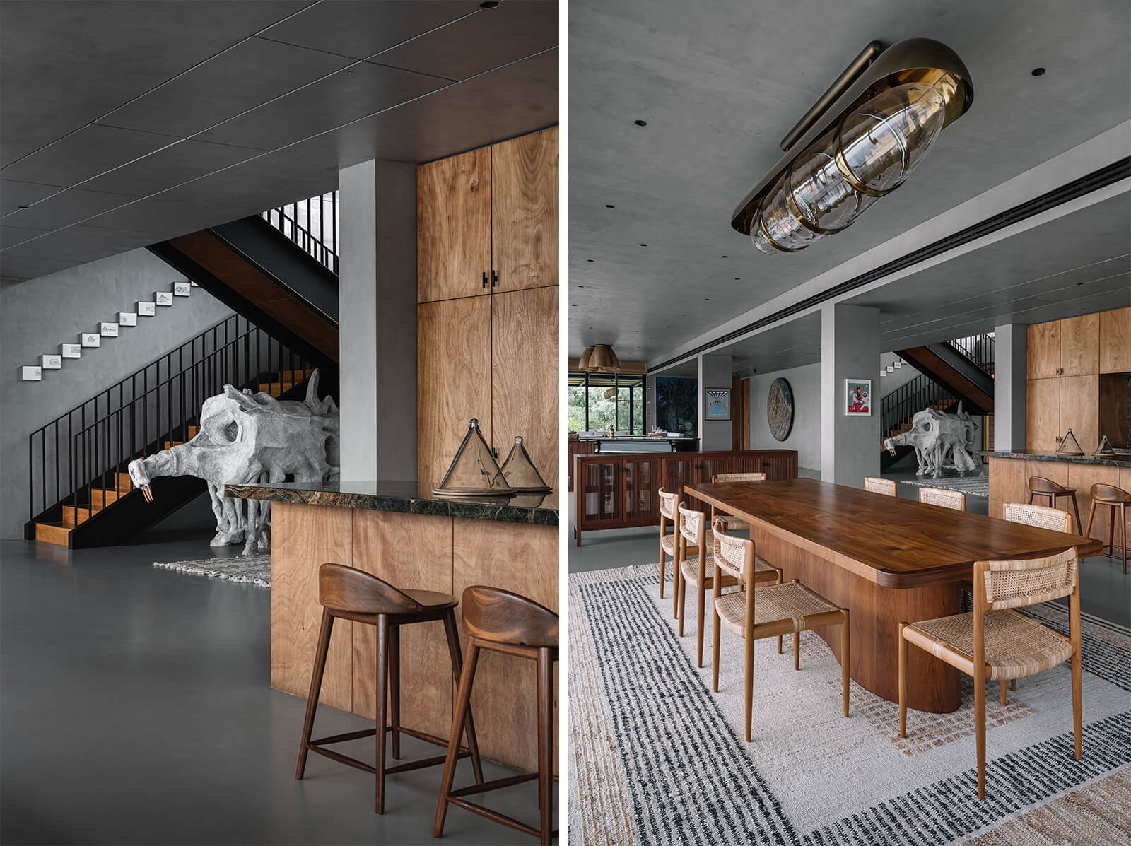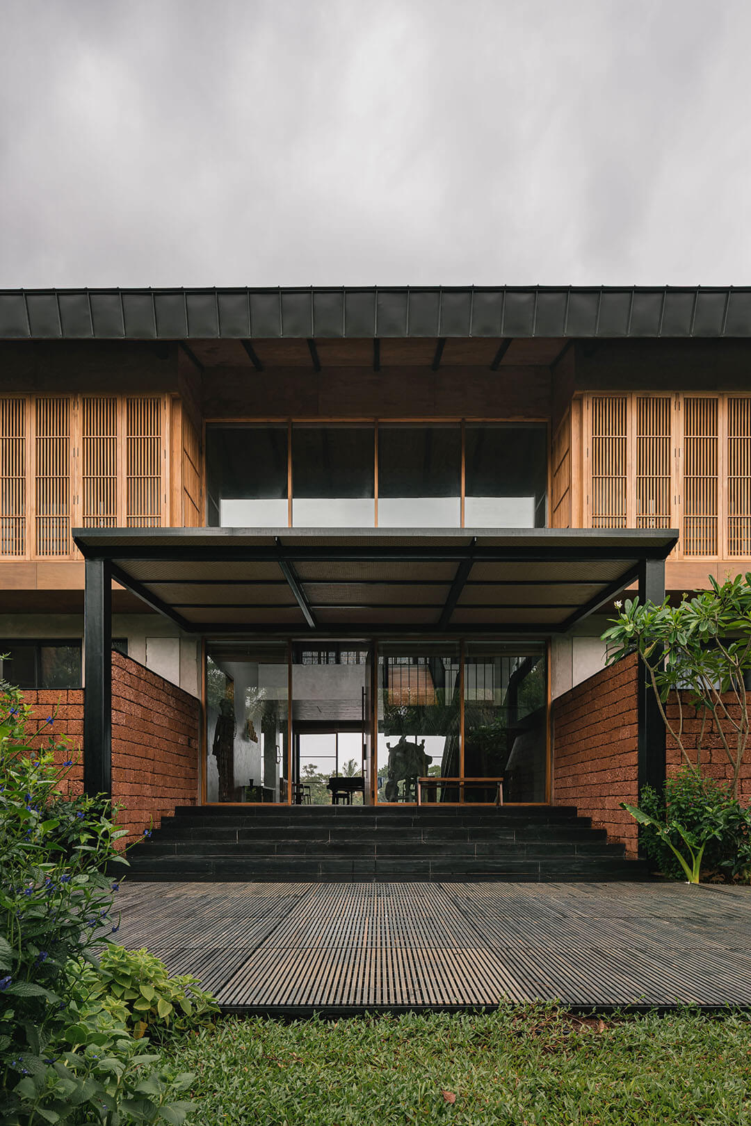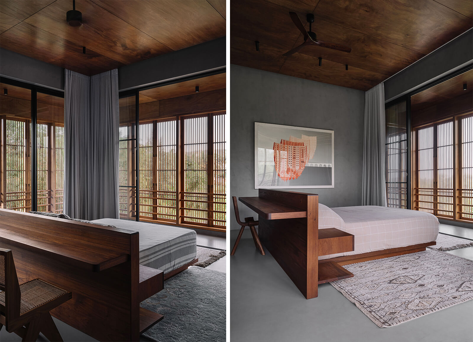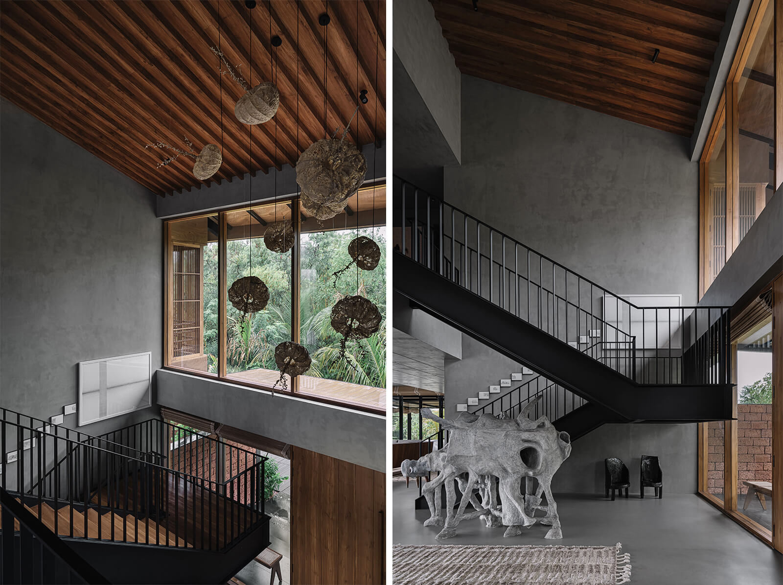 The concrete and timber architecture features a tactile and indigenous material palette for the interior design. The staff quarters are constructed in exposed concrete and locally sourced laterite stone, while the walls on the entire lower level of the house are rendered in polished cement plaster. Displaying a light-and-shadow play through its louvres, the upper level features cement walls and floors dressed in shifting tones of grey, black, green, mustard and terracotta. Moreover, the richly veined Indian granite stone complements the softened accents of cane and exposed plywood residential interiors. The residence is also laden with many contemporary art pieces from the client’s private collection, procured over a period of ten years.