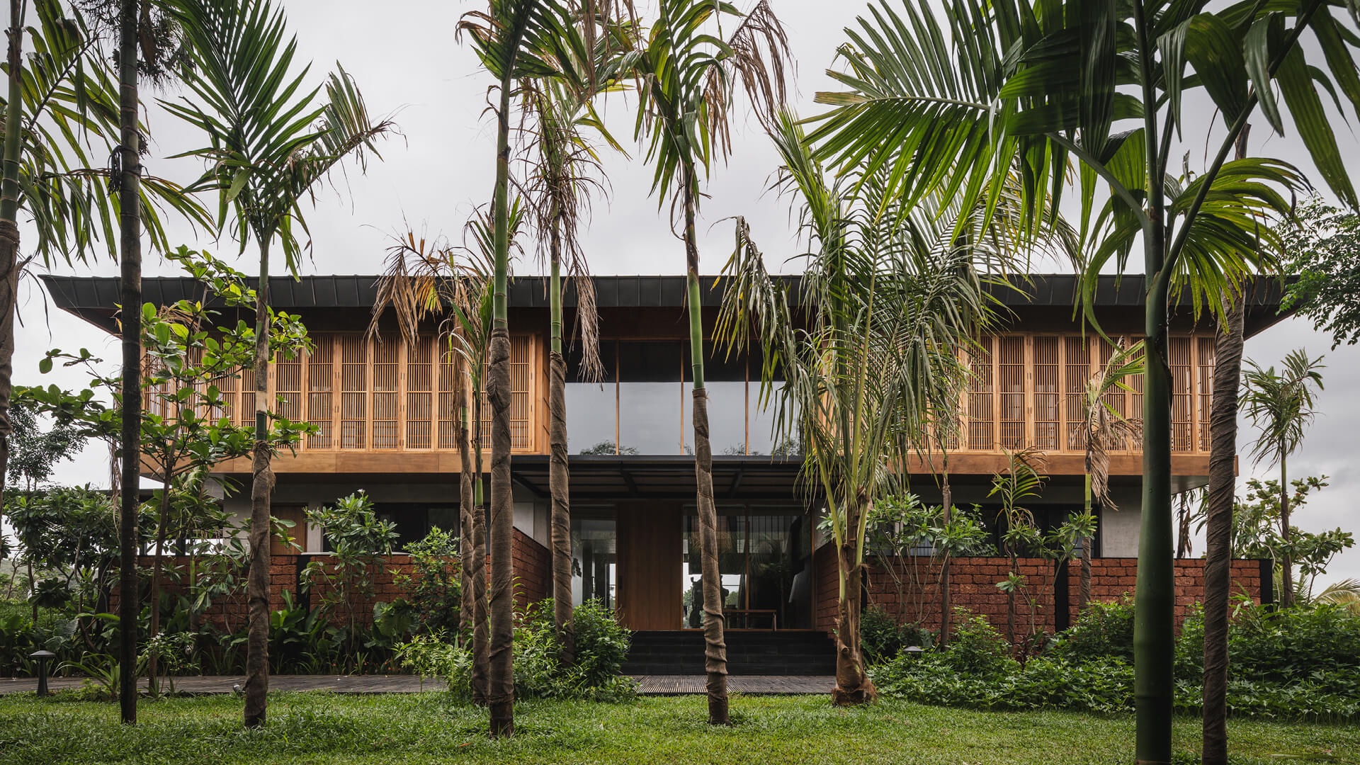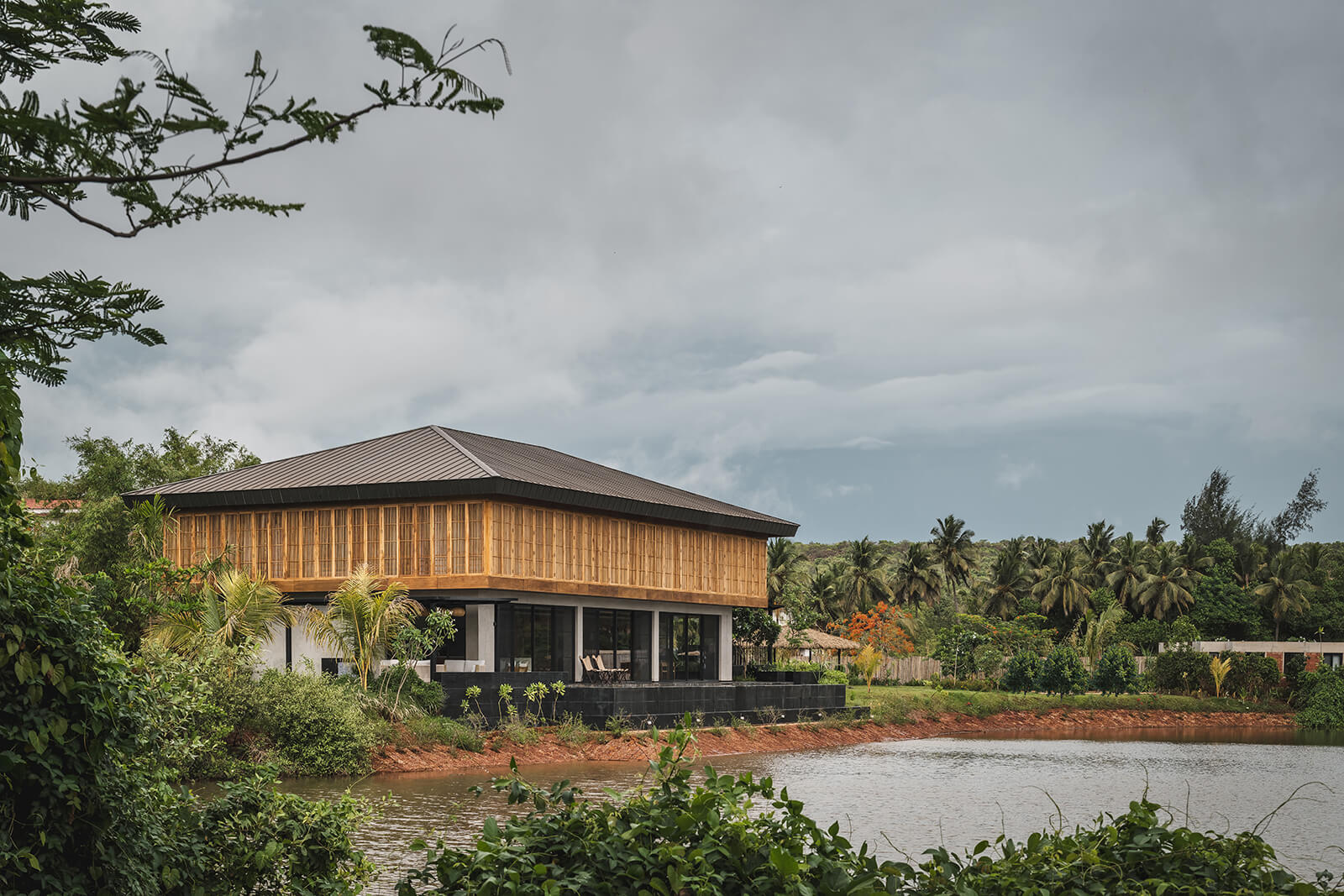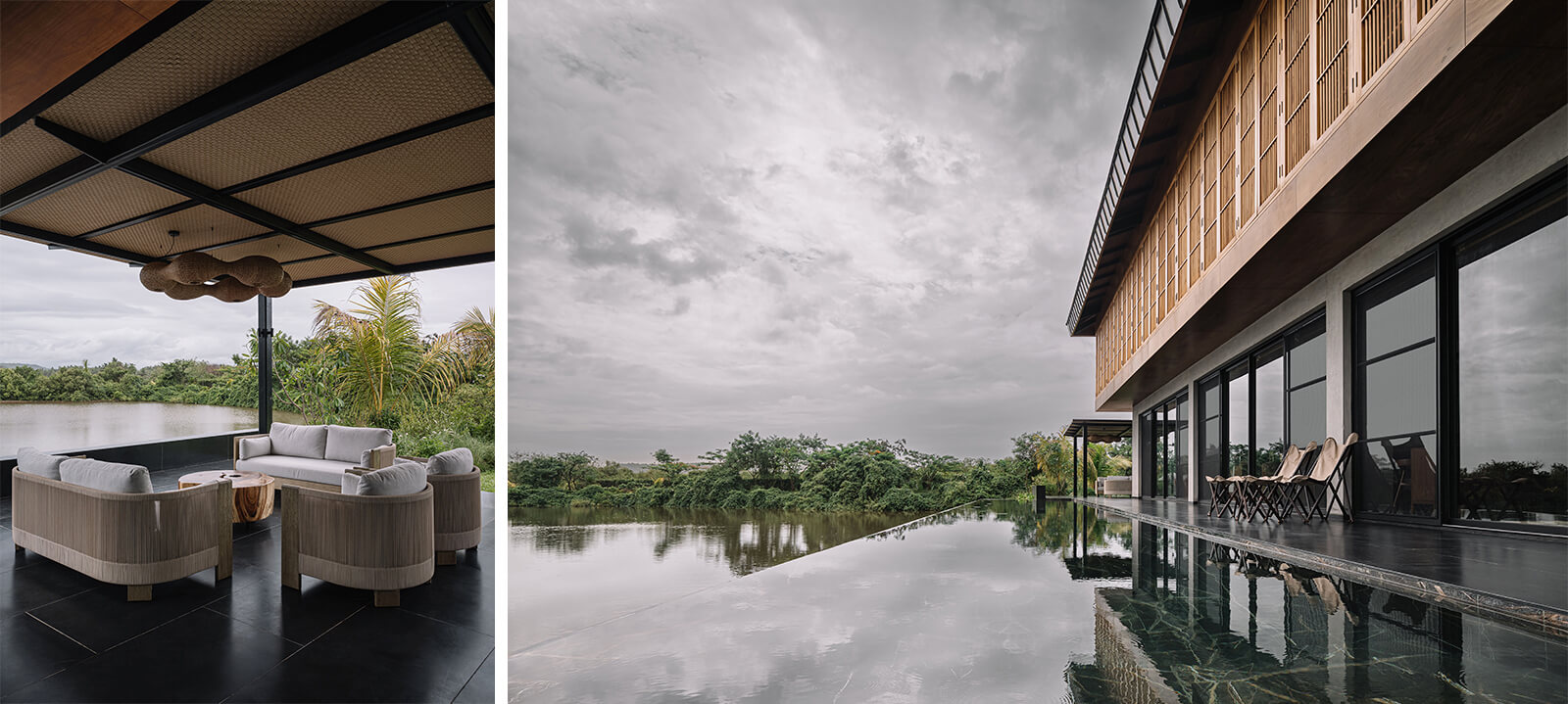 The concrete and timber architecture features a tactile and indigenous material palette for the interior design. The staff quarters are constructed in exposed concrete and locally sourced laterite stone, while the walls on the entire lower level of the house are rendered in polished cement plaster. Displaying a light-and-shadow play through its louvres, the upper level features cement walls and floors dressed in shifting tones of grey, black, green, mustard and terracotta. Moreover, the richly veined Indian granite stone complements the softened accents of cane and exposed plywood residential interiors. The residence is also laden with many contemporary art pieces from the client’s private collection, procured over a period of ten years.
