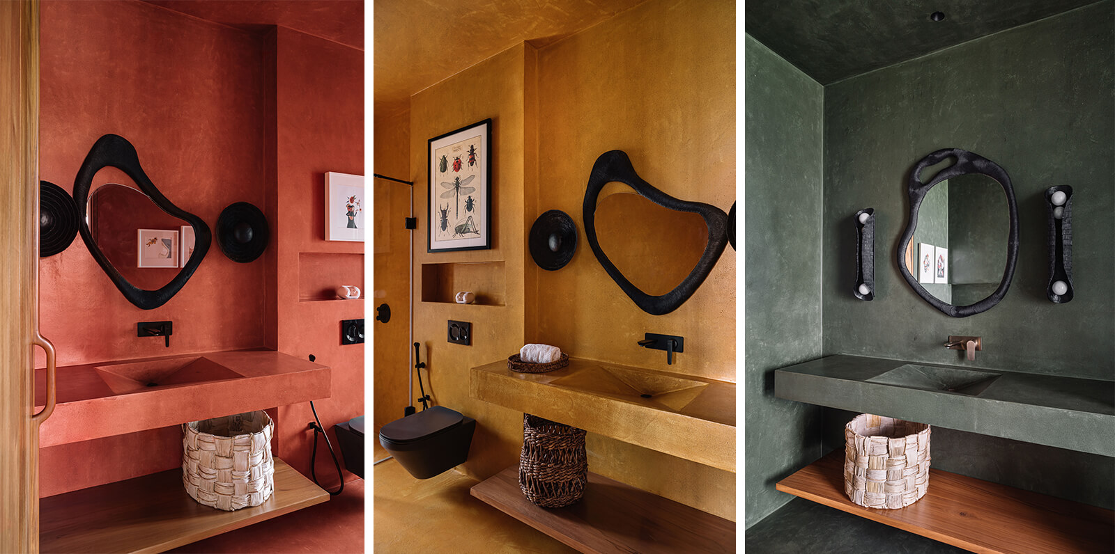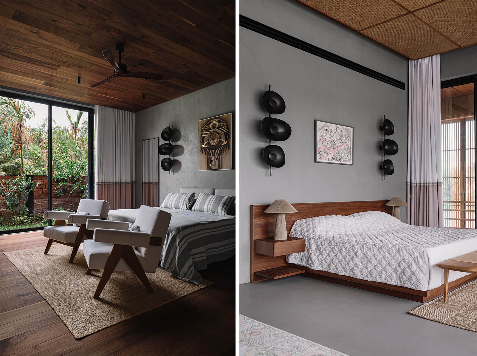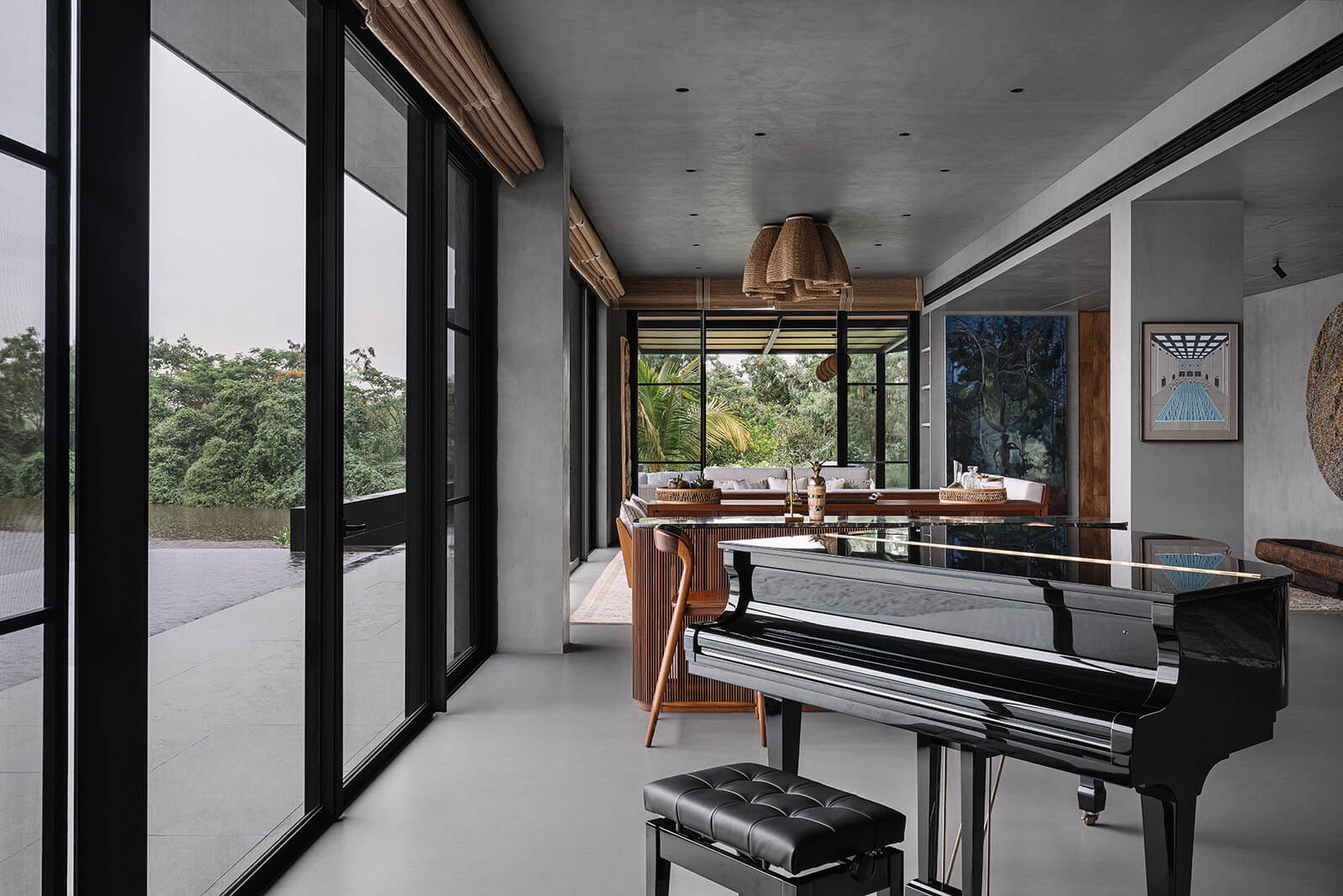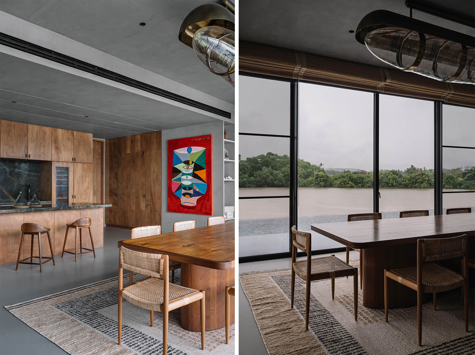 The concrete and timber architecture features a tactile and indigenous material palette for the interior design. The staff quarters are constructed in exposed concrete and locally sourced laterite stone, while the walls on the entire lower level of the house are rendered in polished cement plaster. Displaying a light-and-shadow play through its louvres, the upper level features cement walls and floors dressed in shifting tones of grey, black, green, mustard and terracotta. Moreover, the richly veined Indian granite stone complements the softened accents of cane and exposed plywood residential interiors. The residence is also laden with many contemporary art pieces from the client’s private collection, procured over a period of ten years.