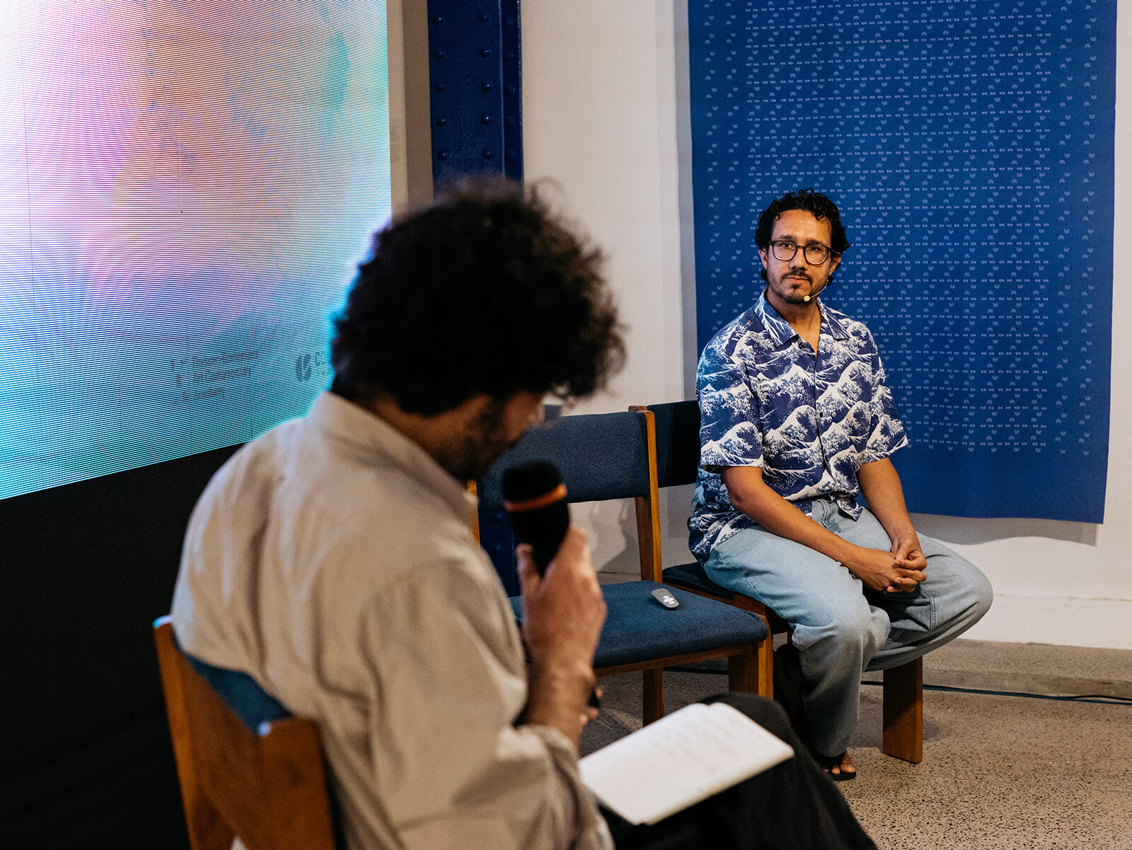 Ginwala spoke of the ocean as a ‘wet archive’, a fluid mass that spans affective and economic geographies, its complexity often illegible to official archives and hegemonic knowledge systems. She moderated the opening conversation, Vessel as Memory. Return as Method, which brought together Wiradjuri and Ngunnawal artist and curator Brook Garru Andrew and art historian Anna Arabindan-Kesson. Andrew framed water through the lens of First Nations thinking—rivers, wetlands and coastlines, then, were not merely borders but systems of memory, sovereignty, and even seasonal obligation. Colonial violence often sought to weaponise the intangibility of these systems through incremental acts of destruction. He foregrounded longstanding coastal exchanges, like the economic and cultural interactions between Makassar sailors from Sulawesi in Indonesia and the Yolngu people in Australia’s Northern Territory, starting in the 18th century.