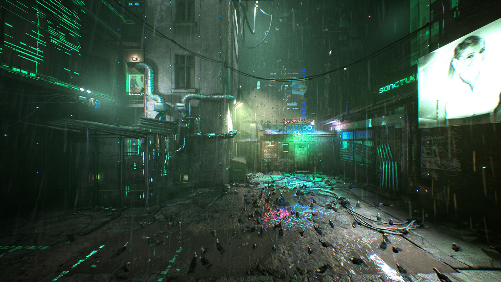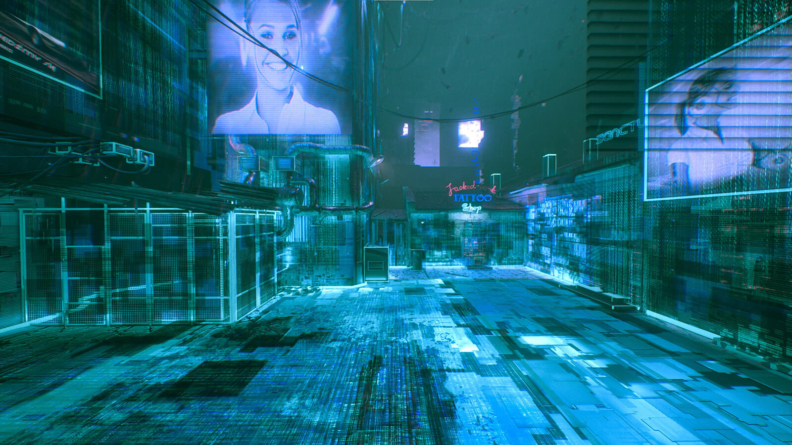 A narrow hallway. A closed door at the end. Cables run across the floor and ceiling. On the walls? Advertisements. More cables. A vacuuming robot, observing the 'Observer'. The ‘tin man’ janitor unlocks the door. Beyond it, a courtyard under the dark sky. Damp, dirty, cold and loud. Large posters, neon signage, flashing screens.