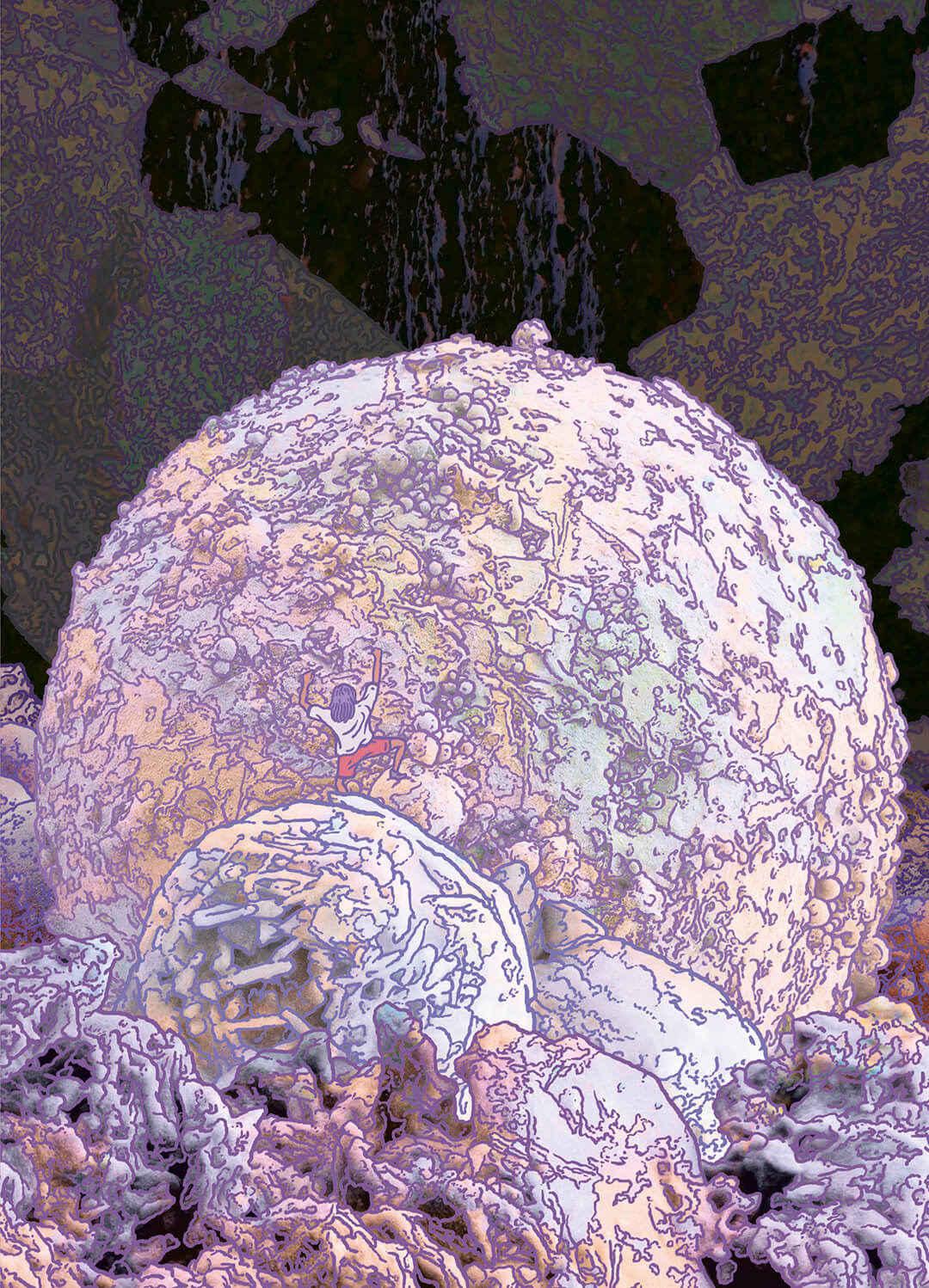 Subsequent encounters, rendered with striking visuals by visual artist Clément Vuillier, are more than flights of fantasy—they are poetic invitations to reconsider how life persists, adapts and thrives beyond human expectation. The earth is not inert, nor is life solely anthropocentric; instead, it is exuberant, plural. From the flower, Luca meets a zebra jumping spider, making soft hums in the dry soil. The spider challenges preconceptions: “I don’t need webs. I need space to jump,” it declares, showing Luca how it can leap ten times its body length to catch prey. Playfully, the boy accepts the challenge, only to land on uneven ground and tumble into a dark hole. From this fall, he learns to think like the land itself. “The cracks, the dust—the spaces that seem forgotten or broken to you—are exactly where we thrive,” the creature concludes.