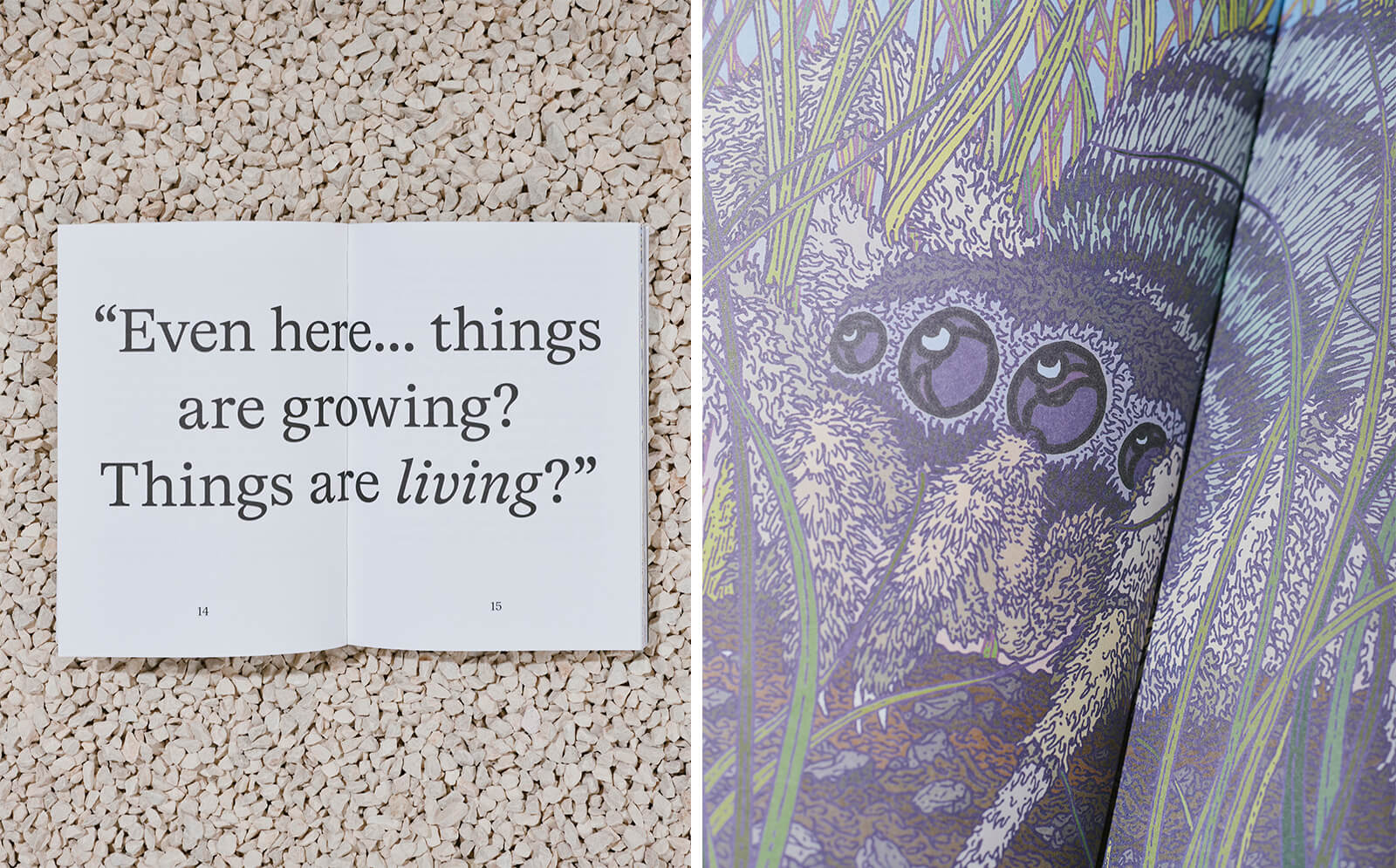 The lyrical tale, rendered in a childlike tone, follows the story of a boy named Luca as he strolls through fields near his home. The story begins on a sunlit day tinged with boredom and irreverence; distant grasses and idle landscapes that hold little interest for him. “To him”, the text observes, “nature was just an inconvenience, a mess of randomness and chaos, full of things that didn’t make sense.” From this moment, Luca encounters the hidden lives of tiny subterranean creatures, who communicate with him through subtle vibrations. Each encounter becomes a gentle lesson in listening, noticing and understanding a world shared with the more-than-human.