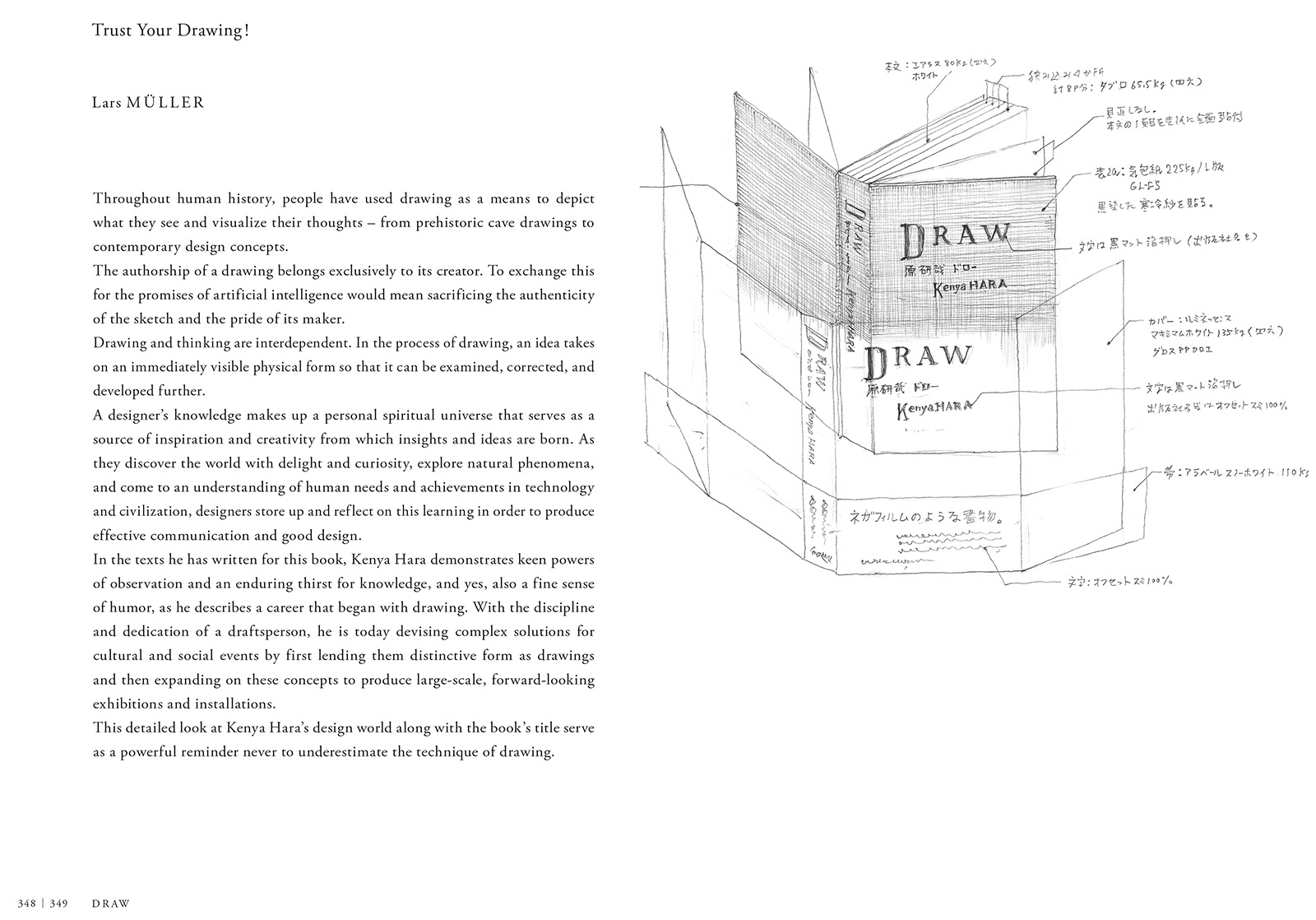 Through abstract sketches that only hint at an idea being formed to boldly illustrated concepts and detailed layouts for everything, from advertorials to exhibition catalogues, Draw offers readers a peek into the mind and thought processes of someone considered to be one of the most influential designers in present-day Japan. The book presents the act of drawing, or drawings and sketches, as potent imaginative forms. Within different instances in the book, Hara reiterates the suggestion that it is the repeated, meditative task of working through a problem with a pencil in hand that has led to the discovery of something novel. By compiling the sketches and graphic designs chronologically, the richly illustrated volume traces the life and work of the contemporary designer through the cathartic act of creation.