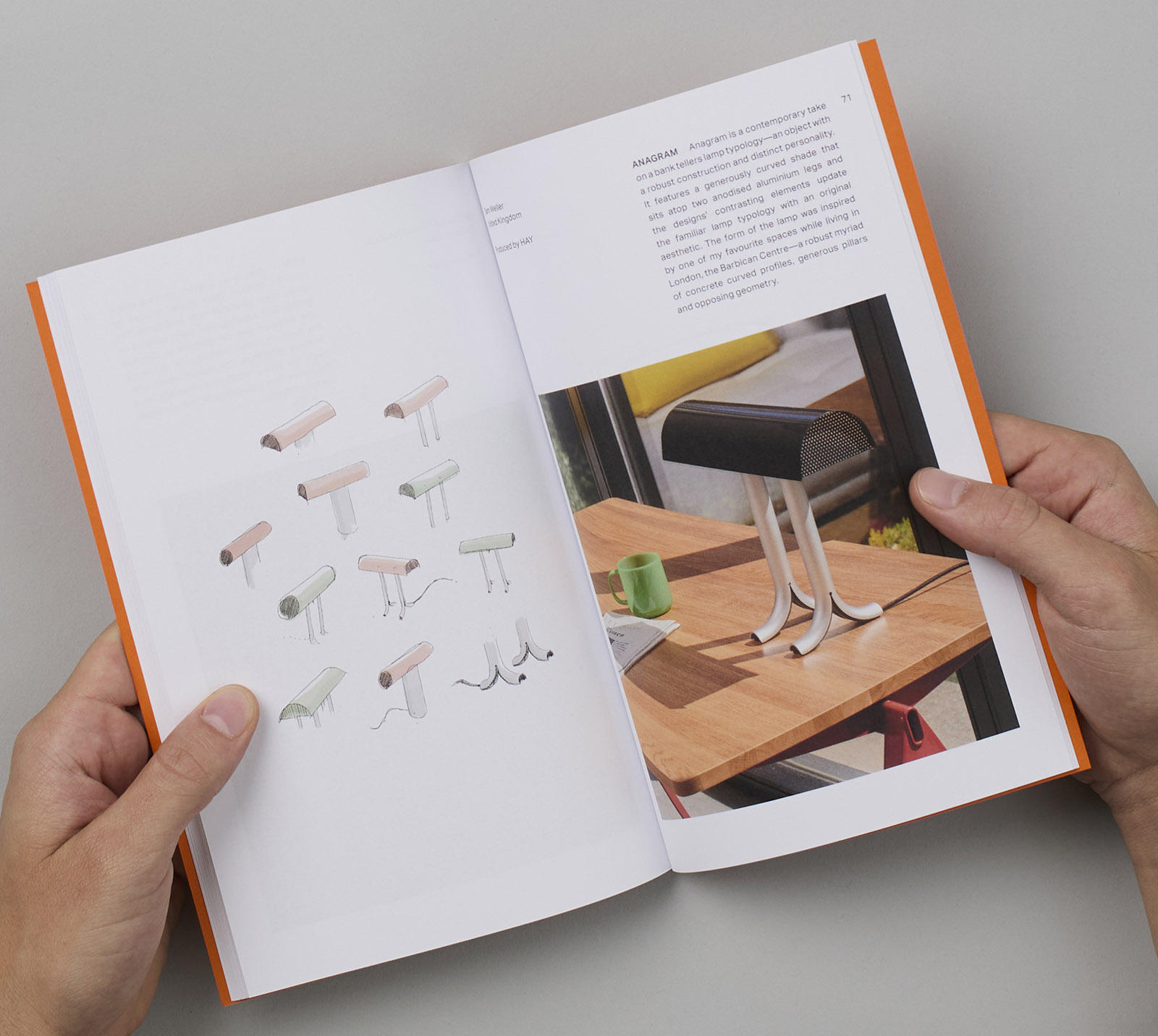 Weller contributes more than the foreword; his lamp, Anagram, appears in the book as well. The sketch shows the beginnings of a curved shade supported by two upright legs, a form that recalls the robust geometries of London’s Barbican Centre, a place he often visited while living in the city. The Barbican’s heavy concrete arcs and intersecting planes emerge in the lamp not as imitation but as memory, like a softened echo of a place that shaped his eye.
