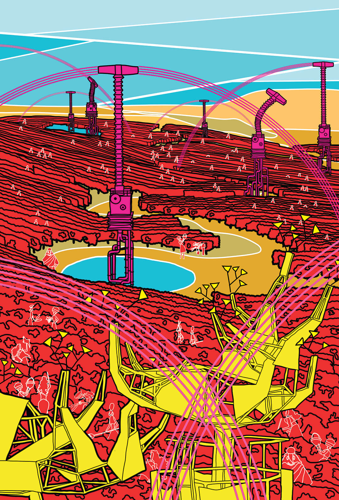 In a way, reading the book feels not unlike watching a dystopian setting, à la the reiteratively constructed but crumbling cityscapes of Inception or the neon-drenched ones in Ghost in the Shell, only annotated in exquisite, colourful ink. A capsule of visions, projections and what-could-have-beens; built environments not imagined to be particularly realised, but as particular tales of caution. Not a single plan or section appears; buildability is not the book’s concern, but possibilities sure are.