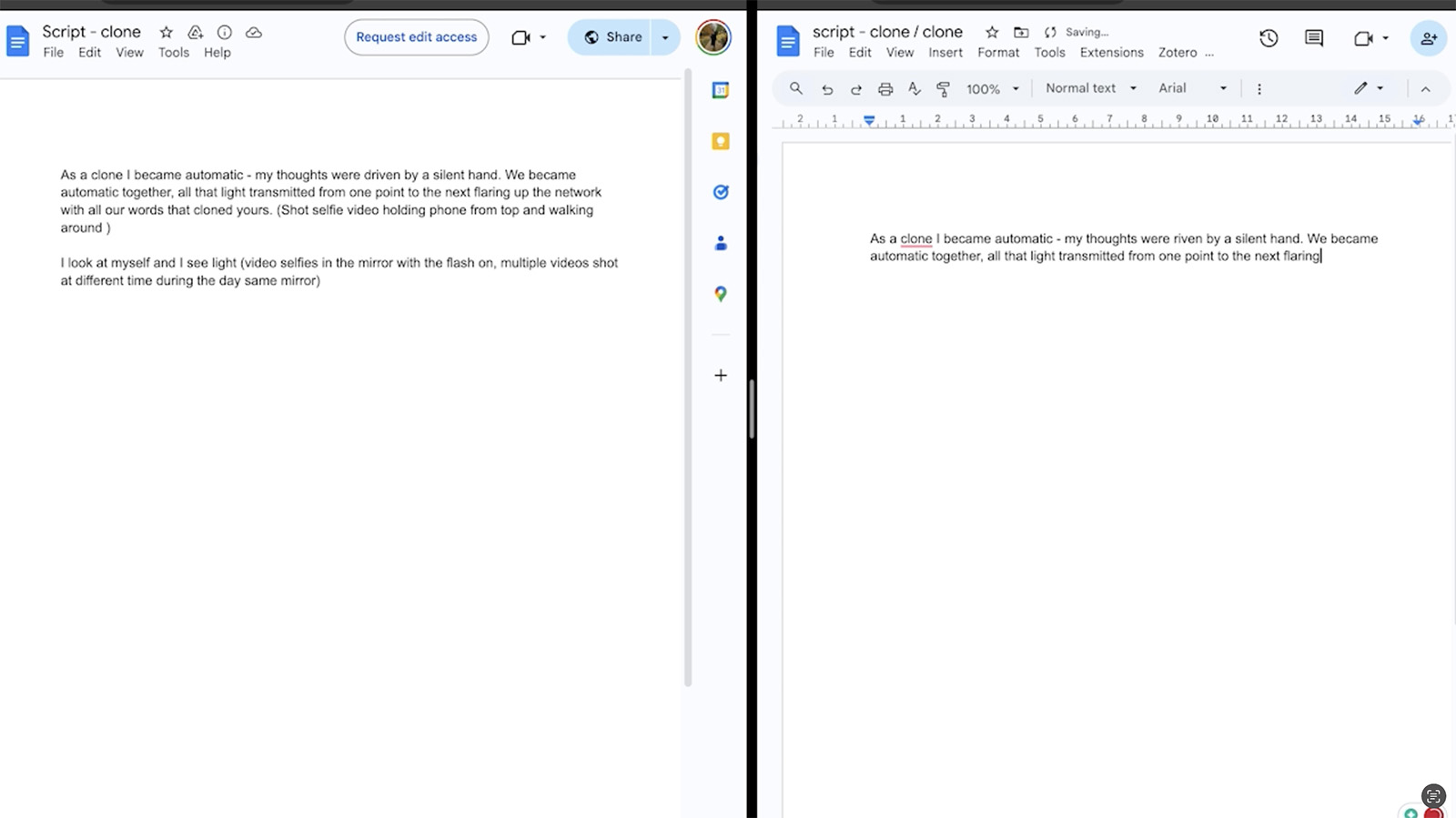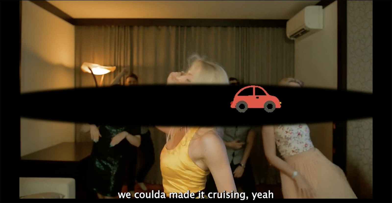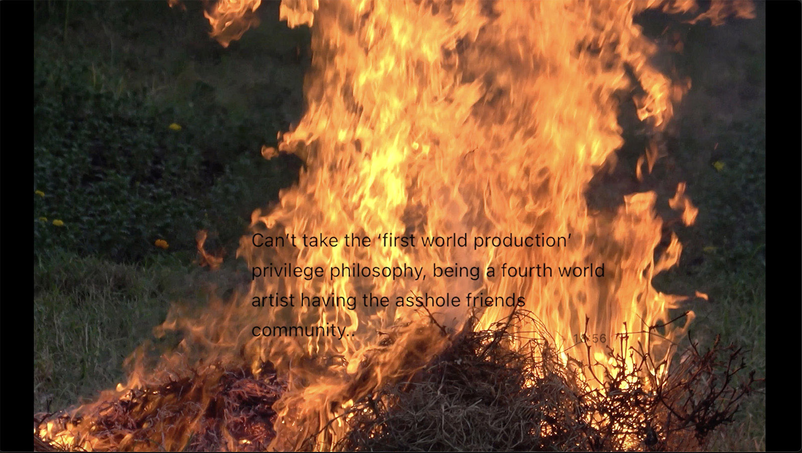 A letter from Arjun by artist Pritam Mitra relies on these techniques, cutting between and layering a mix of news clips, videos from everyday life and personal media like text messages and other digital correspondence, to move between the public and political and the individual and intimate. Similarly, in !My Body Is A Car, Lucy Rosablanca uses montage techniques to juxtapose human bodies, cropped and zoomed in, with cars and other vehicles, making an argument about alienation from the material and sensual entirely visually through editing and layering. The final statement of the film—“my body is a car, and it’s moving away from me”—wraps up the work’s argument rather than being the force of it.