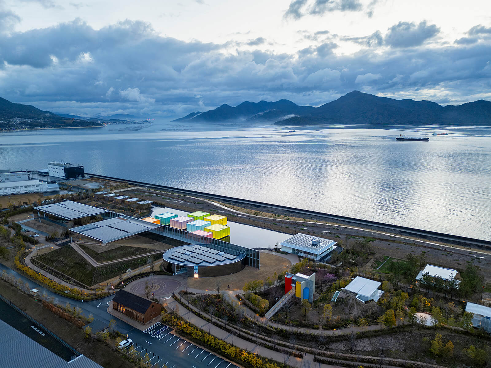 Secreted away behind carparks, low-rise homes and strip malls, a series of modular, pastel-hued cuboids sits, like connected islands, on a shallow pool. Next to it, the mirrored façades of an elliptical building and a 180-metre-long wall, running parallel to the shoreline, reflect the surrounding environs, from the silhouette of undulating hills to the steel blue waters of Hiroshima Bay. Within the oval structure that serves as the main entrance hall, floor-to-ceiling windows reinforce the impression of envelopment by nature, while Y-shaped columns, supporting a canopy of interlocking wooden beams overhead, evoke the presence of serene arboreal behemoths. The sublimely photogenic Simose Art Museum, designed by celebrated architect Shigeru Ban, opened in 2023 in the city of Otake, a coastal industrial centre in Hiroshima prefecture, Japan. It won in the ‘World’s Most Beautiful Museums’ category of the Prix Versailles the following year, where it was one of seven nominees for the prestigious architecture and design prize awarded at UNESCO.