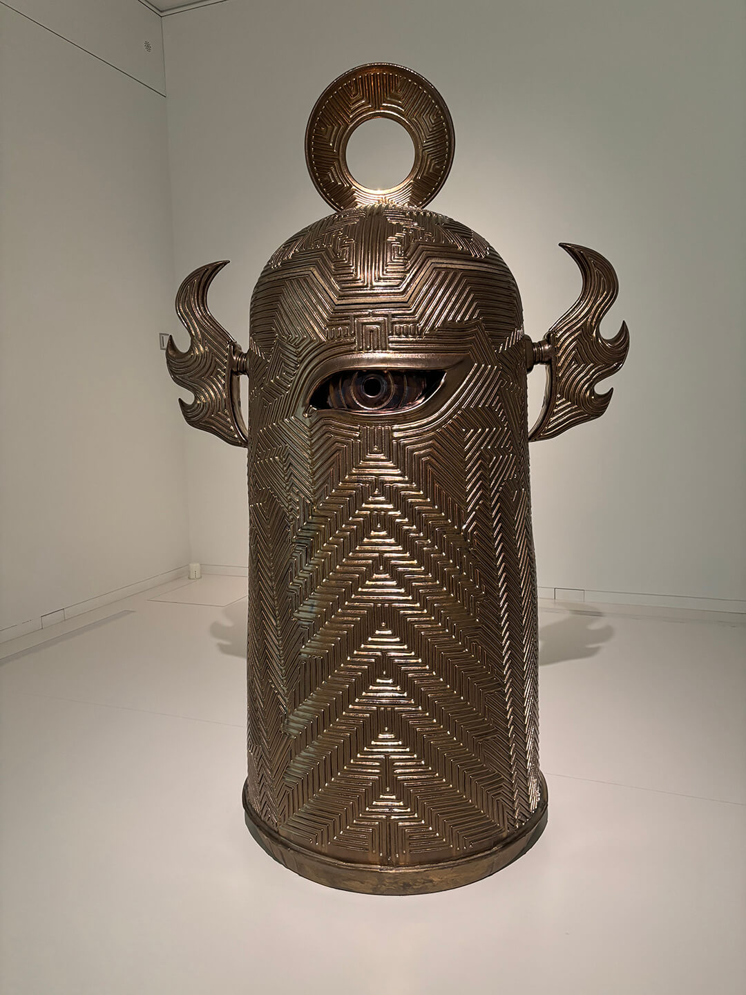 There are, finally, works by several artists that do not seem to find a comfortable fit within the exhibition’s curatorial logic, yet represent intriguing, playful visions. Of Japanese-Filipino parentage, born in Singapore and raised in Japan, Daichi Kukita’s paintings draw on images from art history, duplicating figures or motifs in a “software-like approach”. In Repetition_The Swing 02 (2025), elements of Jean-Honore Fragonard’s The Swing (around 1767–8) – the billowing gown of the female figure and the seat of her swing – are isolated, recreated, amplified and repeated, a pointed jab at the reproducibility and proliferation of images in contemporary visuality. Like Kukita, Kim Riyoo looks backwards for stimulus. He borrows from Japanese history the distinctive forms of Jomon pottery and Yayoi vessels for his sculptures, imbuing them with an uncanny sense of life – in the manner of Pokémon creatures, or yokai, supernatural beings that include monsters, goblins and imps. A portrait with the eye that stare into void (2023), for example, is based on the shape of dotaku, bronze ceremonial bells produced in the late Yayoi era (around 200 BCE – 200 CE), with the addition of an oculus that peers enigmatically back at the viewer.