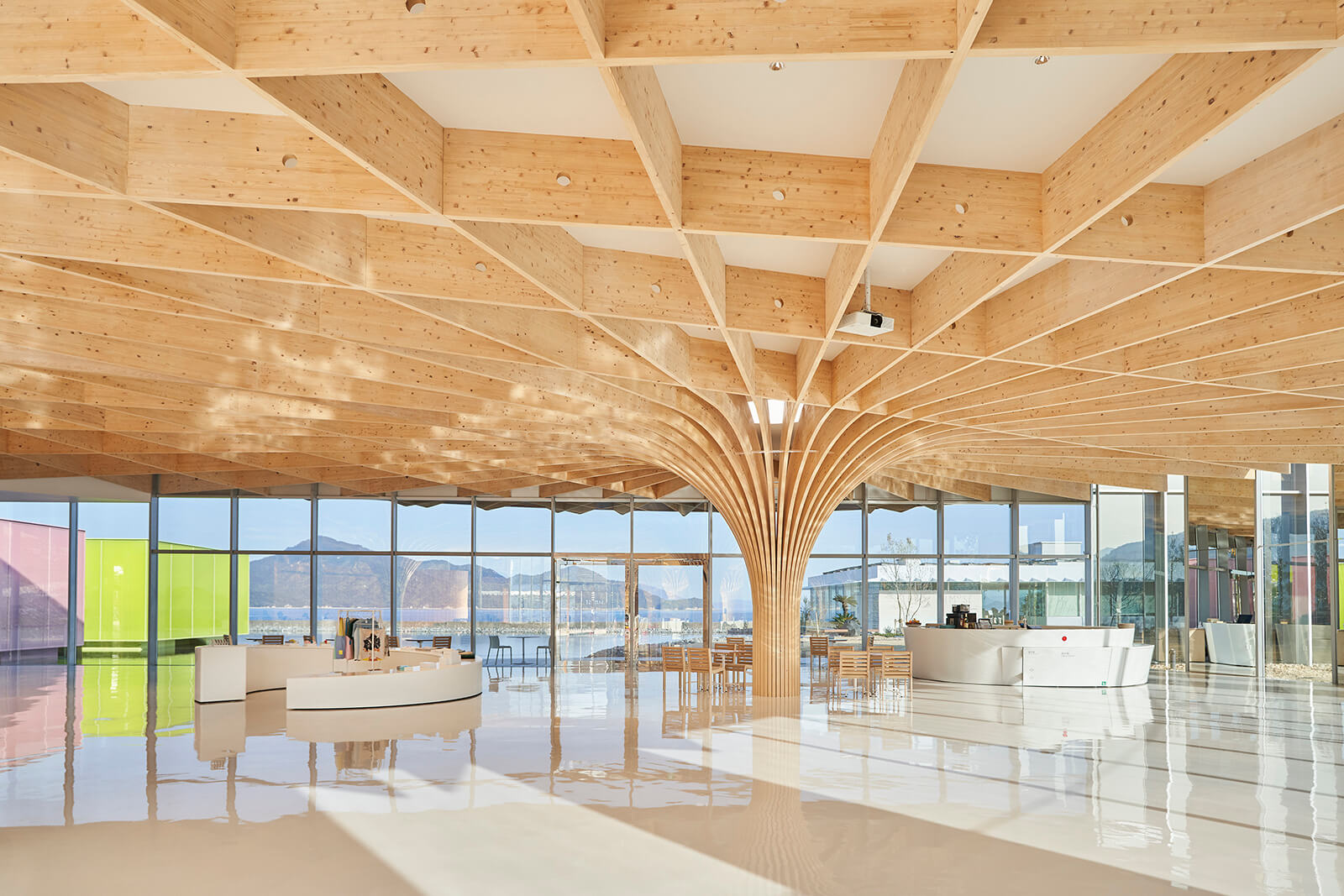 Founded by Yumiko Shimose, the president of Marui Sangyo Corporation, the Simose complex features several components: the entrance building, exhibition halls and an administrative section for the museum, as well as a number of villas, also designed by Ban, that are open to guests, and extensive gardens of seasonal flowers and plants.