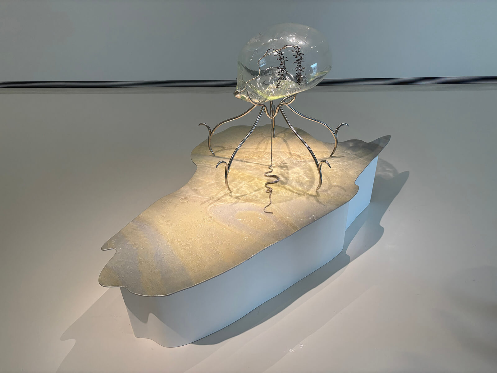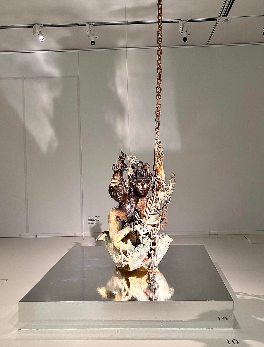 The exhibition also aims to engage “in dialogue with its surroundings”, with ‘surroundings’ broadly gesturing to widening spatial and geographic realms, from the museum’s campus, to its location across from Miyajima, or Shrine Island, a prominent cultural landmark and tourist destination in the bay, to the rest of Asia. Given its constellation of thematic strands, the show is at its most cogent when allowing connections to be drawn between the art and its immediate physical context. Soe Yu Nwe’s ceramic sculptures refer to the socio-politics of her native Myanmar, with The One Who Perceives the Sounds of the World “Kannon x Naga Maedaw, Shigaraki” (2025) amalgamating the titular deities – the bodhisattva Kannon, or Guanyin and the Burmese goddess of dragons, Naga Maedaw – in a gesture of transformation. Its chained state recalls an old rumour in Yangon behind the handcuffing of the icons of a nat (spirit), Mya Nan Nwe, who is said to have appeared in a nightmare to the former dictator, Than Shwe, following which he ordered her statues to be restrained to preempt paranormal mischief. The mirrored pedestals that the sculptures rest on highlight their almost grotesque exquisiteness and suggest, at the same time, the prevalence of watery and mirrored surfaces around Simose. Omyo Cho’s Nudi hallucination works (both 2022) are fabricated from industrial materials such as stainless steel, silver and glass, their biomorphic, delicately shaped forms alluding to the natural world around the museum and the interplay between the synthetic and organic.