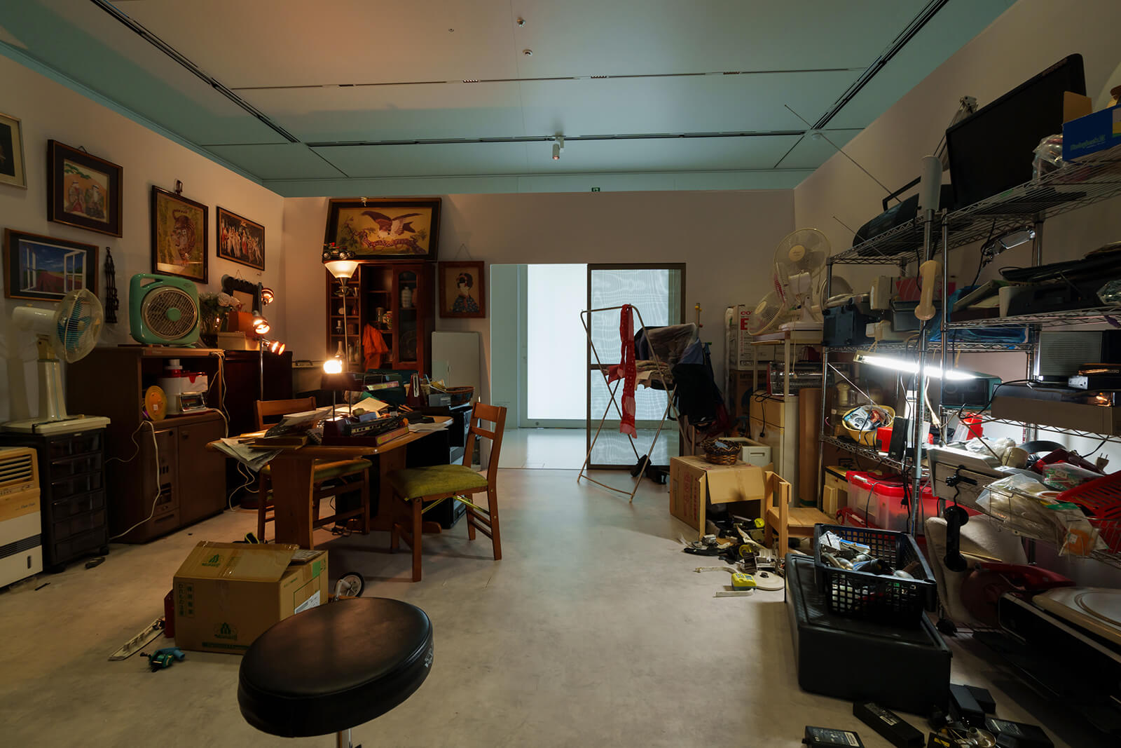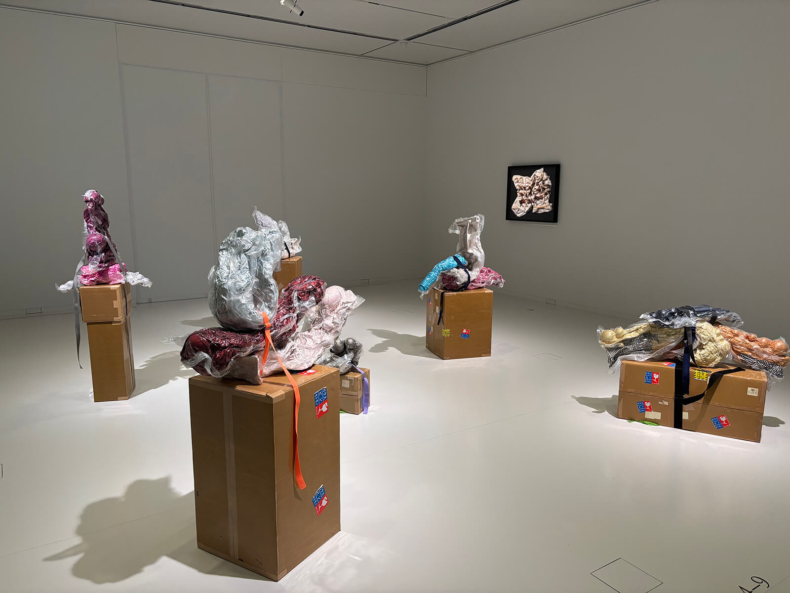 This industry-driven, consumer-oriented reality seems to provide an unspoken subtext to other works in the exhibition. Sou Suzuki, an artist who started in fashion and stage costuming, translates his body-oriented designs into sculptural entities that, according to the work's description, “resist binary oppositions – between figuration and abstraction, nature and the human”. His Untitled (Non-homogeneous arrangement) series (2017–21) consists of a suite of discarded objects, often textiles, trapped in vacuum-sealed compression bags, their contorted shapes seeming anthropomorphically abject. Here, these pieces are shown with the cardboard boxes they arrived in, postage stickers and stamps left intact. Tianyi Zheng’s My Shadow on Your Dust (2025), which conjures up a microcosmos of second-hand objects, consists of an installation of discarded and recycled detritus animated with light and sound by automation systems; an immersive installation that meticulously duplicates the interior of a Hiroshima recycling shop. The leftovers of mass consumerism in Suzuki’s and Zheng’s works function as reminders of the city that lies beyond the confines of the museum, forlorn fragments of capitalist, urban lifeworlds.